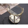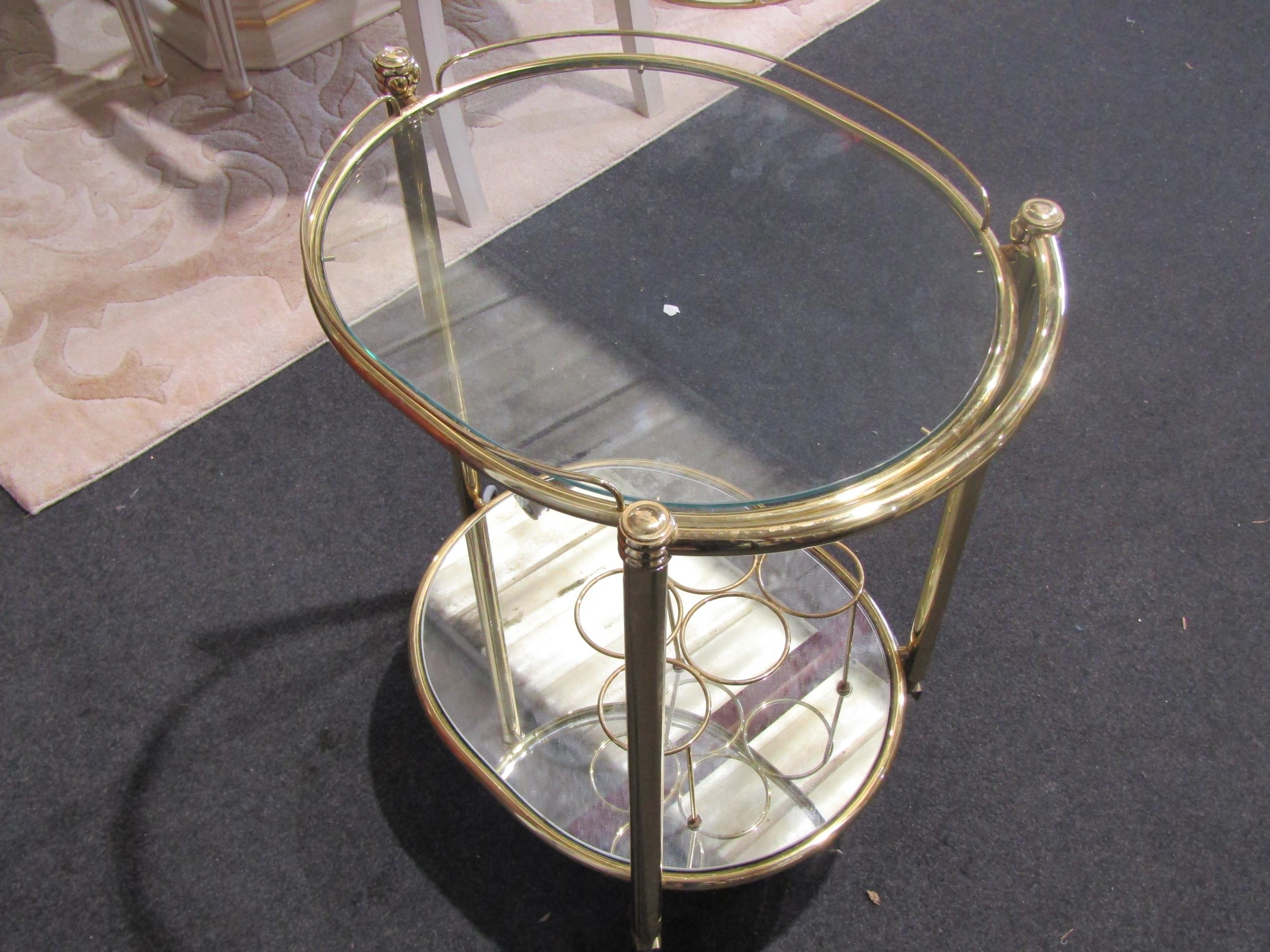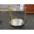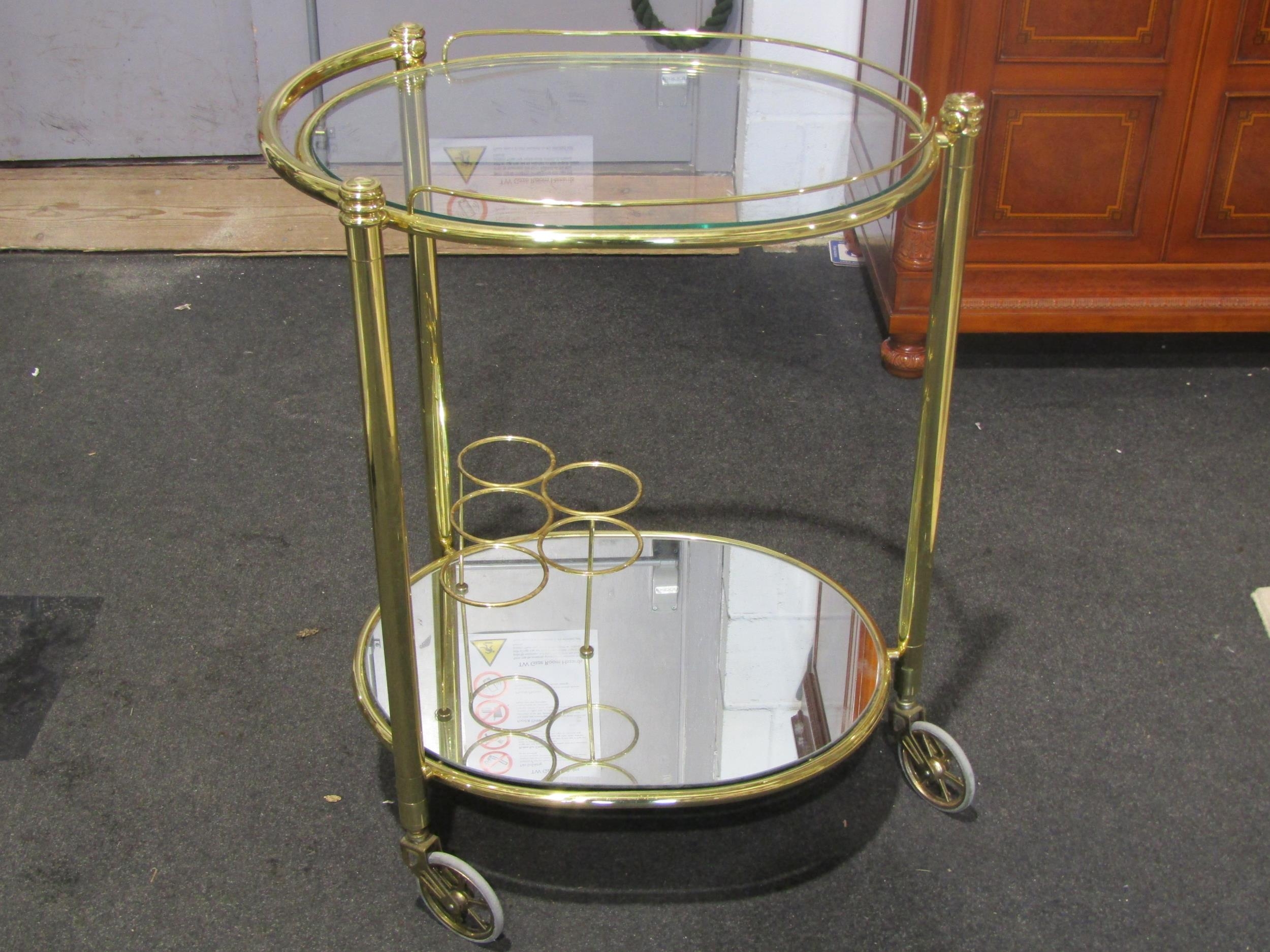 A brass framed two-tier tea trolley, glass top and mirrored under-tier