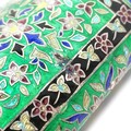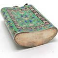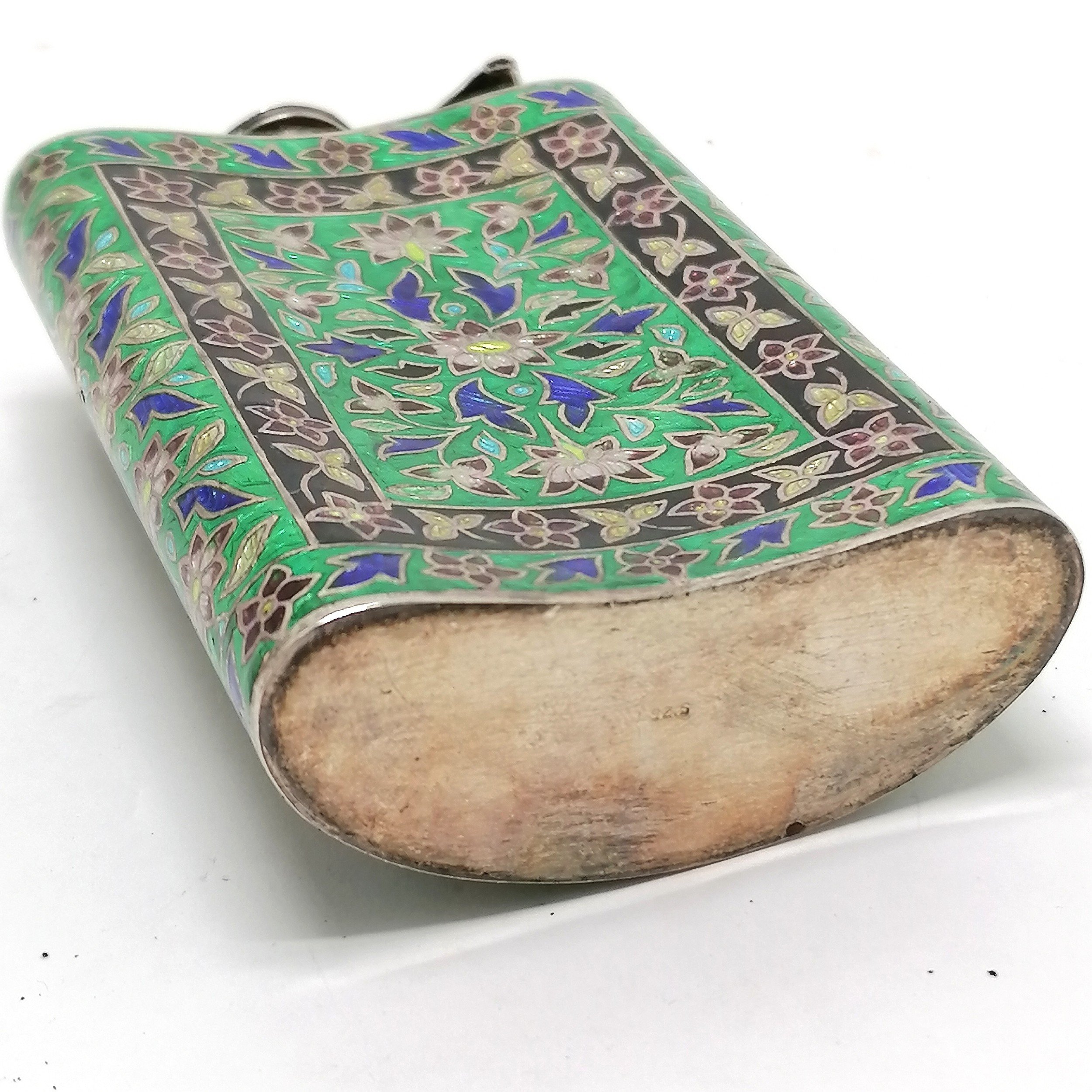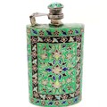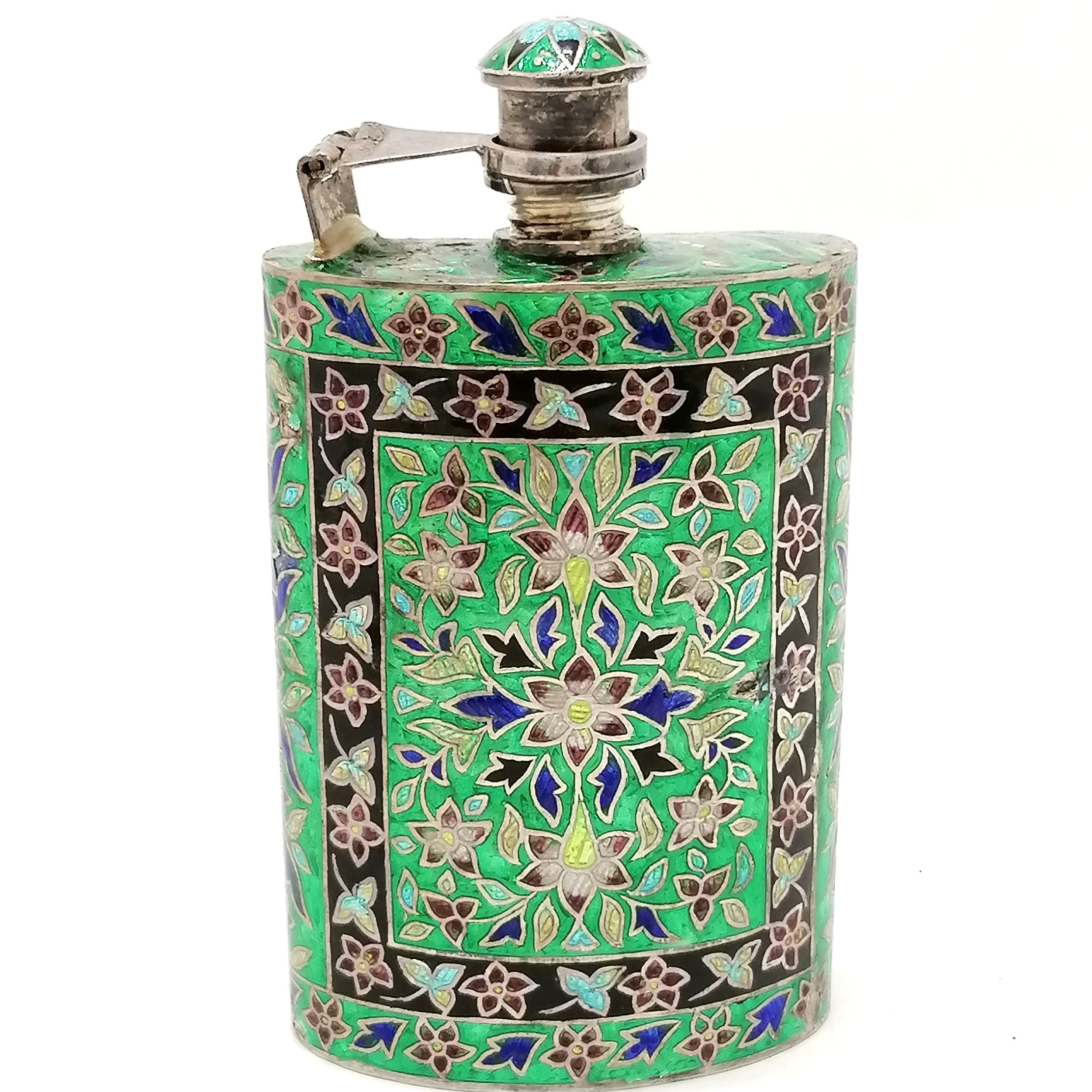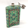 925 marked silver flask with green enamel decoration 11cm high x 6cm- 1 small dent to the body otherwise in good used condition