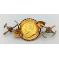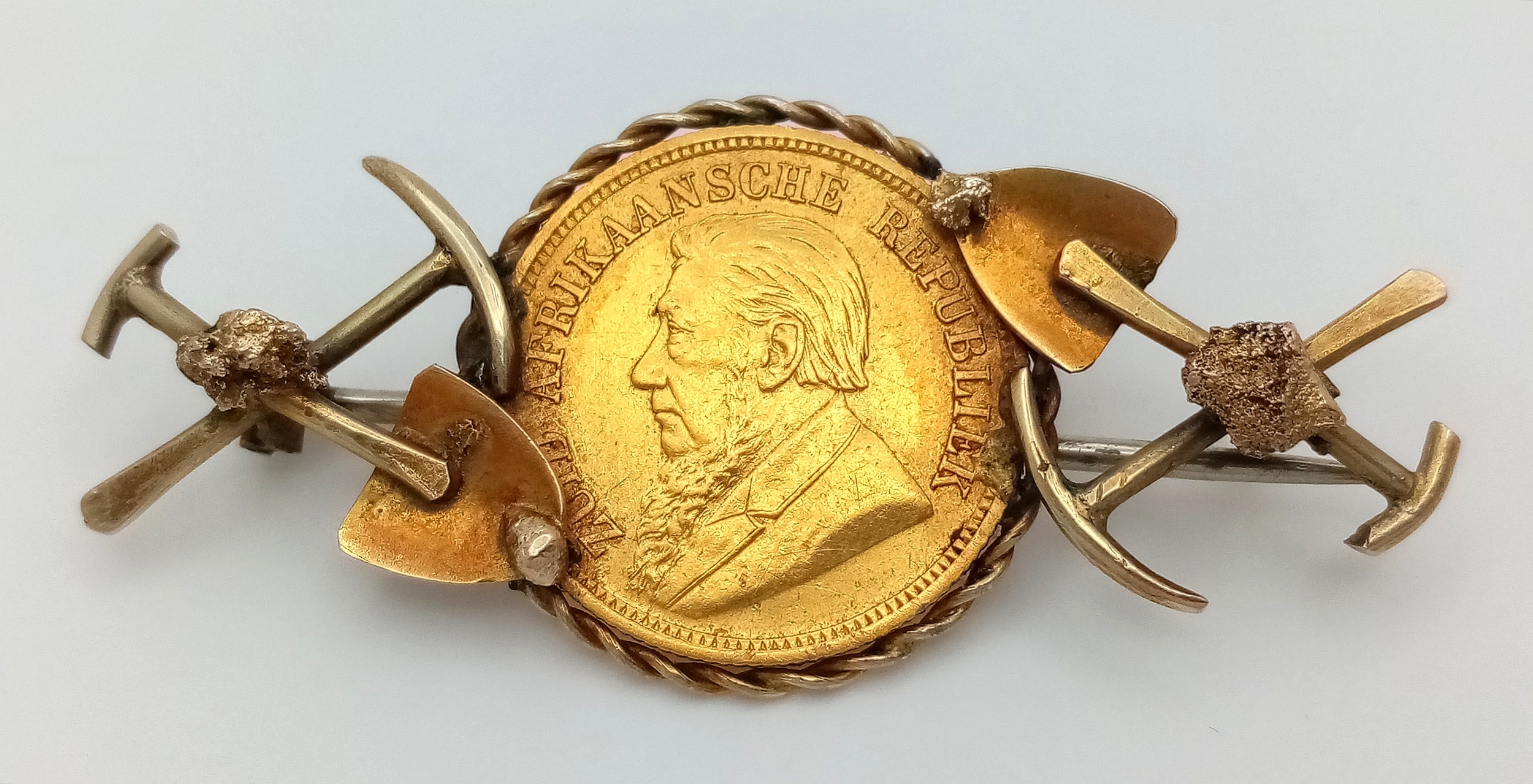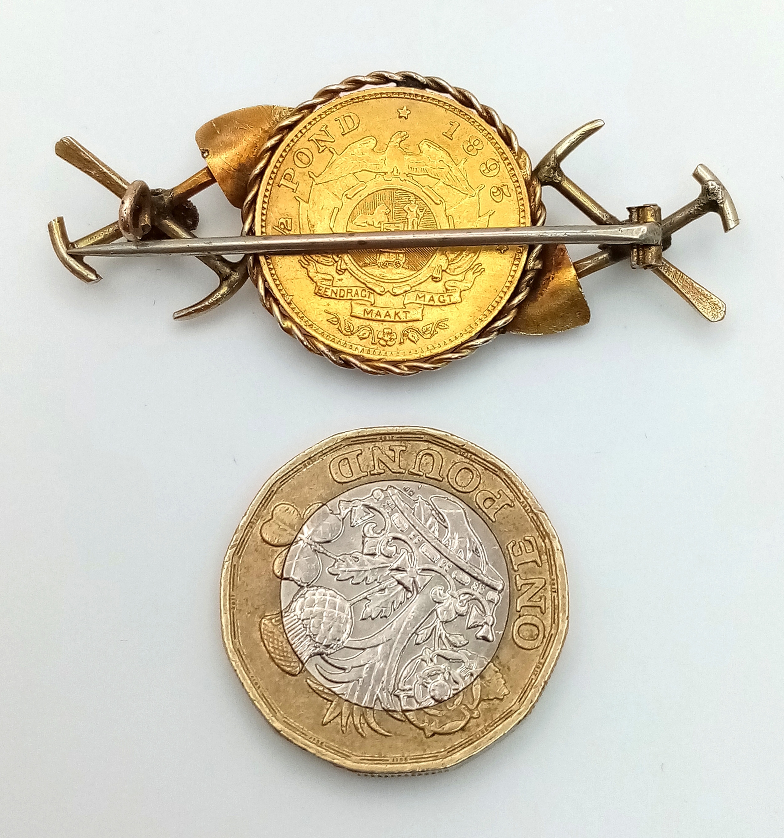 An 1895 South African 1/2 Pond Gold Coin Brooch. Decorated with mining motifs. 22k gold coin. 9K setting. 6.87g total weight. Pin has been replaced. 5cm.