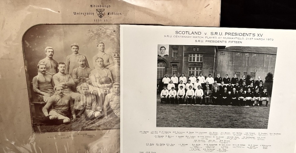 1988-9 and 1973 pair of Scottish Rugby Interest Photos (2): Huge, c.20” x 15”, nibbled and some fading to this very early mounted, titled and captioned Edinburgh University Rugby Team from nearly 140 years ago: a great evocative image; plus a thickly mounted reproduction, well titled and captioned, 16.5” x 12.5”, of the teams in the Scotland v SRU President’s XV Centenary game at Murrayfield in 1973. Some superb players involved. Excellent