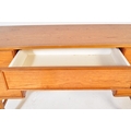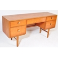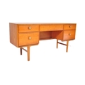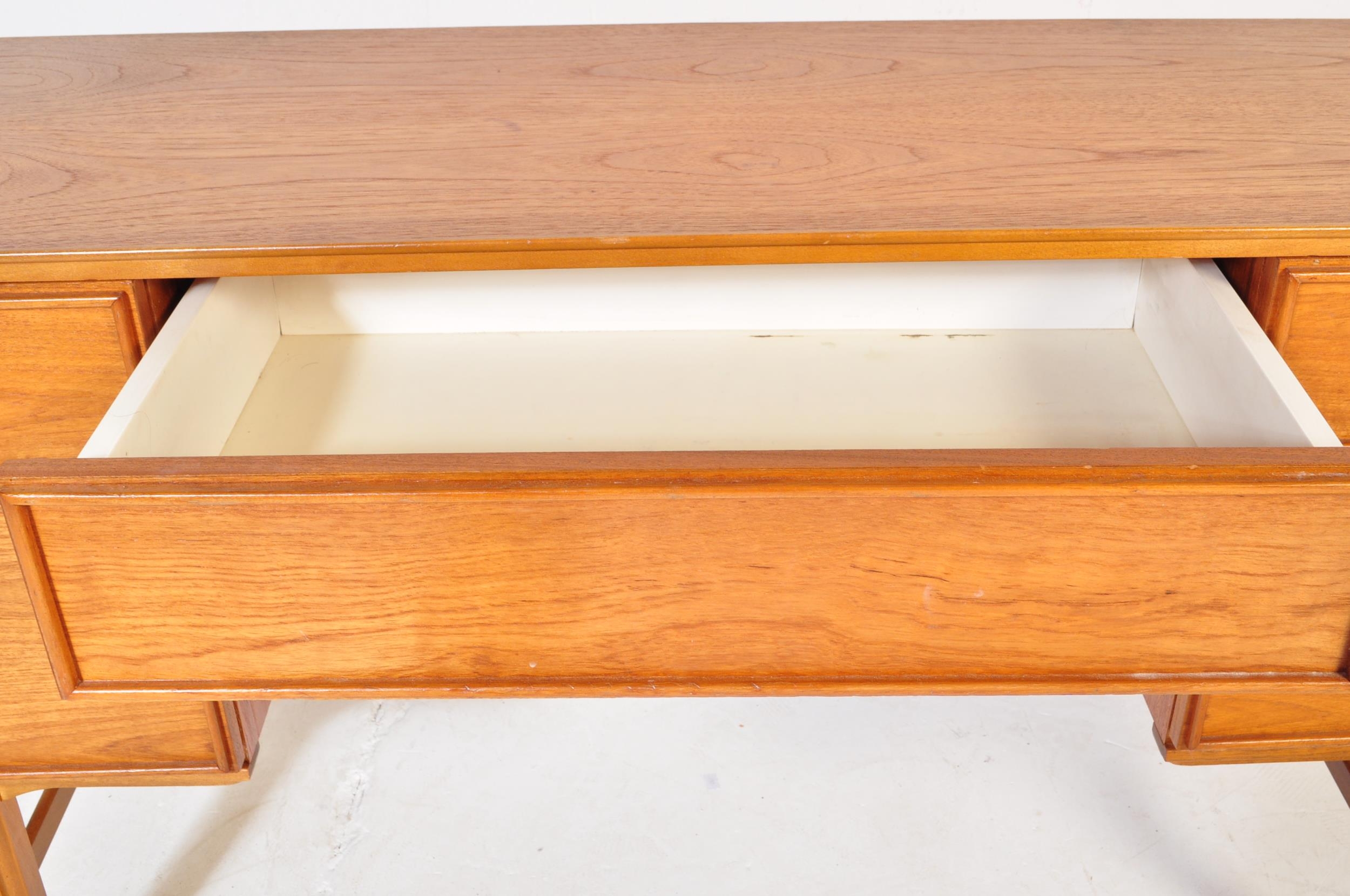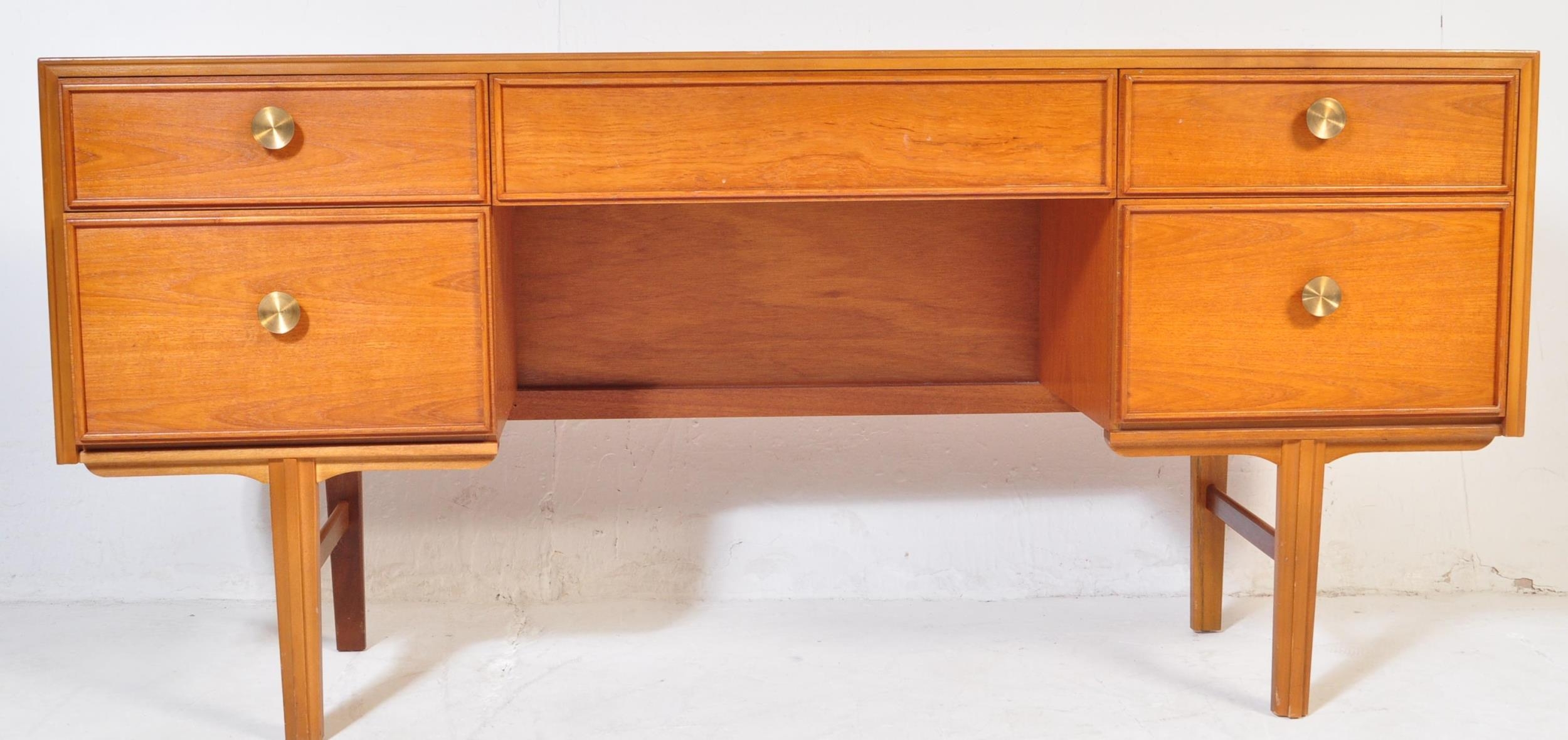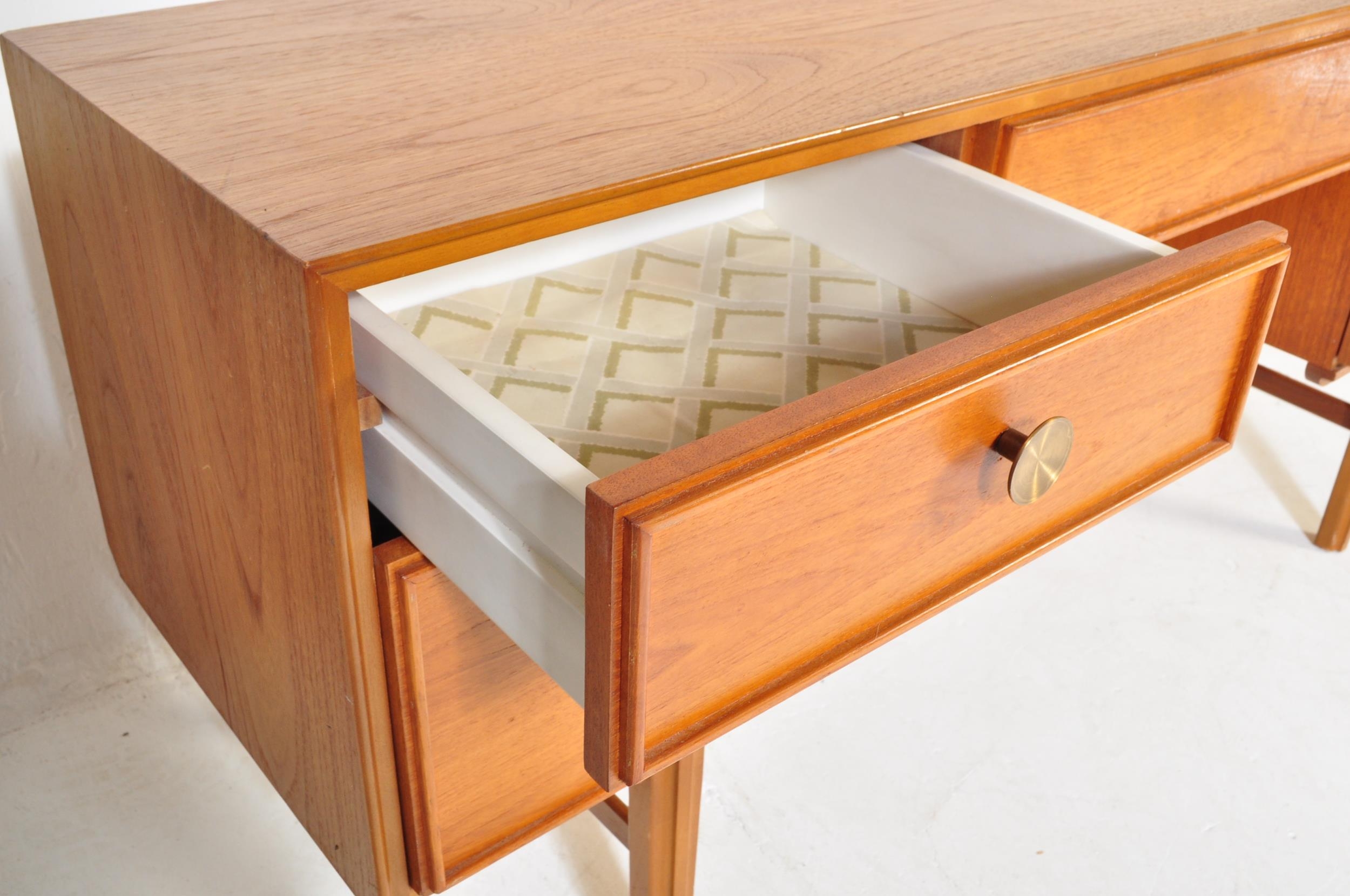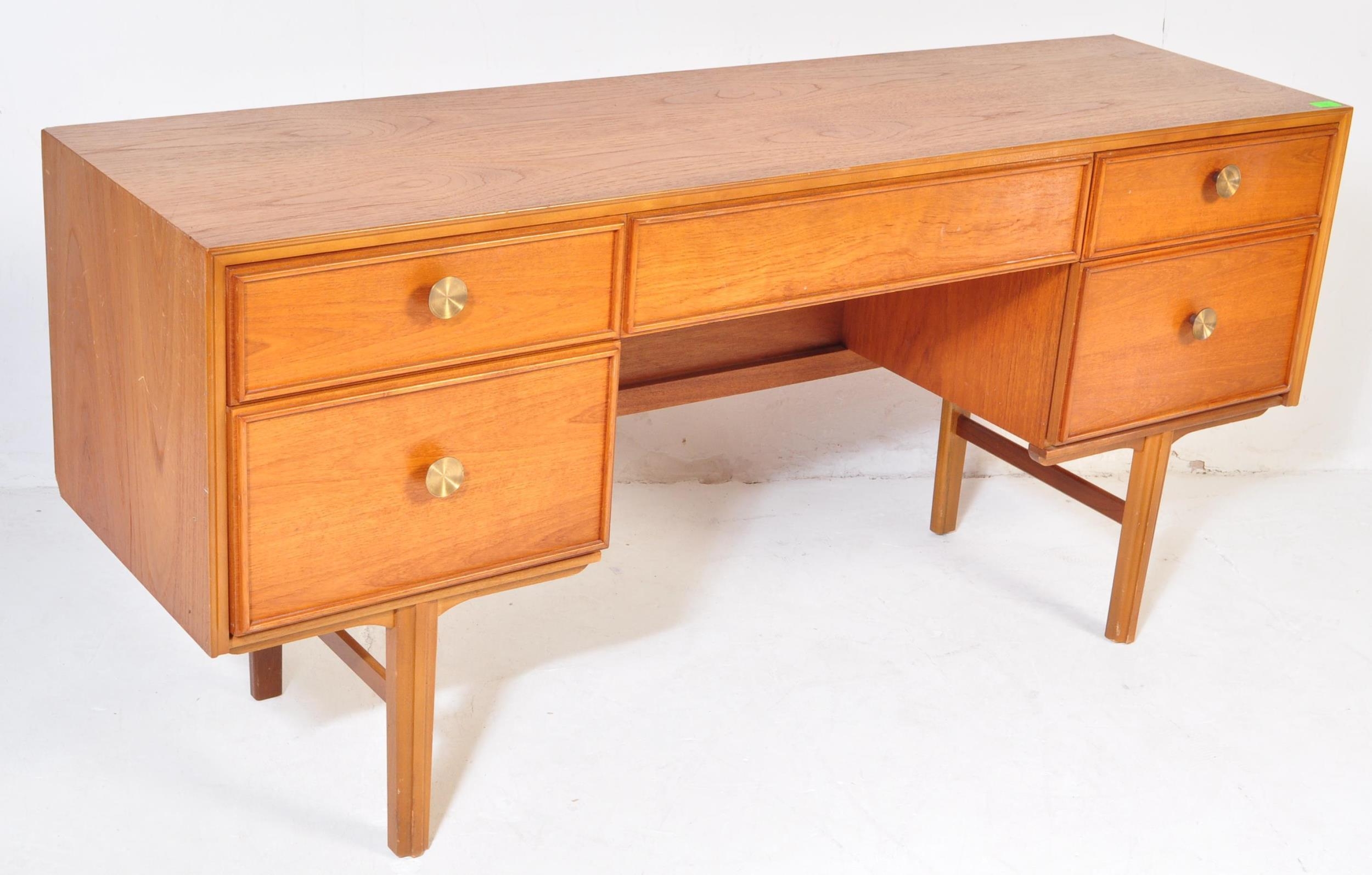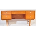A retro vintage mid 20th Century teak wood dressing table. Of rectangular form with single secret drawer to middle flanked by two tapering drawers with metal circular pulls all supported on square supports with stretchers. Measures approx; 70cm x 150cm x 43cm.