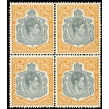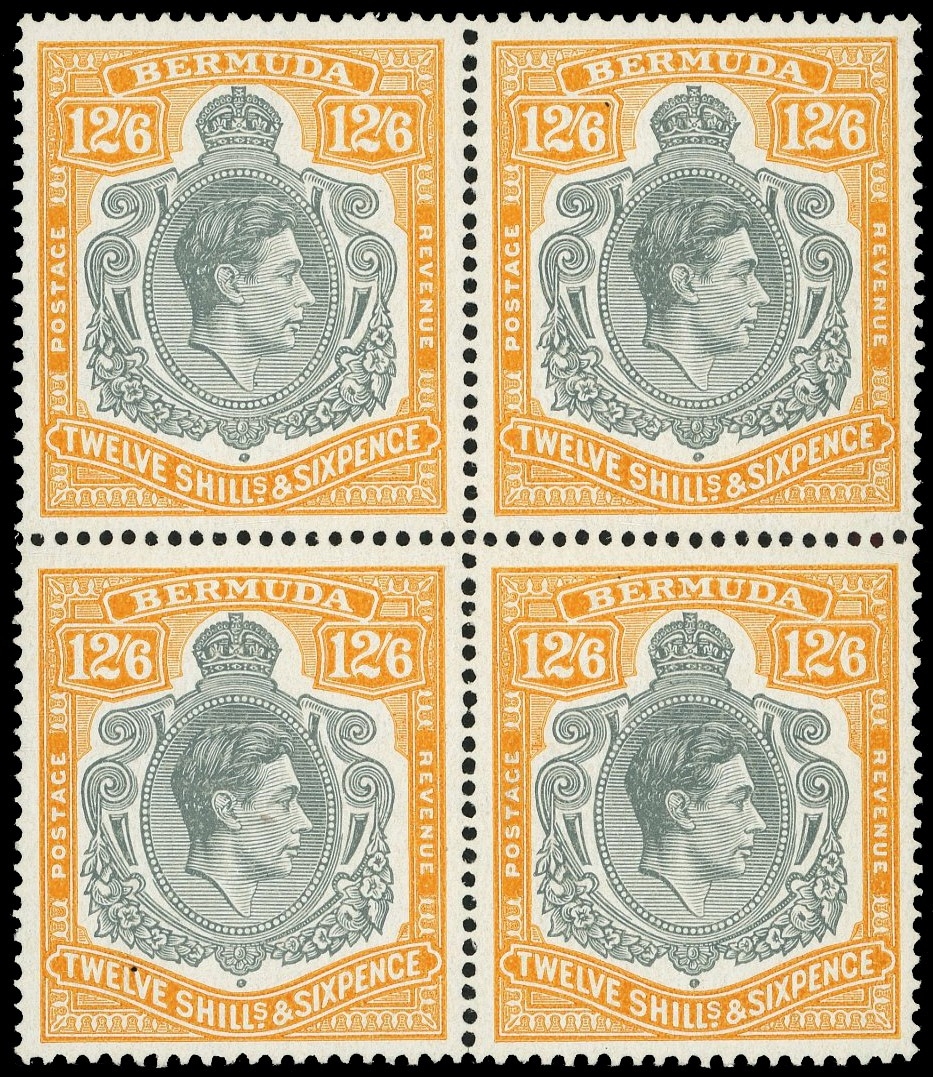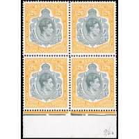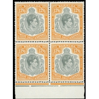 1943 (March) 12/6d pale bluish grey and orange-yellow block of four, #s 11-24 with HPFs #11a, 12a, and c (the latter only found on this printing).  Unmounted o.g., the lower left stamp with pencil notes on reverse (ex Ulrich).  SG 120c, £