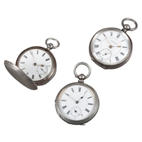 with keyless wind movement, white enamel dial, subsidiary seconds dial, black Roman numerals, dark blue steel hands, case diameter approx. 45mm, on a silver hallmark pocket watch chain; together with another silver hallmark pocket watch with silver pocket watch chain (2)