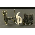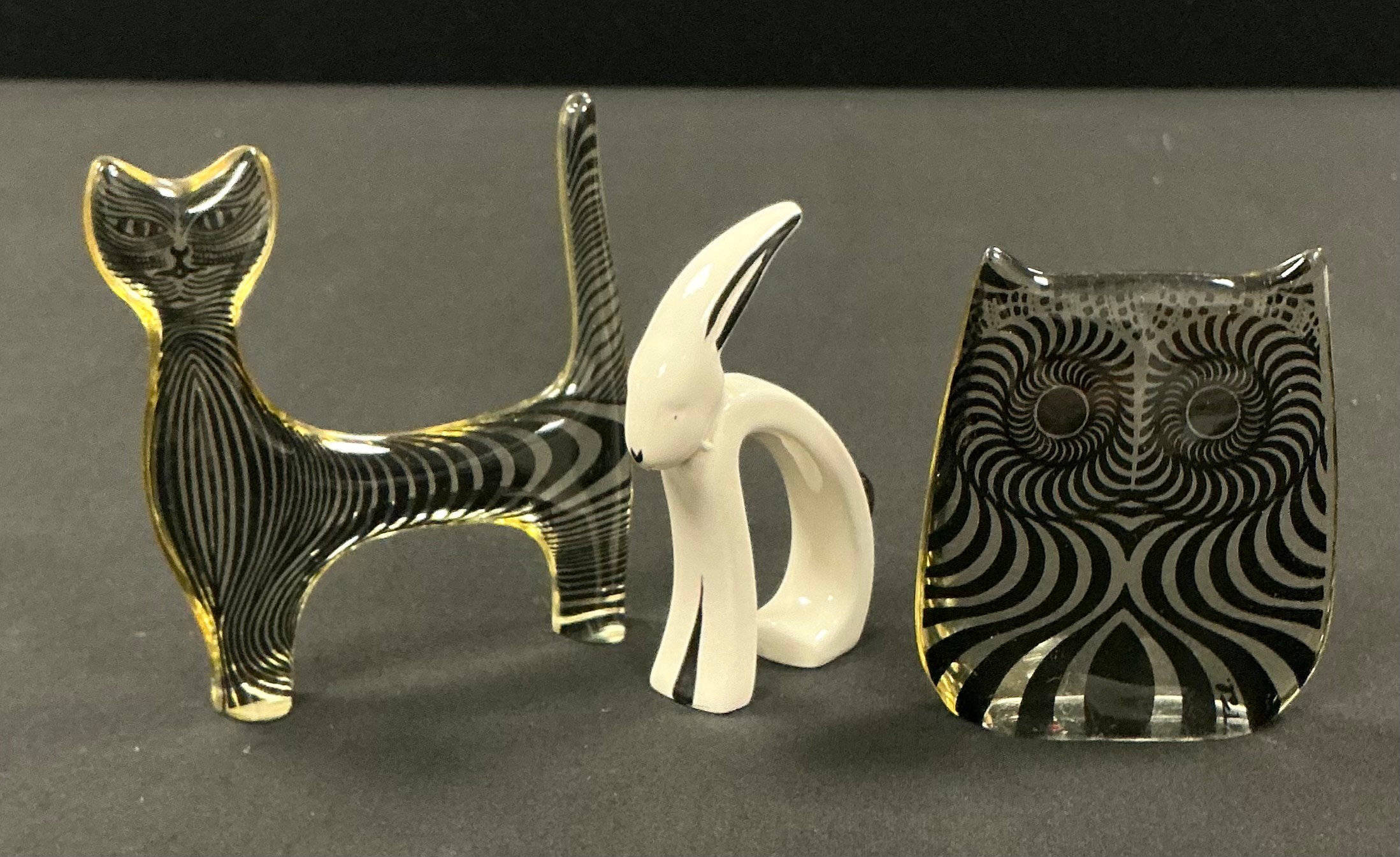 Abraham Palatnik (1928-2020), a Lucite model of a monochrome owl, 7.5cm, traces of original label; another of a cat, 9cm high, original "Made In Brazil" paper label, c.1970; a mid-20th century ceramic monochrome model of a stylised rabbit, 8cm (3)