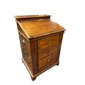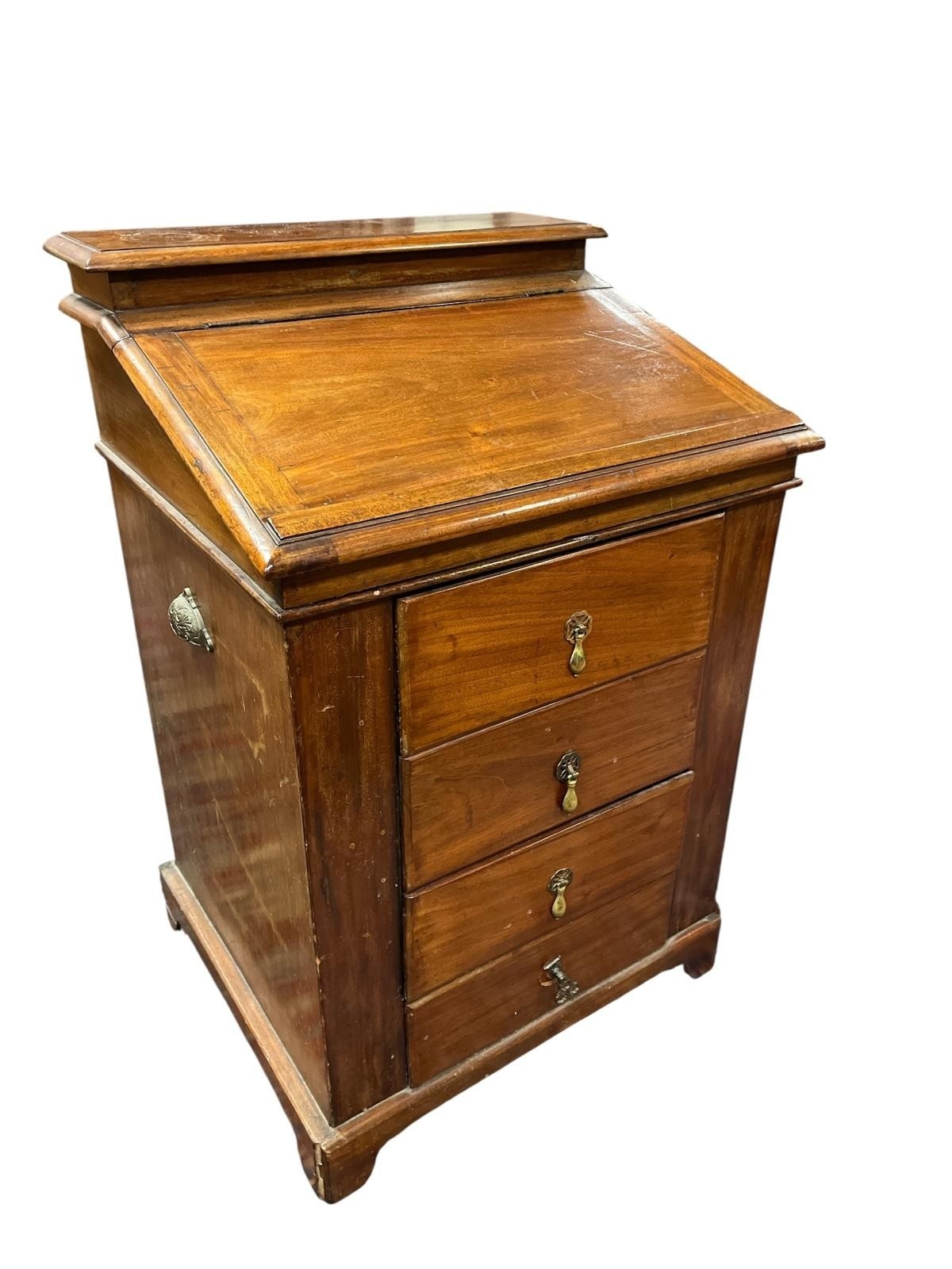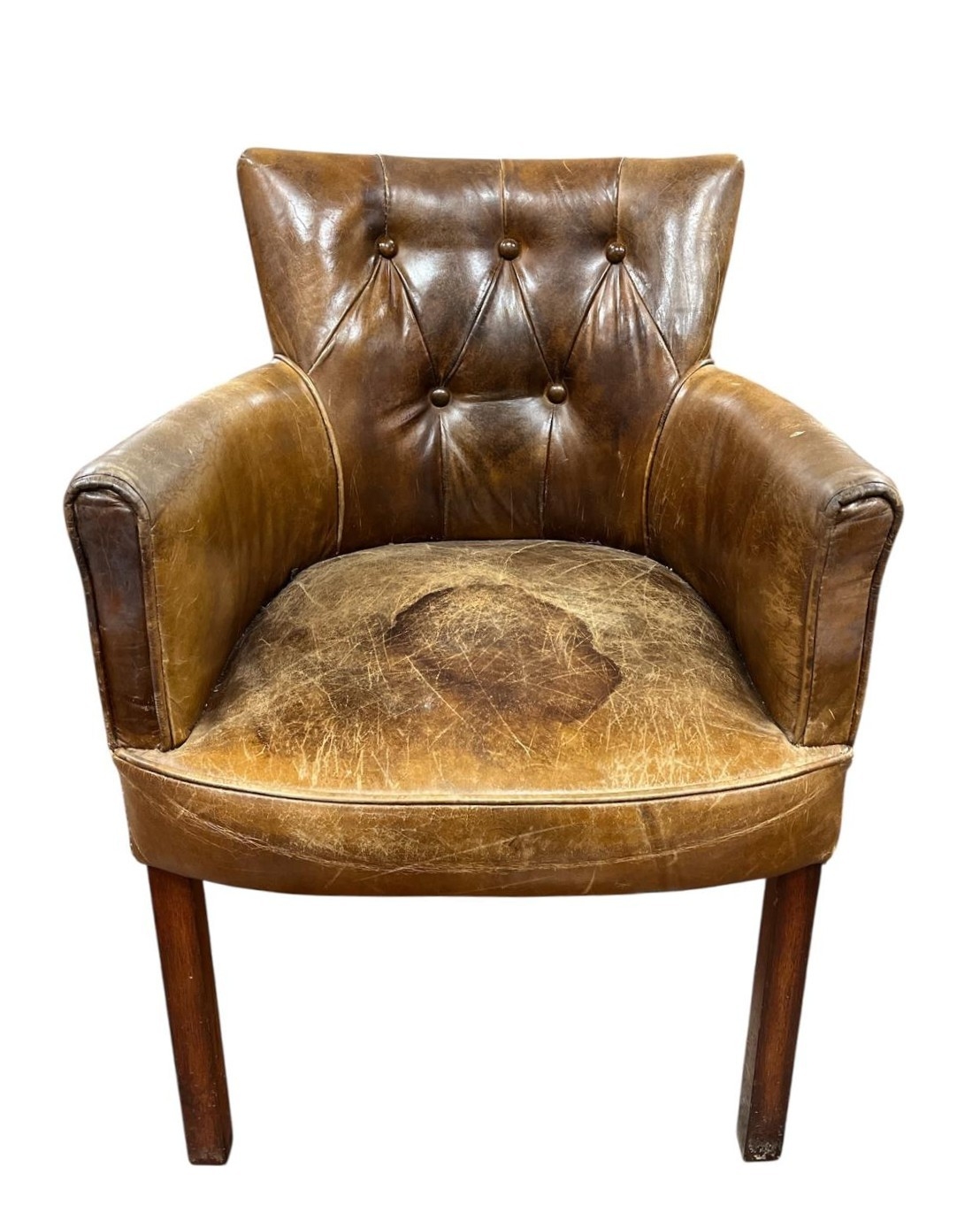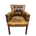 A VINTAGE HIDE UPHOLSTERED ELBOW CHAIR with deep buttoned upholstered back and seat on square moulded legs, A 19TH CENTURY MAHOGANY SLOPE FRONT CLERK'S DESK the hinged superstructure above three long drawers on bracket feet (AF) 94cm (h) x 62cm (w) x 54cm (d)