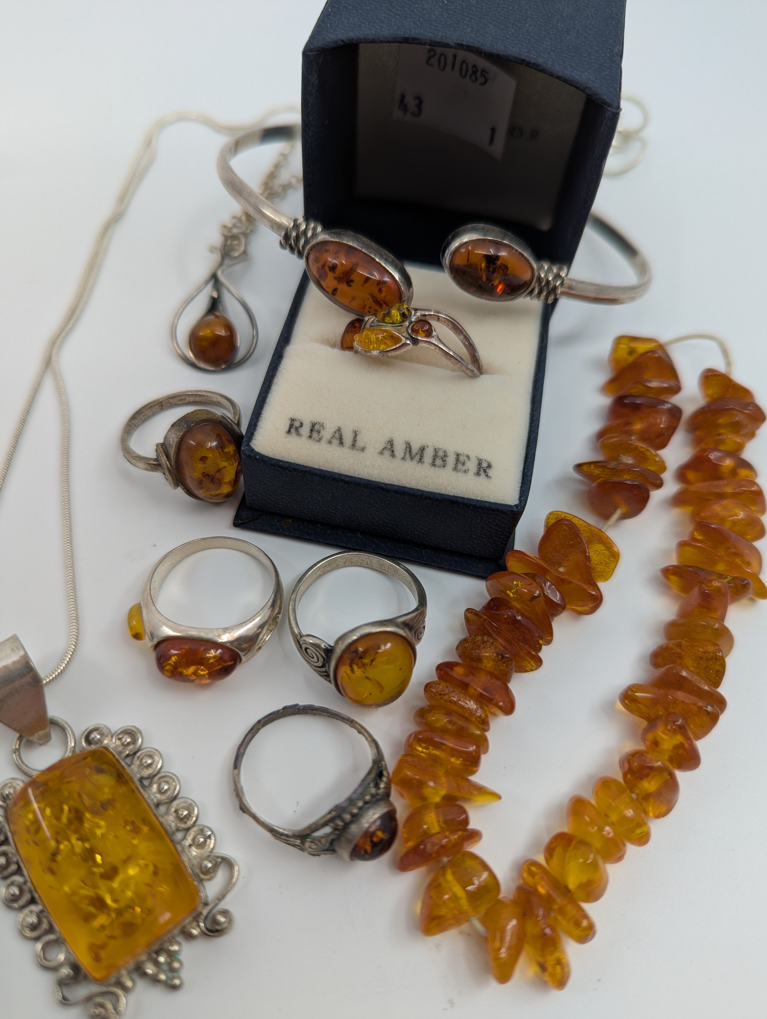 One of the rings is missing a cabochon amber, the cabochon amber set torque bangle is misshapen and the tumbled amber stone stringed bracelet is loose and may be missing amber stones