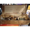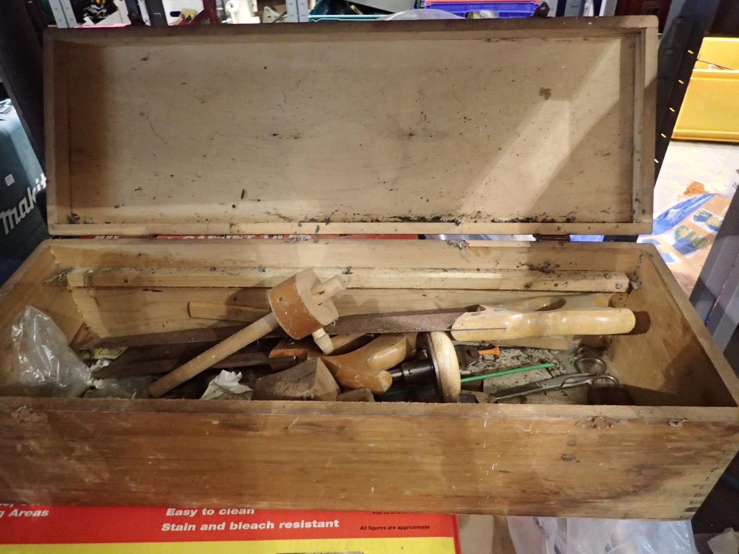 Quantity of vintage hand tools in wooden tool box to include saws etc. Not available for in-house P&P, contact Paul O'Hea at Mailboxes on 01925 659133