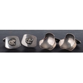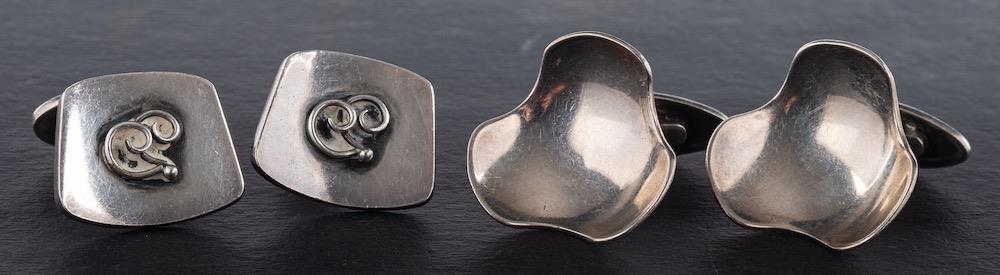 Two pairs of Modernist cufflinks, including a pair of trefoil, concave form, stamped 'DENMARK', with maker's mark 'PJ' and a second with maker's mark 'WKR', length of cufflink head ca. 2-2.4cm total weight ca. 29.3gms.