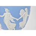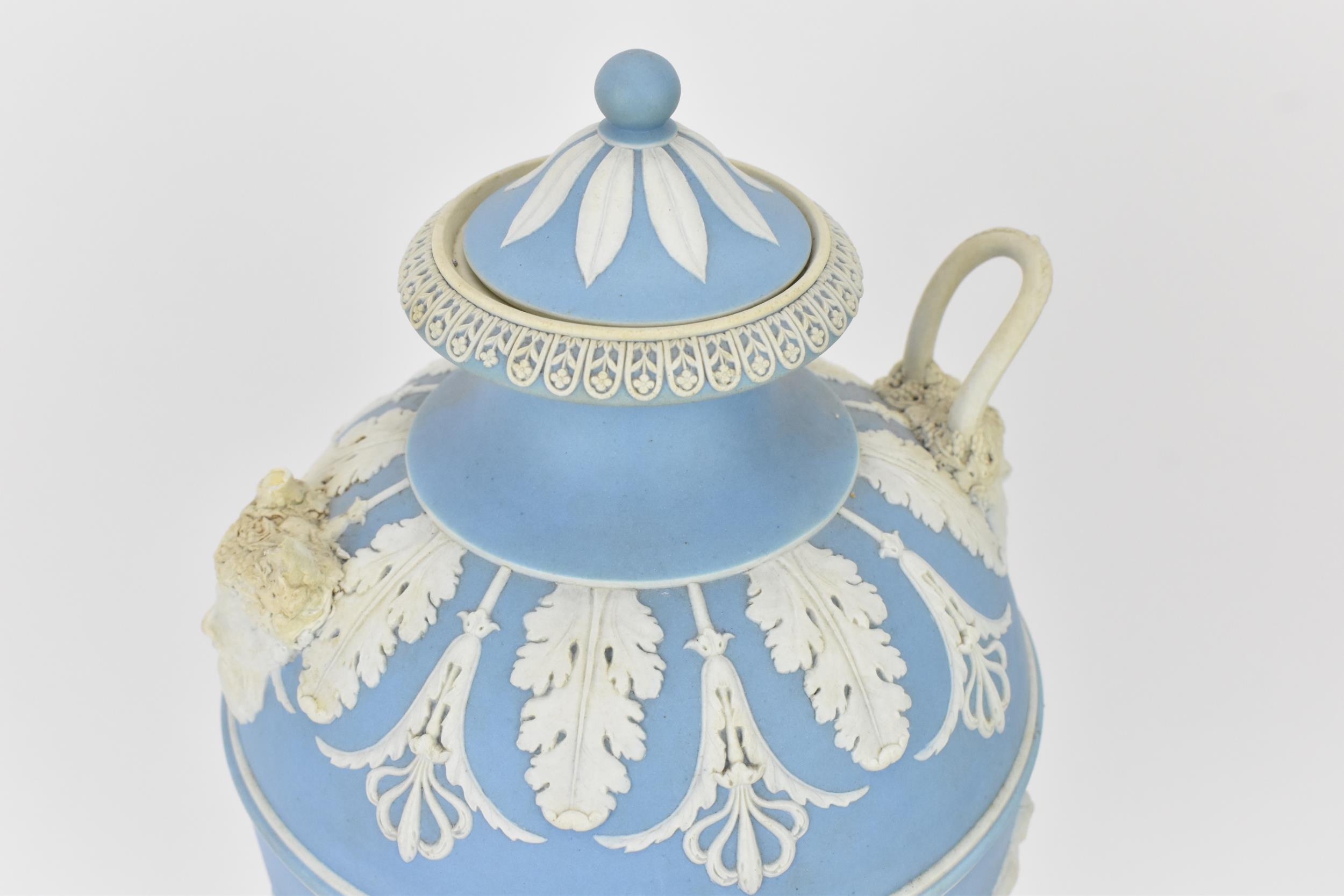A large Wedgwood blue jasperware lidded urn in the 'Dancing Hours design', the Classical maidens dancing in relief around the body, the handles with Bacchus masks, on a square platform base with acanthus leaf tip and anthemion detail, the underside with impressed mark, 40 cm high, a/f
