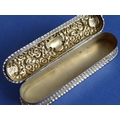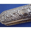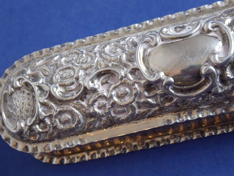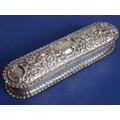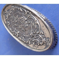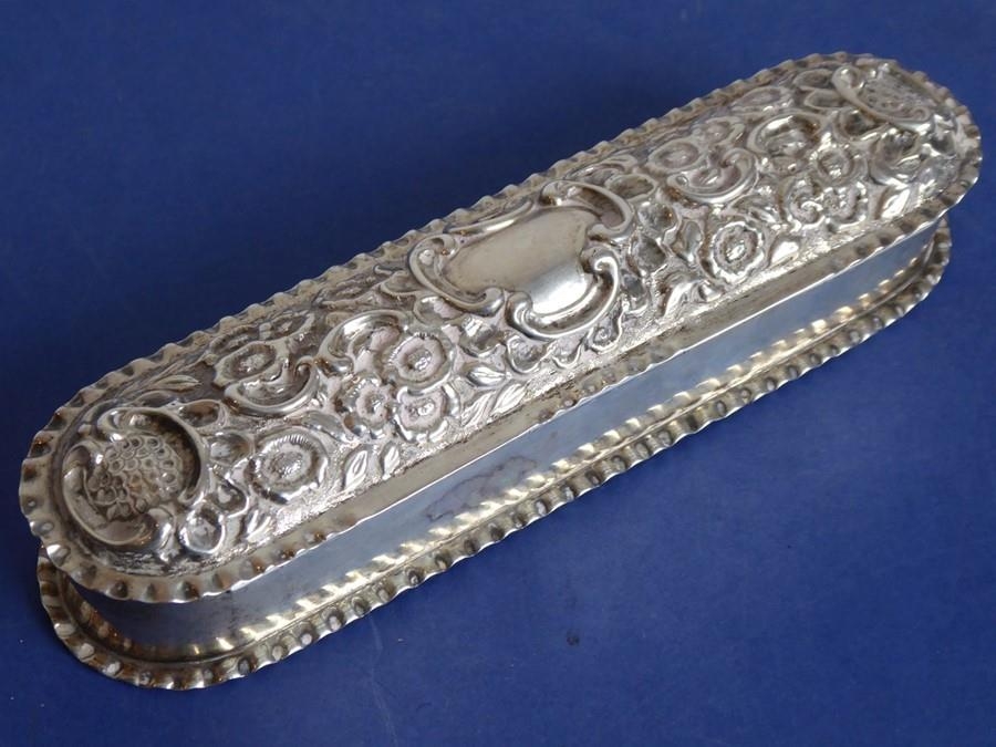 A hallmarked silver oval-shaped box with hinged lid having a vacant cartouche and decorated in high relief repousse style with C-scrolls, flower heads etc., marks rubbed, probably Chester 1901 (16cm, approx. 109g)