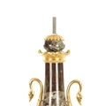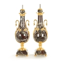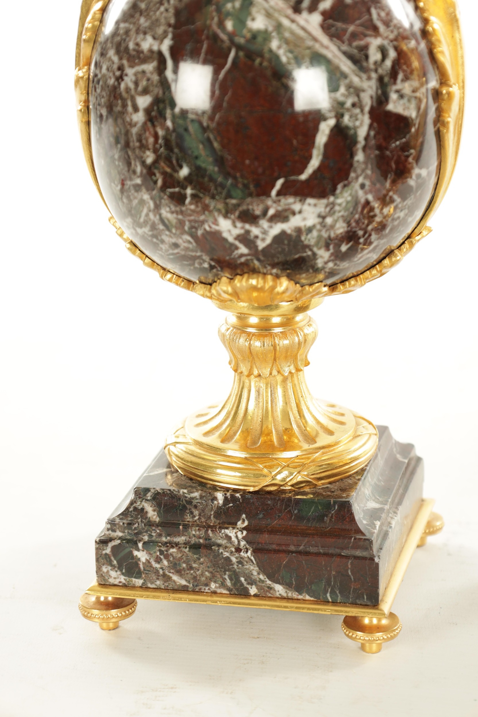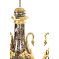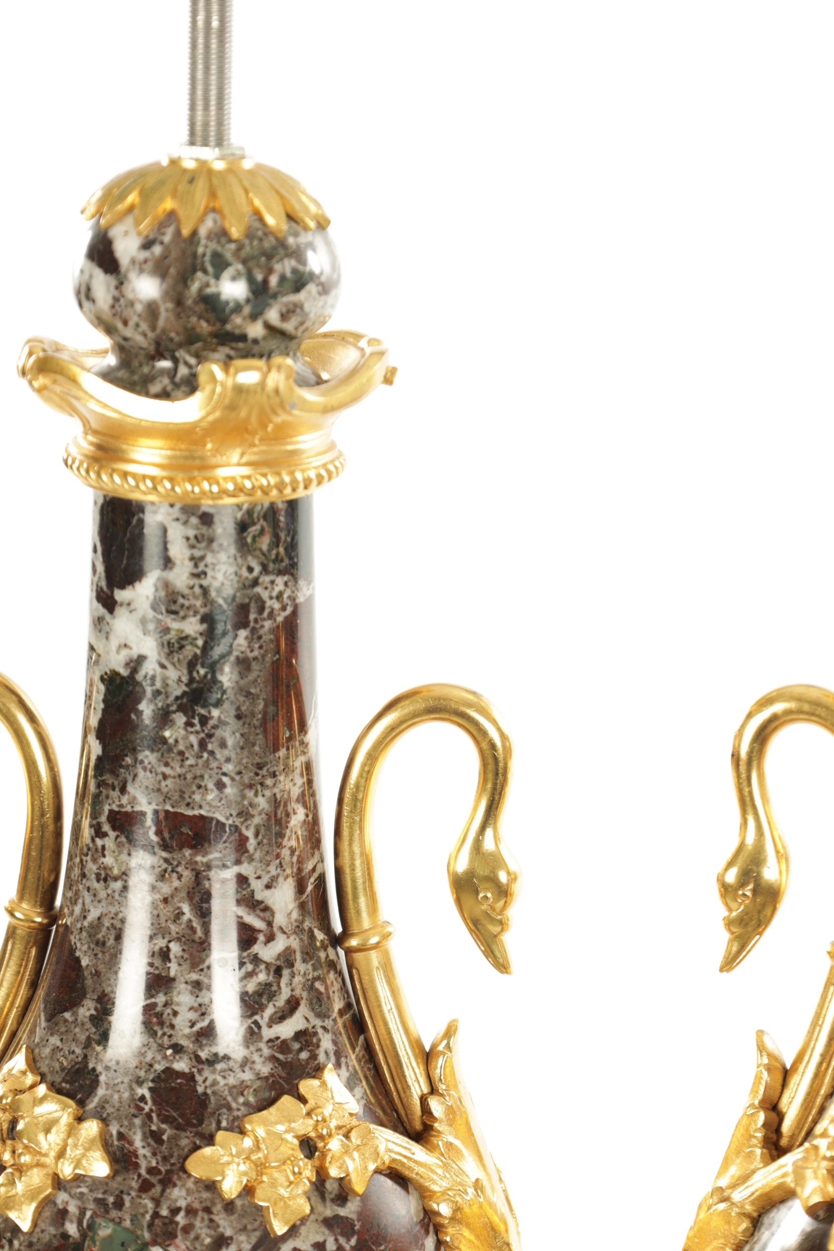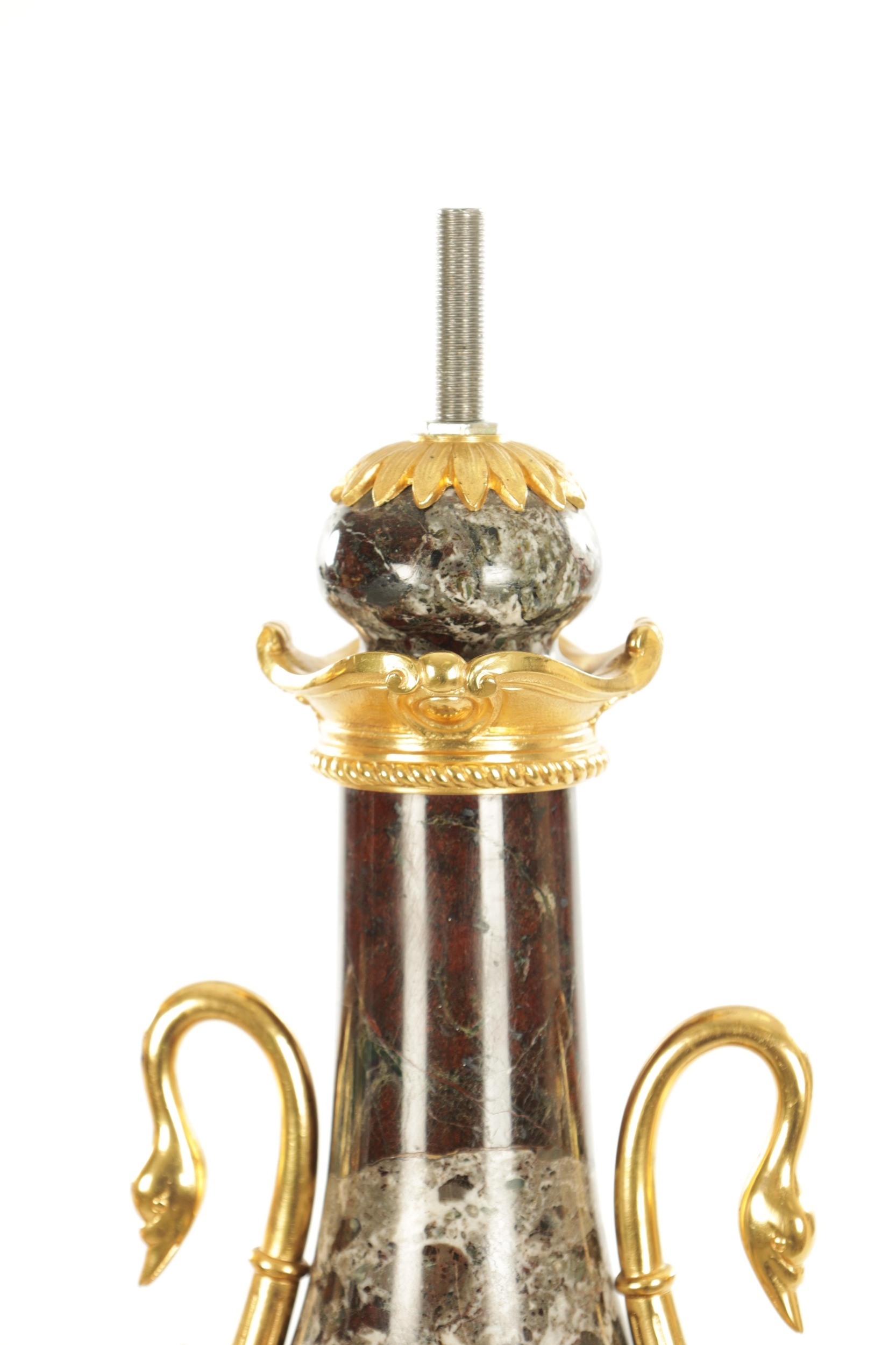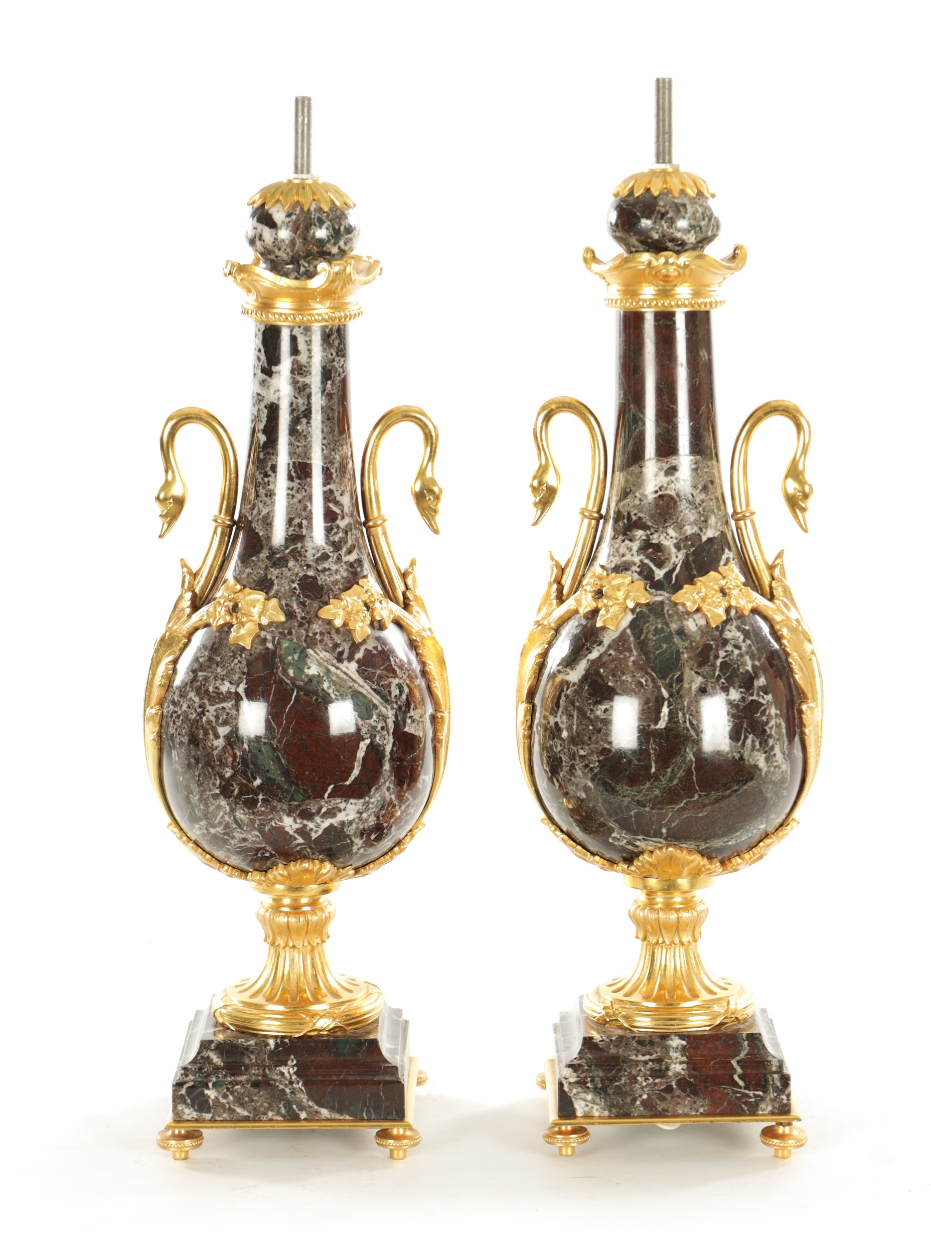 A FINE PAIR OF LATE 19TH CENTURY LOUIS XVI STYLE URN SHAPED CASSOLETTES converted into lamp bases, with gilt brass ormolu mounts on rouge marble urn shaped bodies having swan neck side handles. (46cm high )