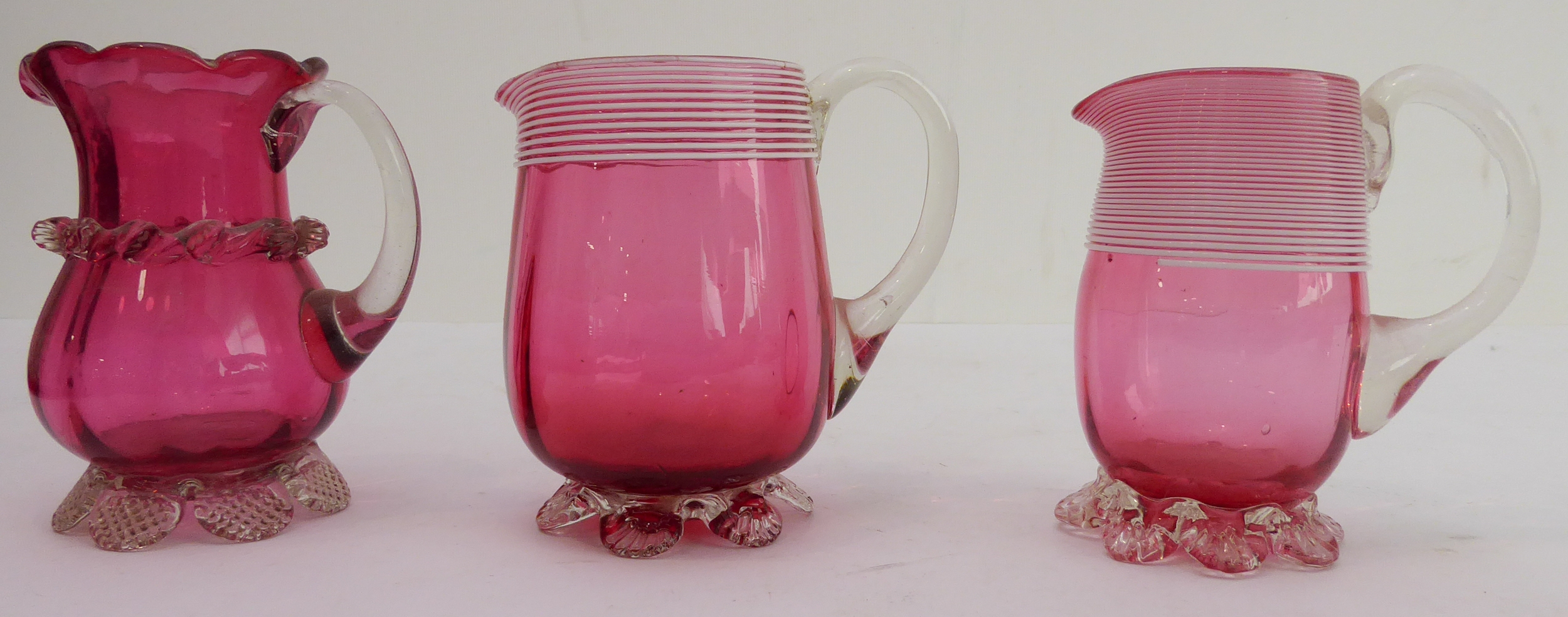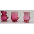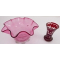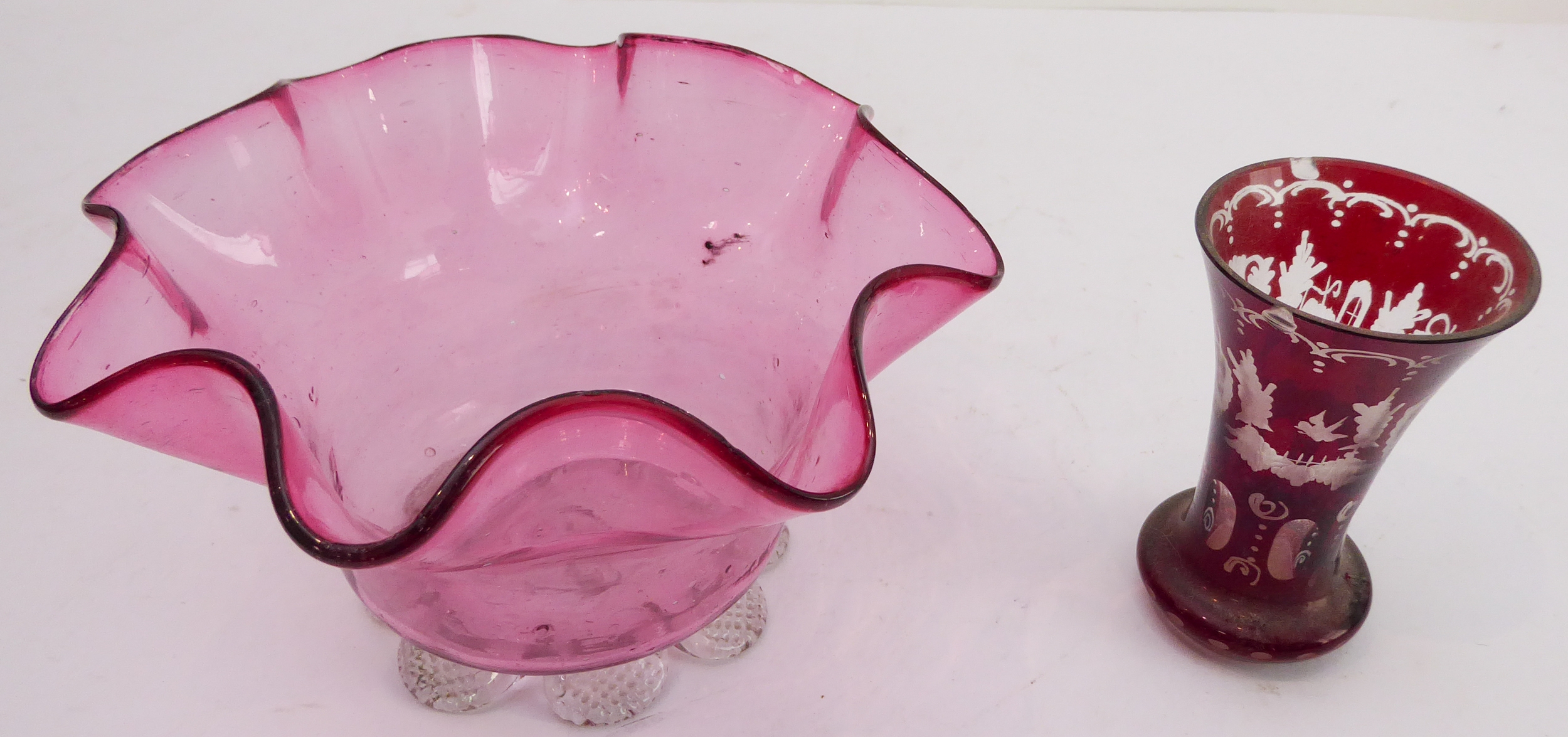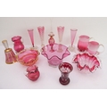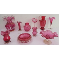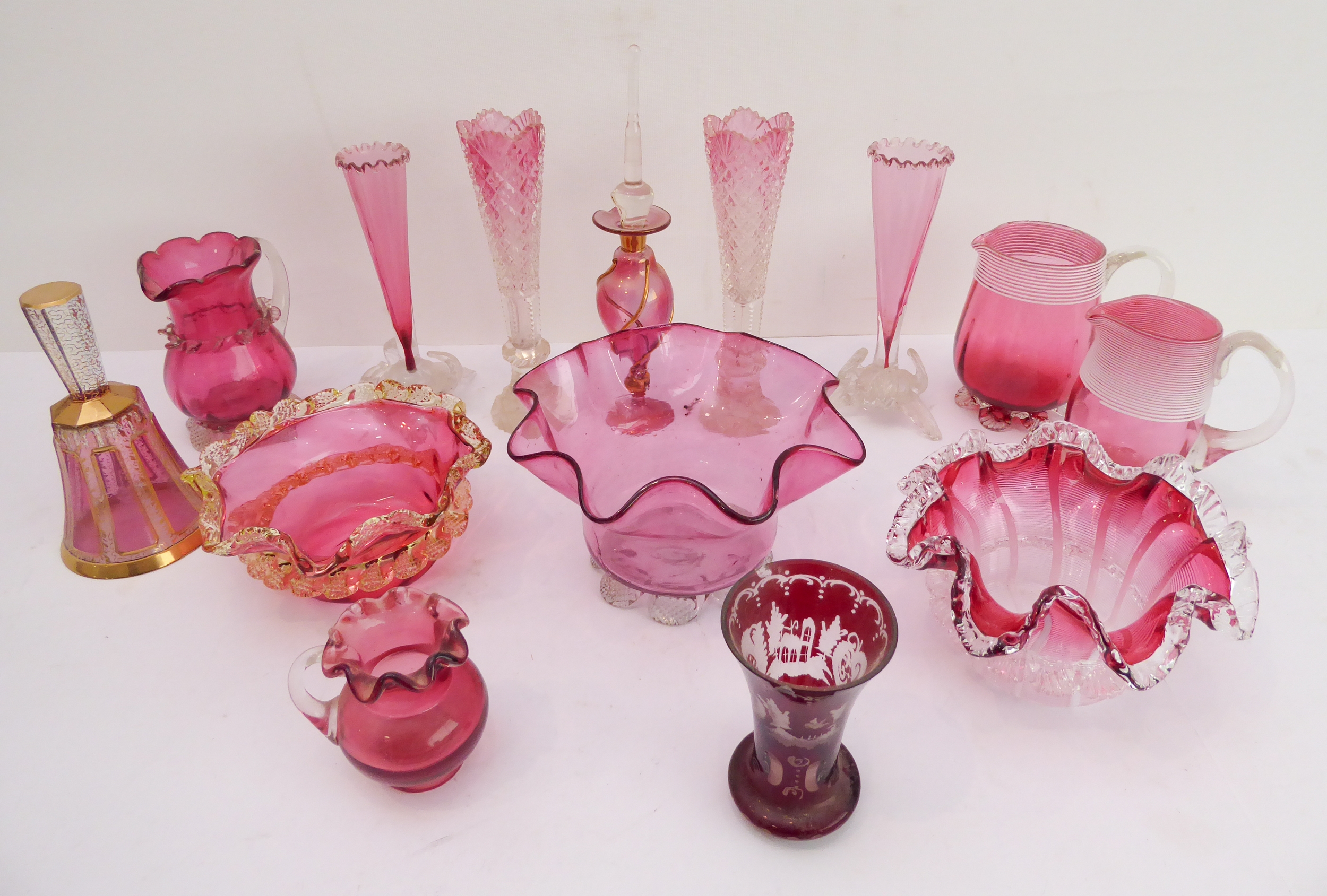 Fourteen pieces of mostly 19th century cranberry glass to include three frilled-edge vases and trinket dishes, and various bud-vases and jugs.
