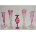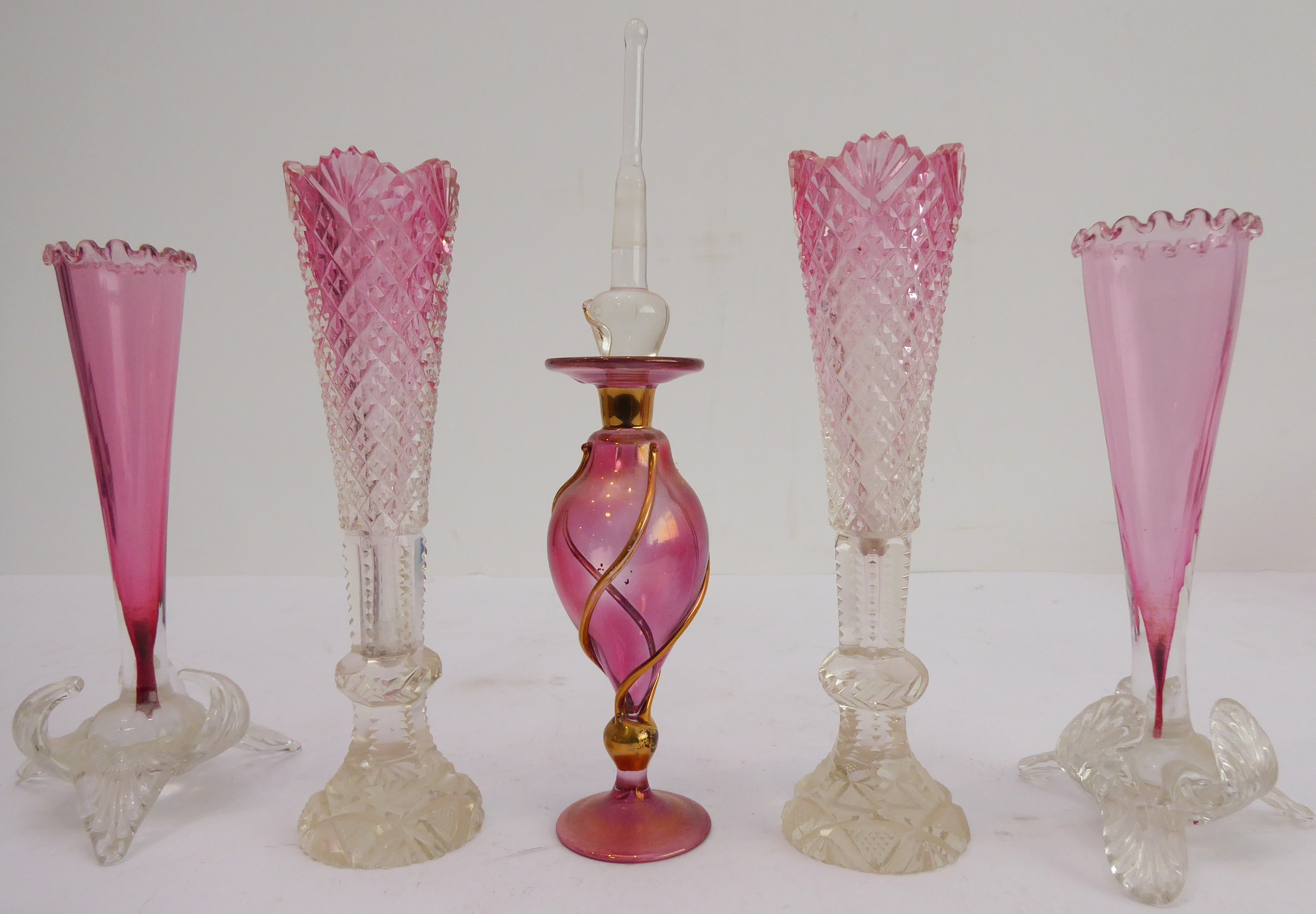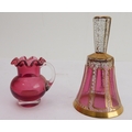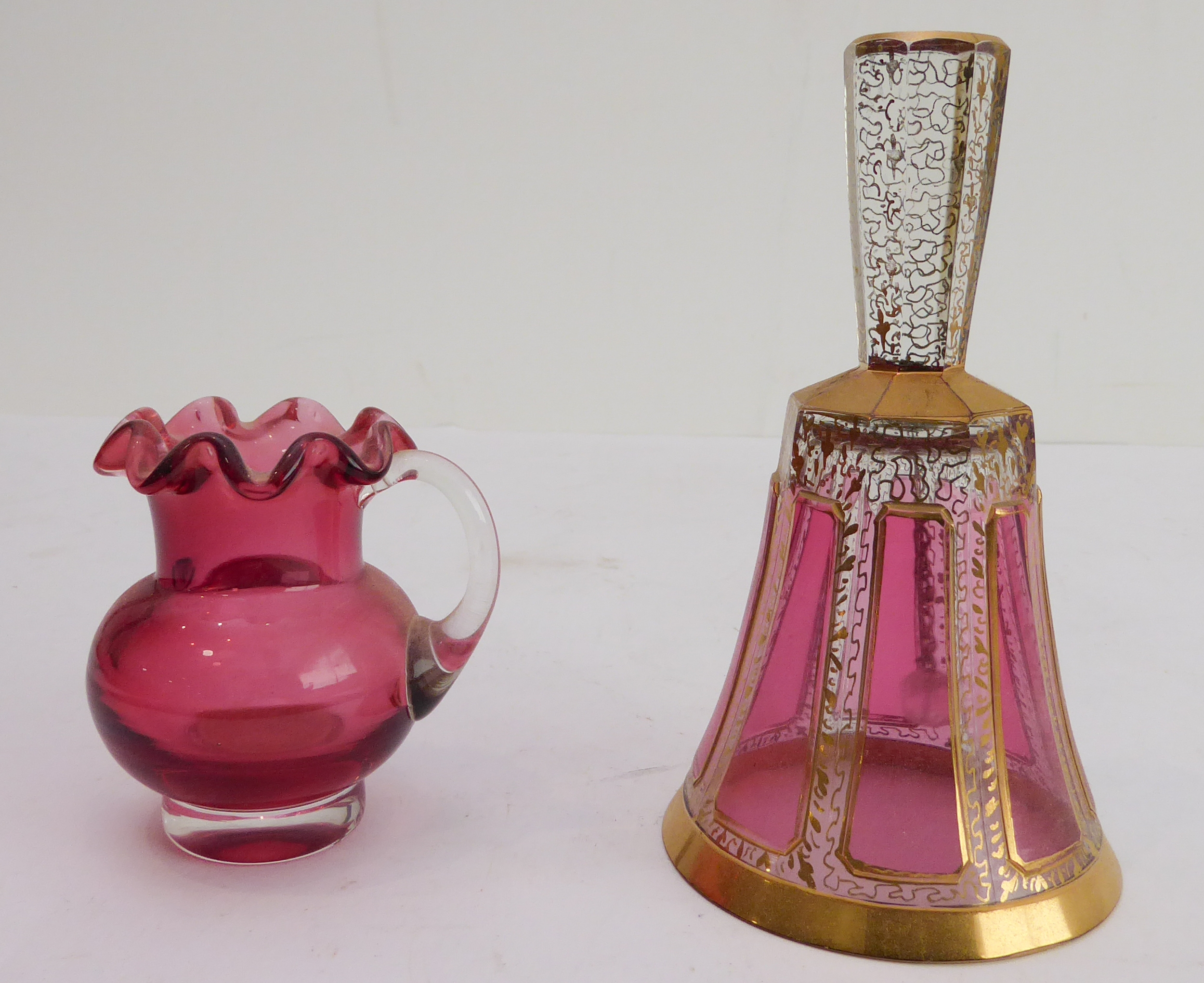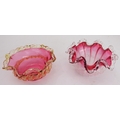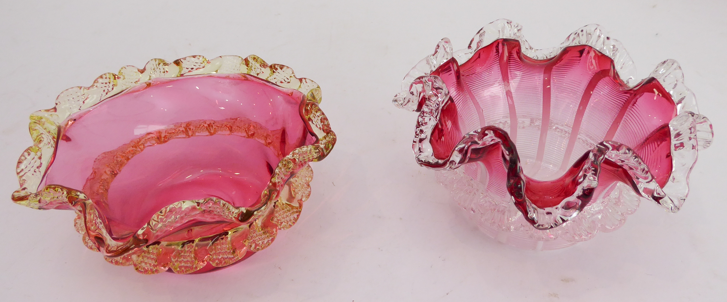 Fourteen pieces of mostly 19th century cranberry glass to include three frilled-edge vases and trinket dishes, and various bud-vases and jugs.
