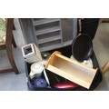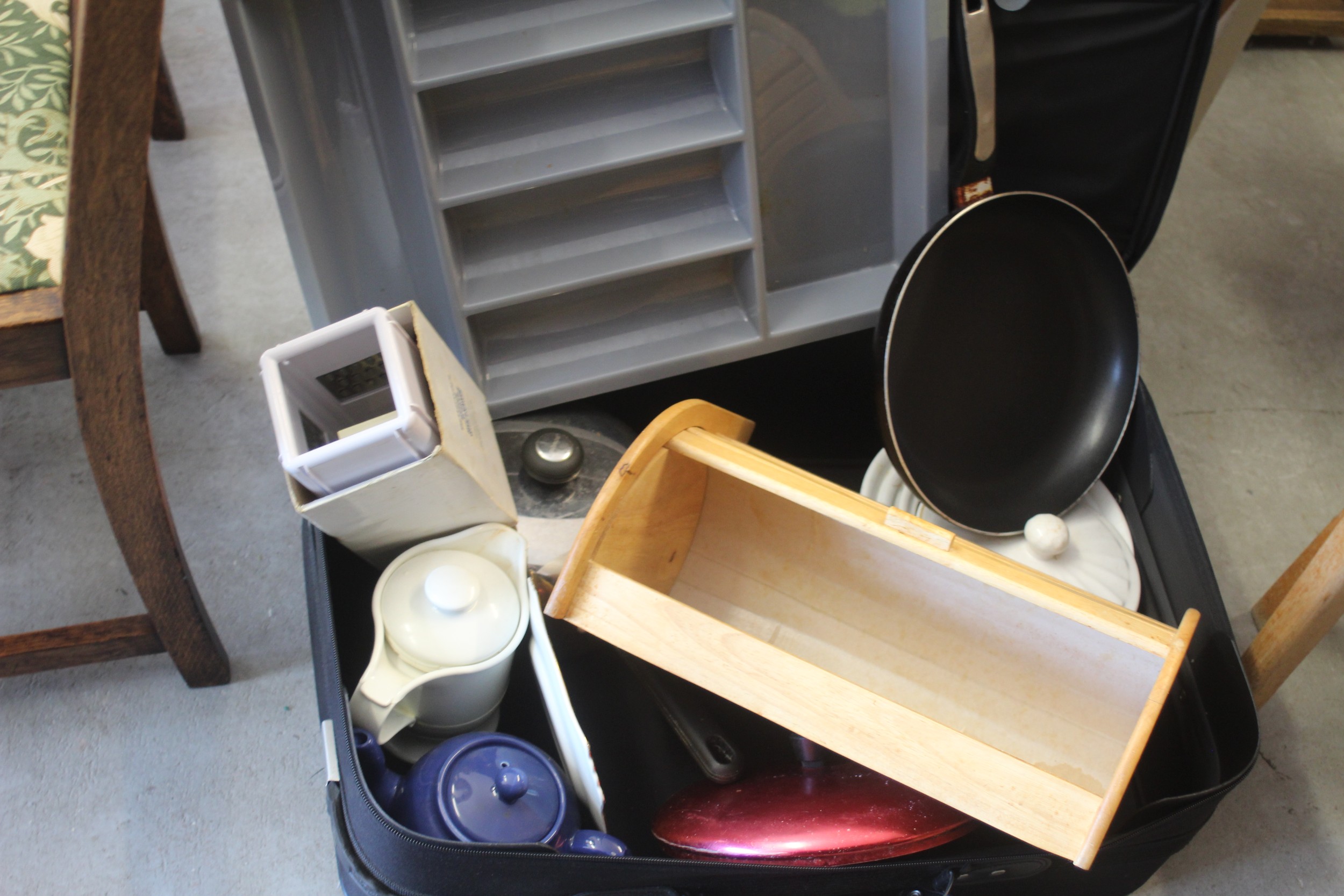 A Suitcase containing a Breadbin. Cutlery Tray, Grater, Sauce Pan, Frying Pan, Gravy Jug. China Casserole Dishes, China Teapot, etc.