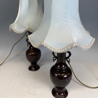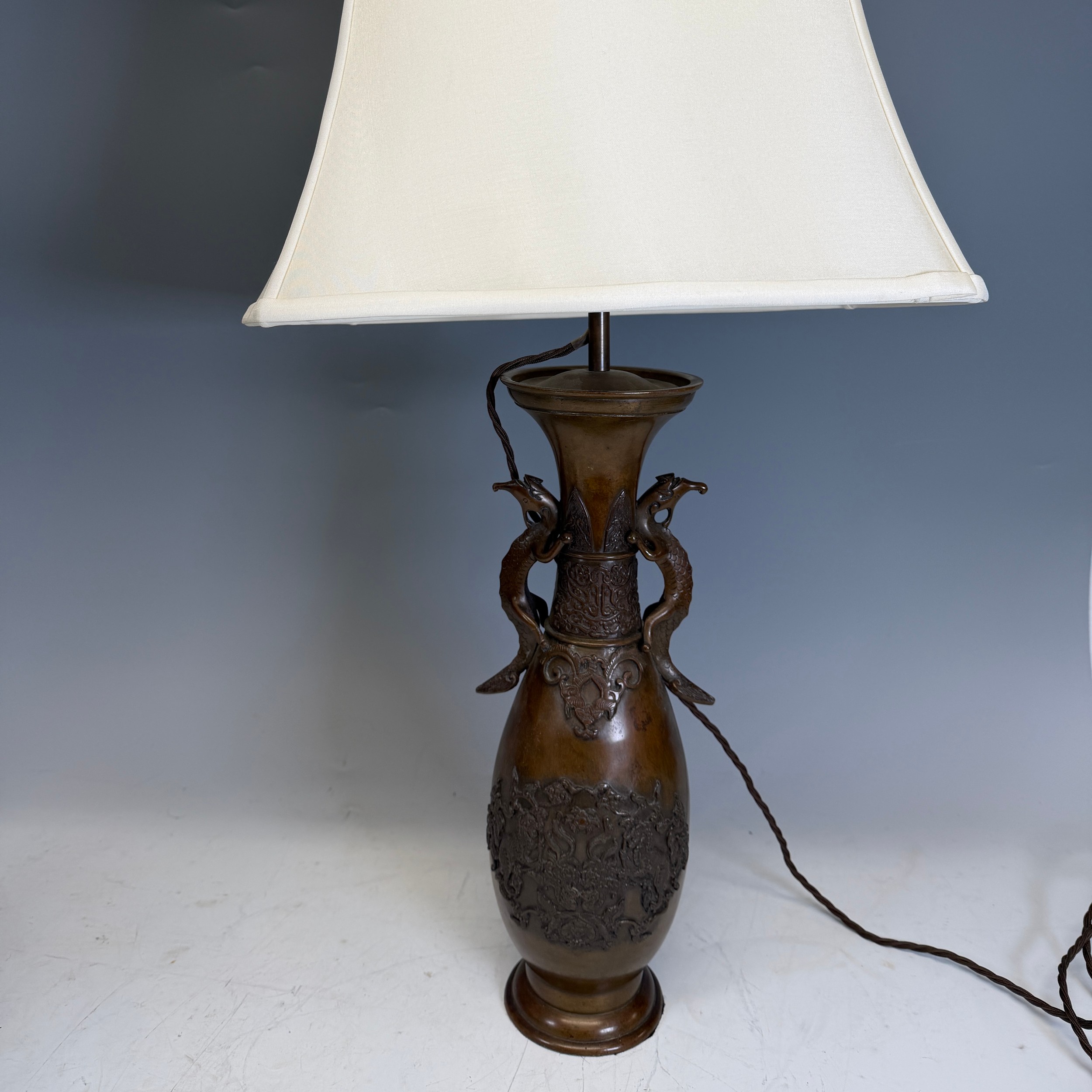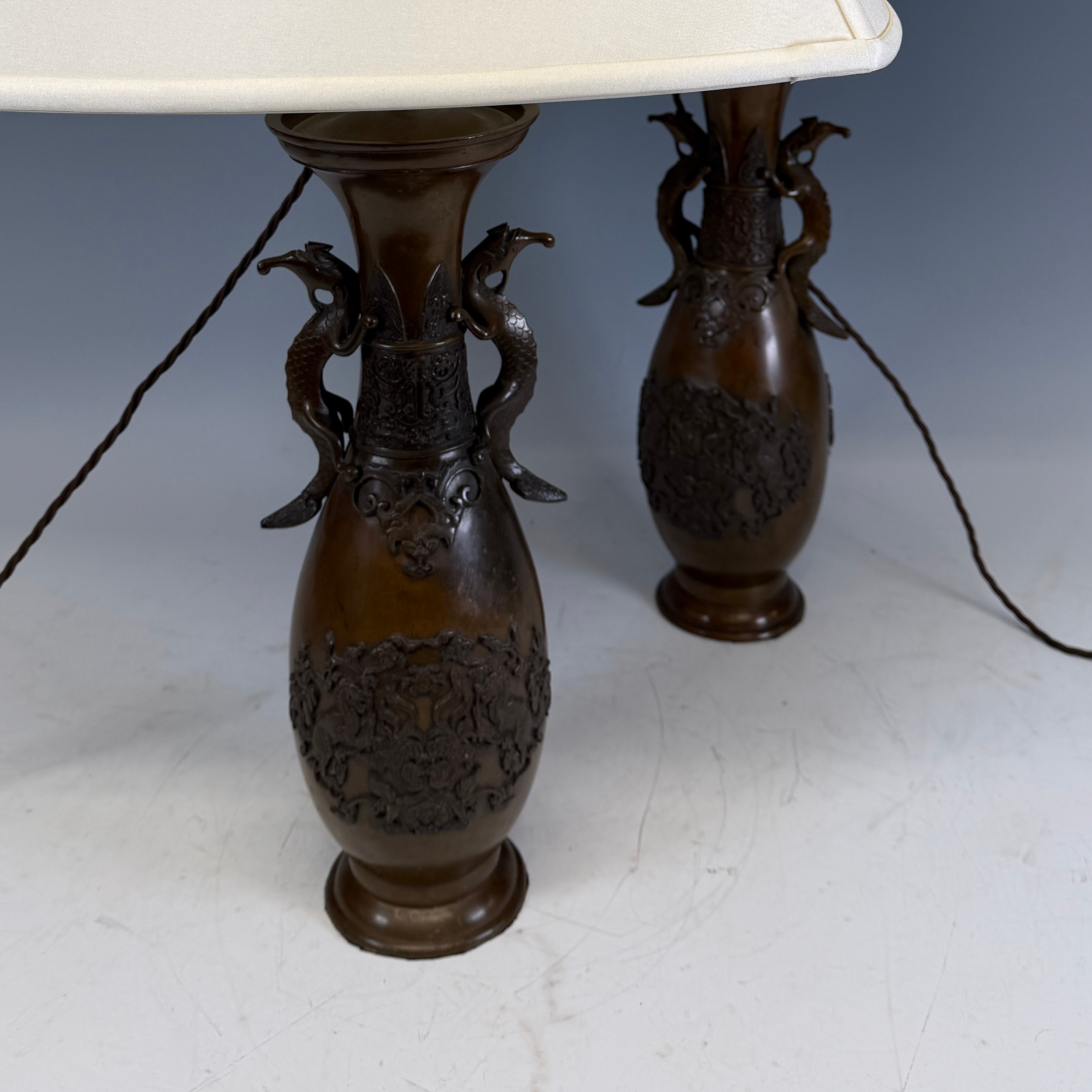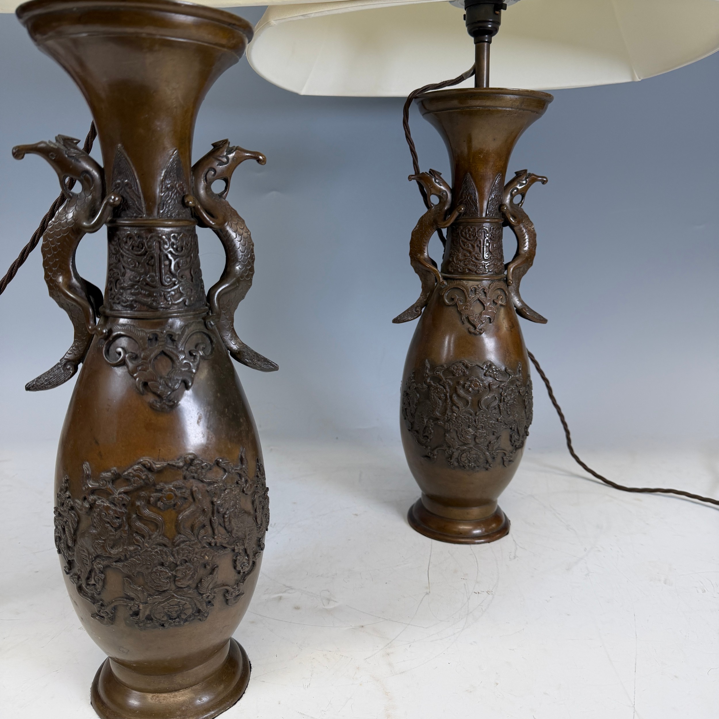 A pair of Japanese-style bronzed table Lamps, of a vase form, with stylised dragon handles, and white shades, H 73.5 cm. (2)
