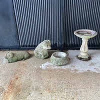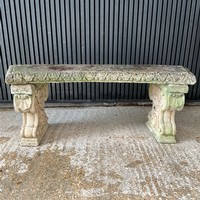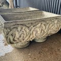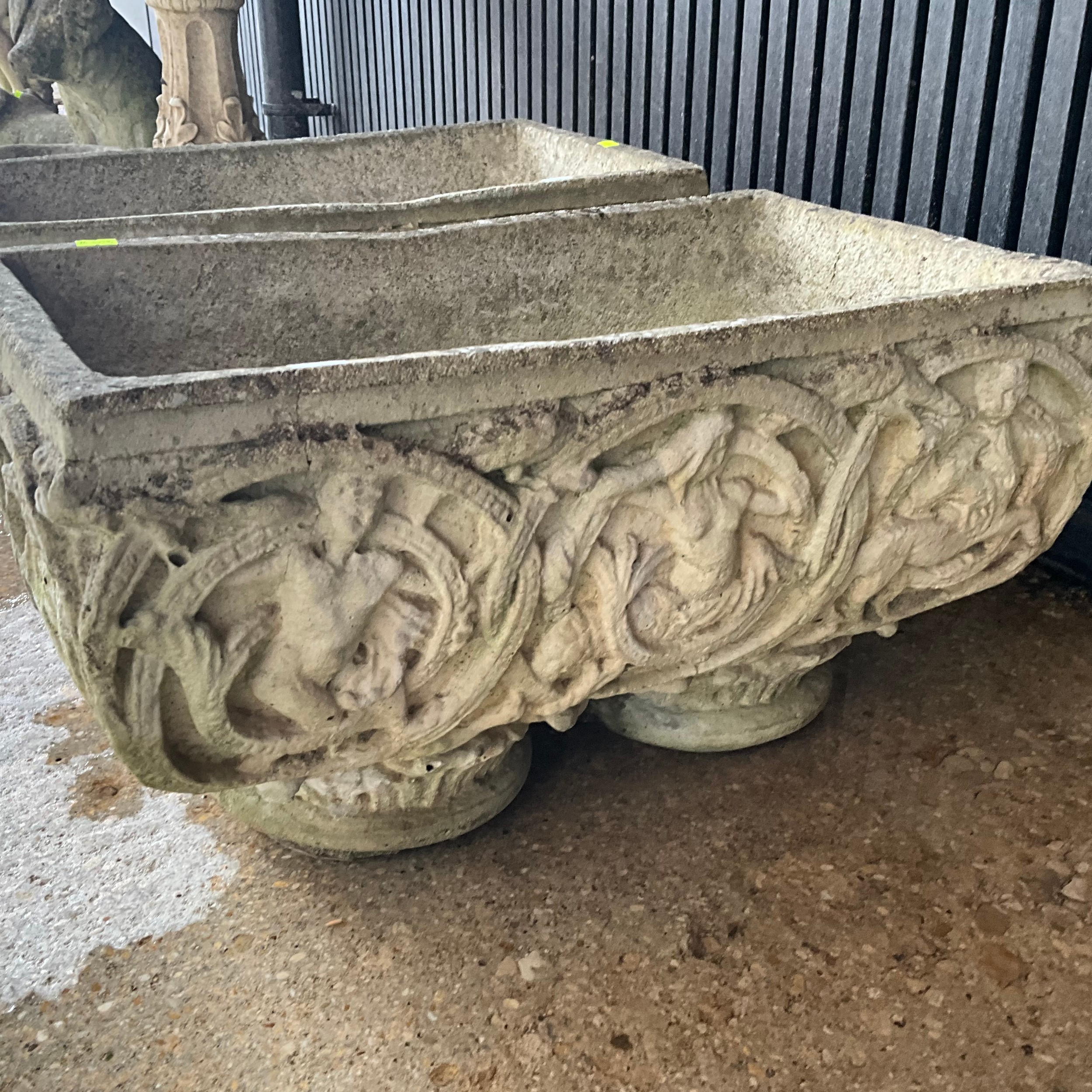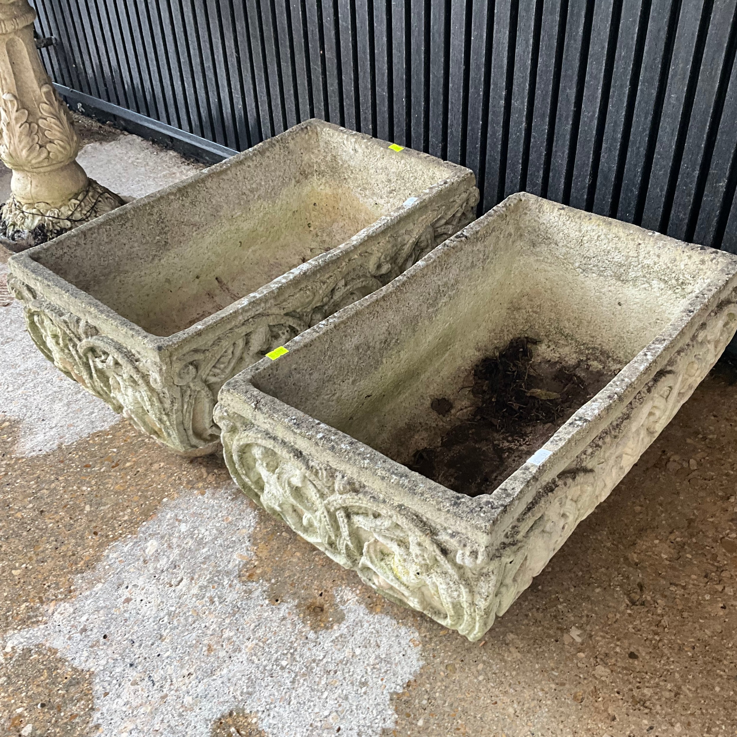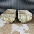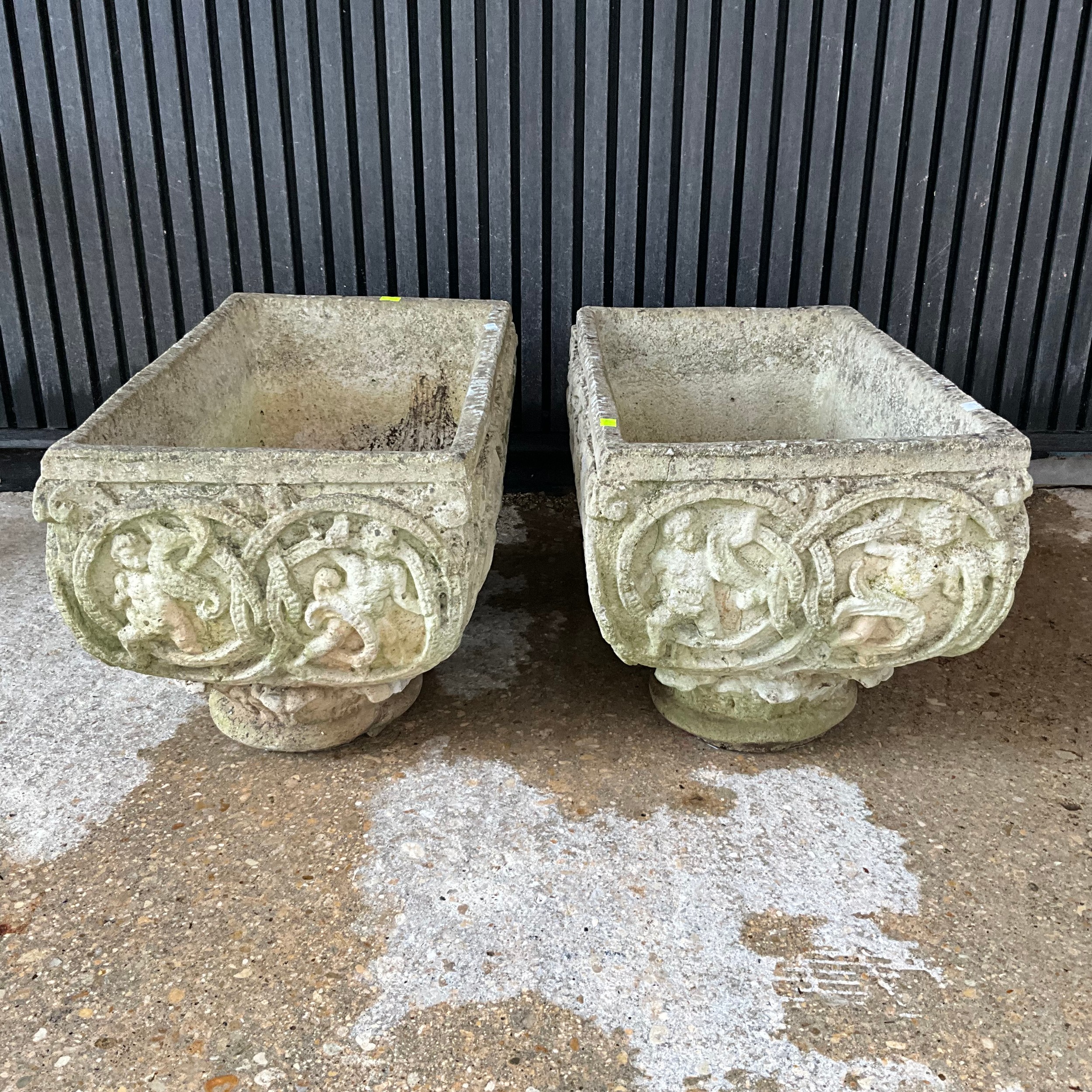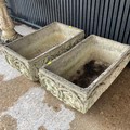 Pair of weathered, matching, reconstituted stone garden planters, H30cm x W54cm x D30cm.