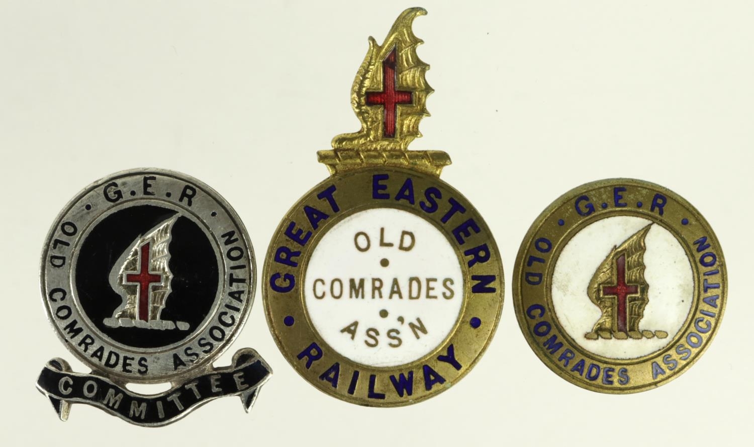 Great Eastern Railway Old Comrades Badges (3) 2 ordinary and 1 Committee - all made by J.R. Gaunt of London (2 marked J.R. Gaunt & Son) Not common badges