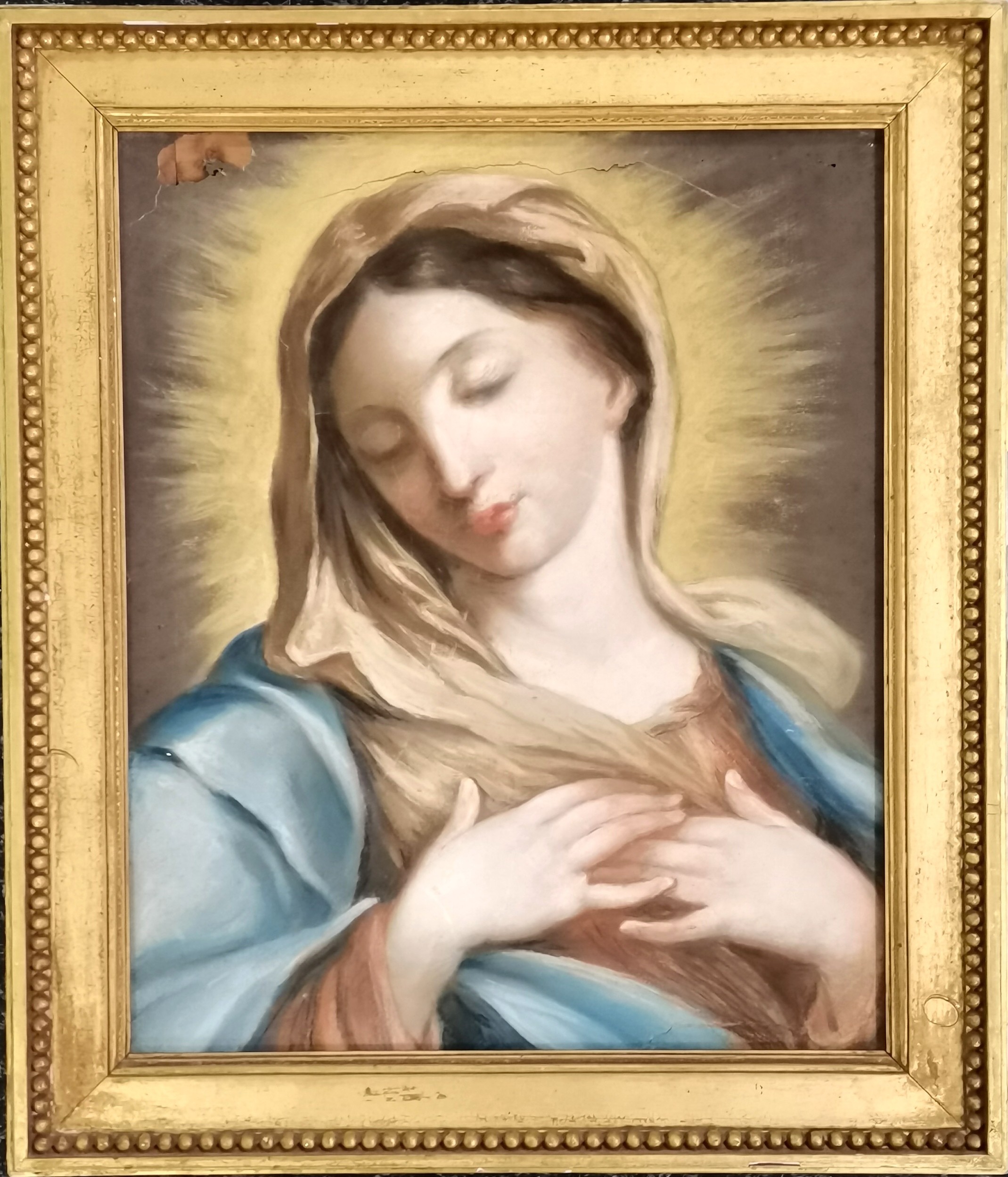 Antique pastel depiction of Mary - gilt frame 50cm x 58cm ~ has 3 tears and some losses and slight loss to frame