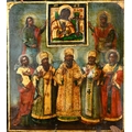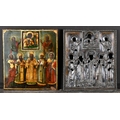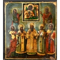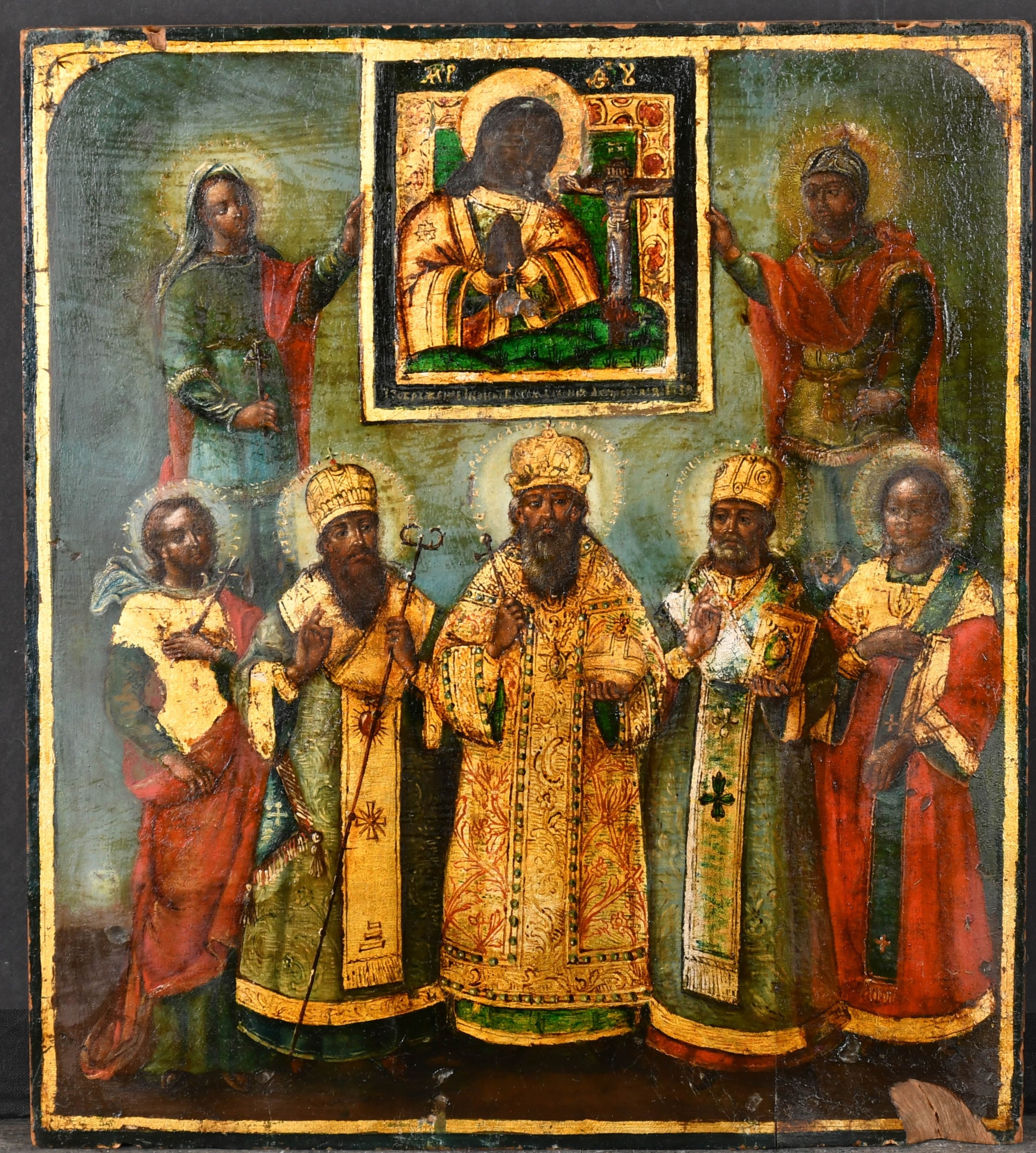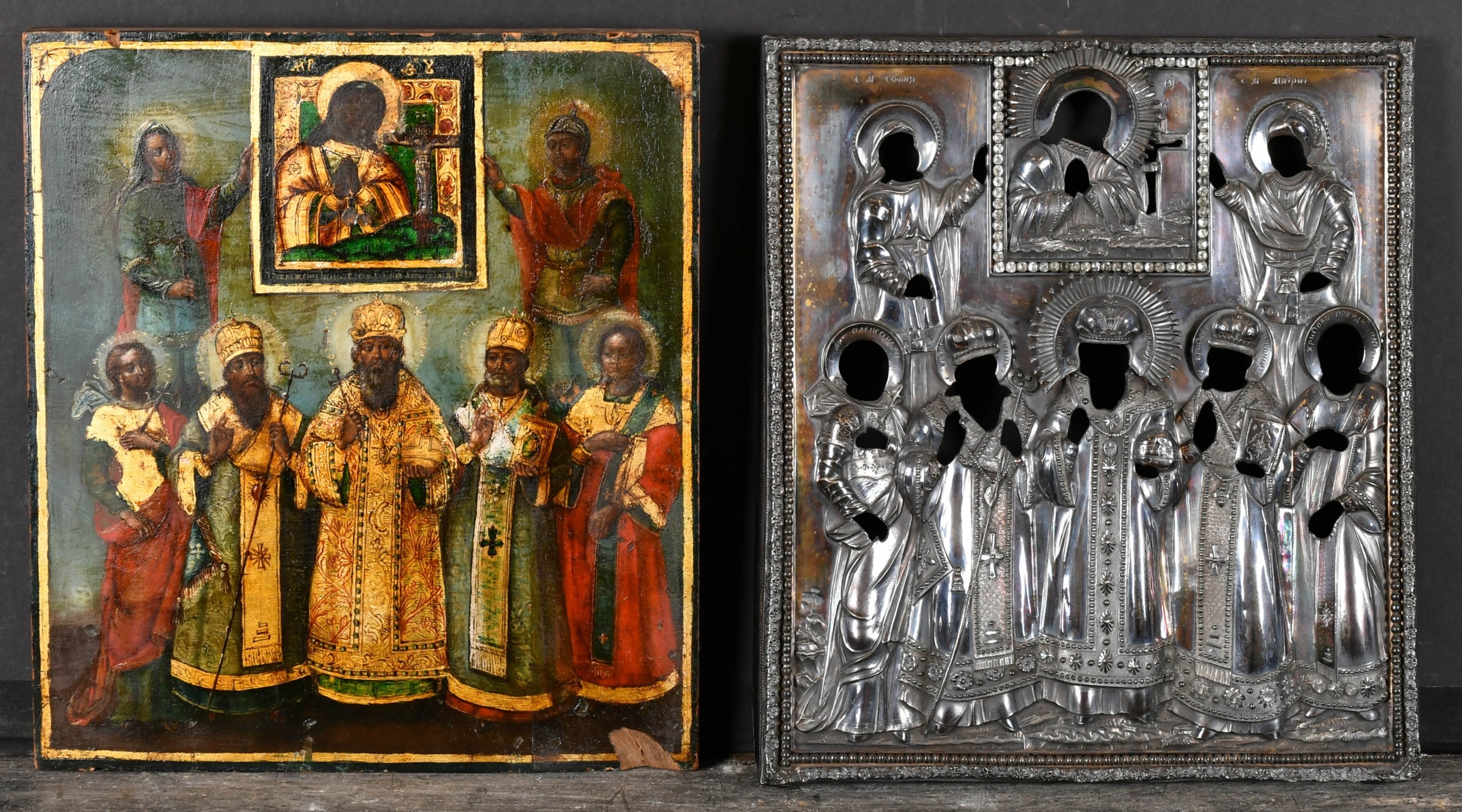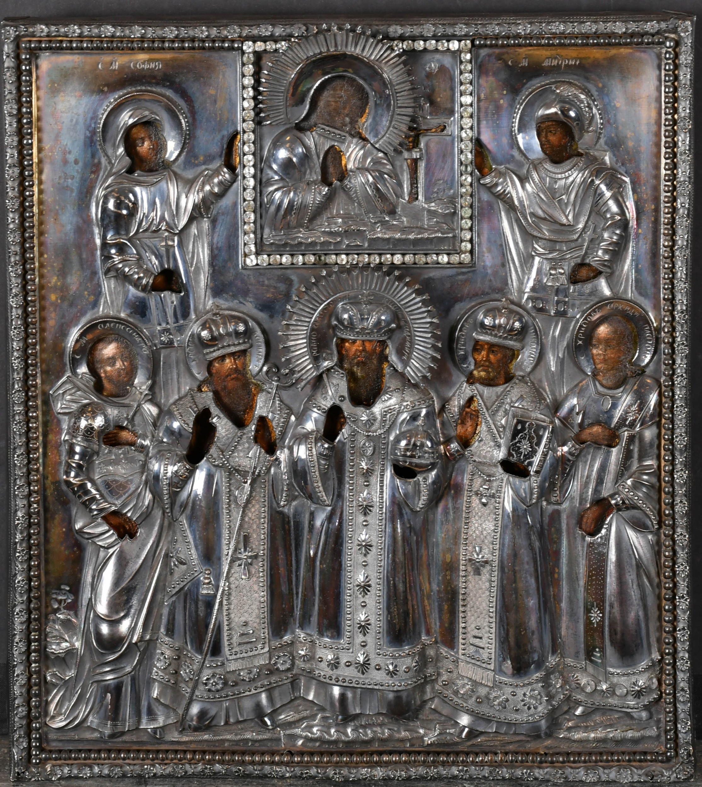 Late 18th Century Russian School. The Akhtyrskaya Mother of God Icon with a Synaxis of Saints, Oil on panel, Inscribed with the names of the Saints and inscribed 1739, with an 84 stamped silver oklad dated 1808 and with marks of the Kalugg area (weight 716g), 12.5" x 11" (31.7 x 28cm). Provenance: A Church in the area of Greater Moscow; private collection (from mid 20th century). Notes: This work represents the veneration of the Akhtyrskaya Mother of God icon by Saints. A priest, Father Vasily Danilov, discovered the Akhtyrskaya icon in 1739 lying in grass by his church in Akhtyrka in the Kharkov Province. The Holy Mother later appeared to him in a dream commanding him to wash the icon and use the water to bless the sick. Notes of the miraculous healings were reported to the Synod and in 1751 they honoured the image as miraculous. In 1768, by order of Empress Elizabeth Petrovna, a stone cathedral was built in Akhtyrka to house the original.