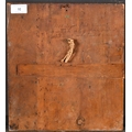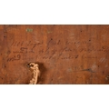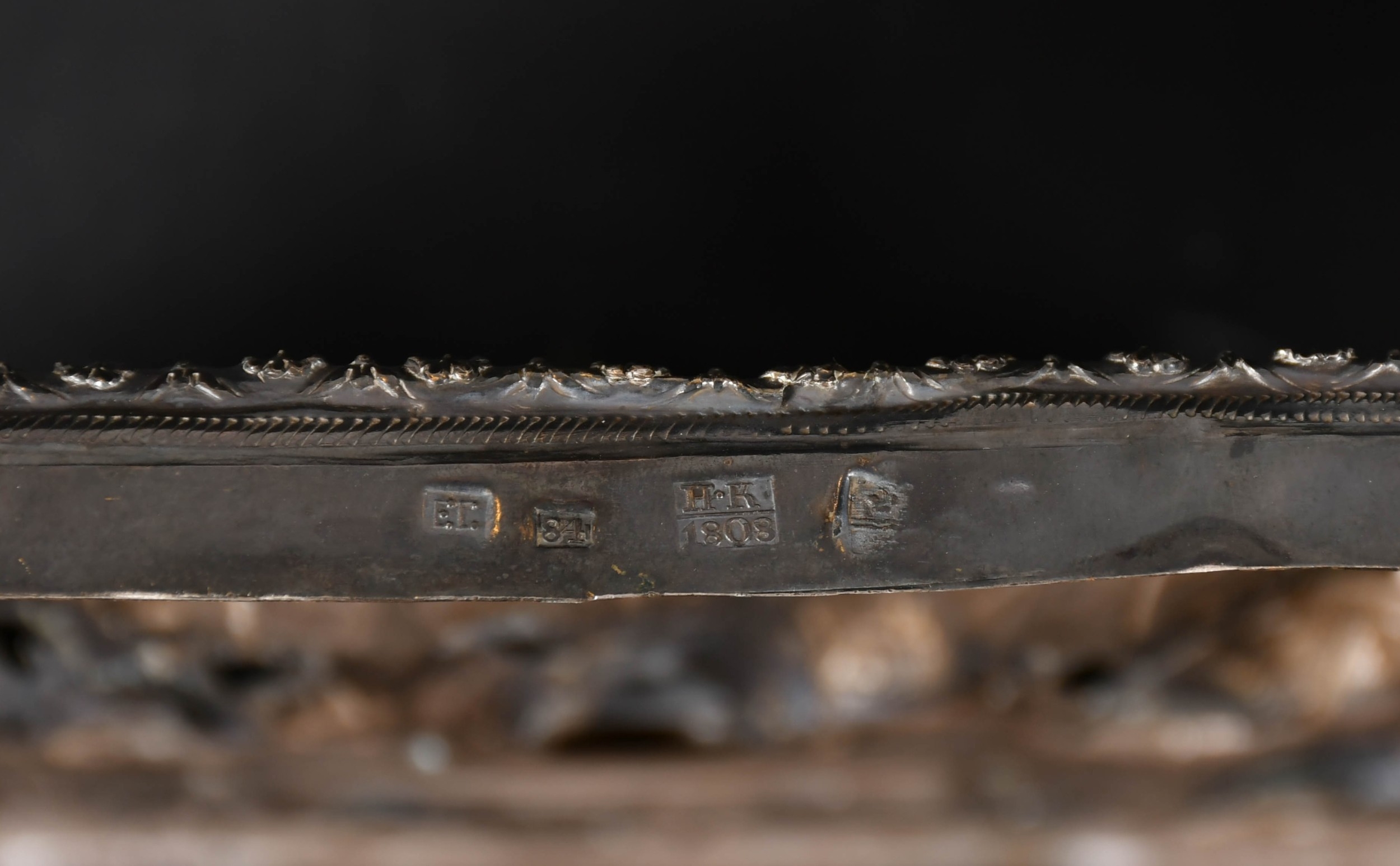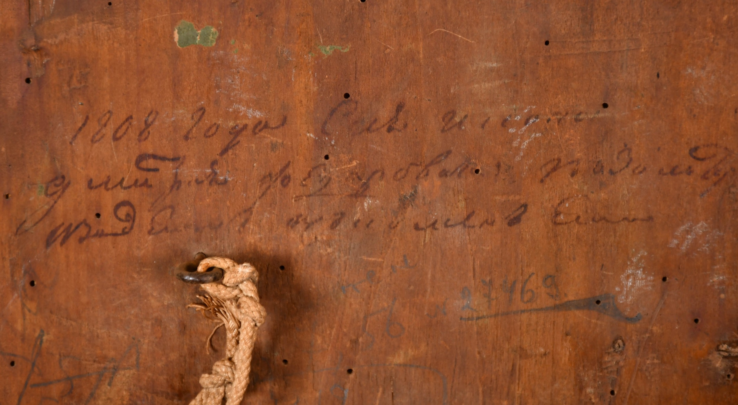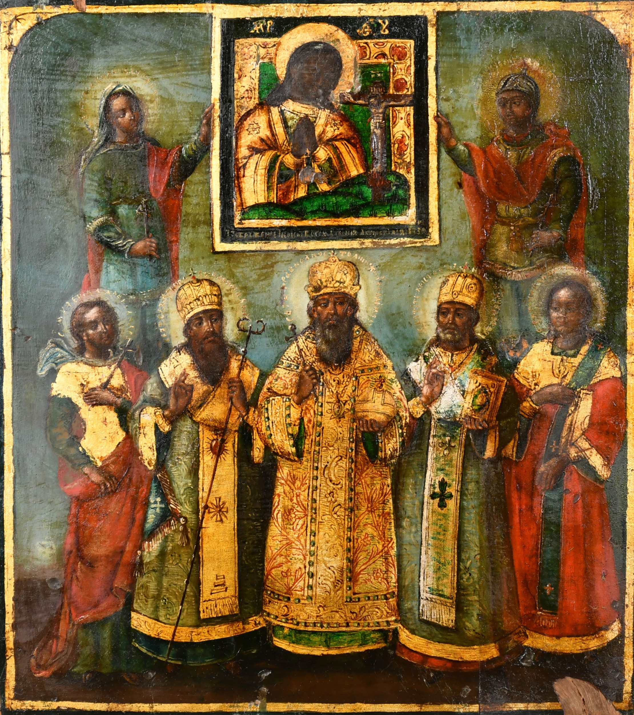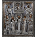 Late 18th Century Russian School. The Akhtyrskaya Mother of God Icon with a Synaxis of Saints, Oil on panel, Inscribed with the names of the Saints and inscribed 1739, with an 84 stamped silver oklad dated 1808 and with marks of the Kalugg area (weight 716g), 12.5" x 11" (31.7 x 28cm). Provenance: A Church in the area of Greater Moscow; private collection (from mid 20th century). Notes: This work represents the veneration of the Akhtyrskaya Mother of God icon by Saints. A priest, Father Vasily Danilov, discovered the Akhtyrskaya icon in 1739 lying in grass by his church in Akhtyrka in the Kharkov Province. The Holy Mother later appeared to him in a dream commanding him to wash the icon and use the water to bless the sick. Notes of the miraculous healings were reported to the Synod and in 1751 they honoured the image as miraculous. In 1768, by order of Empress Elizabeth Petrovna, a stone cathedral was built in Akhtyrka to house the original.