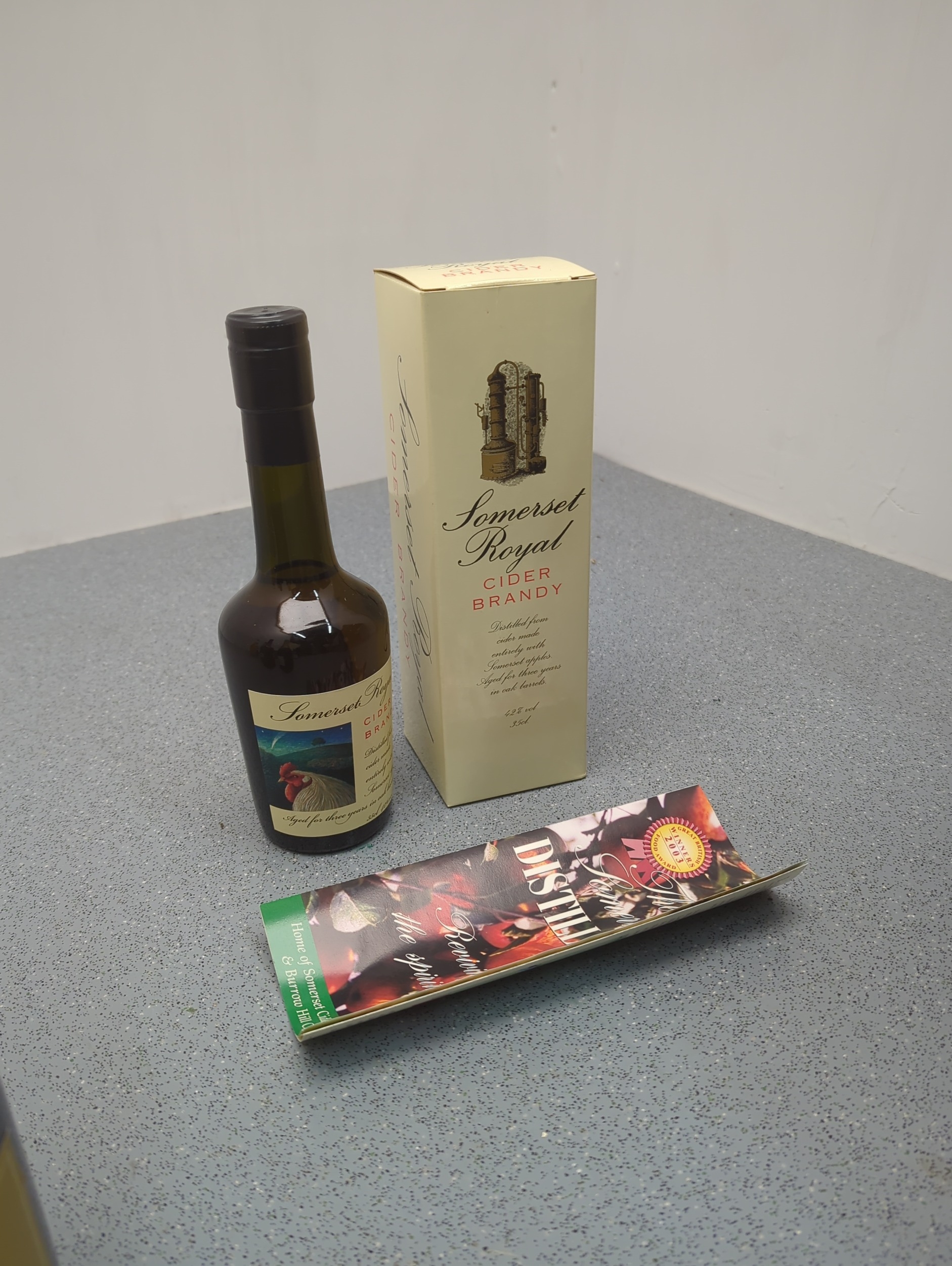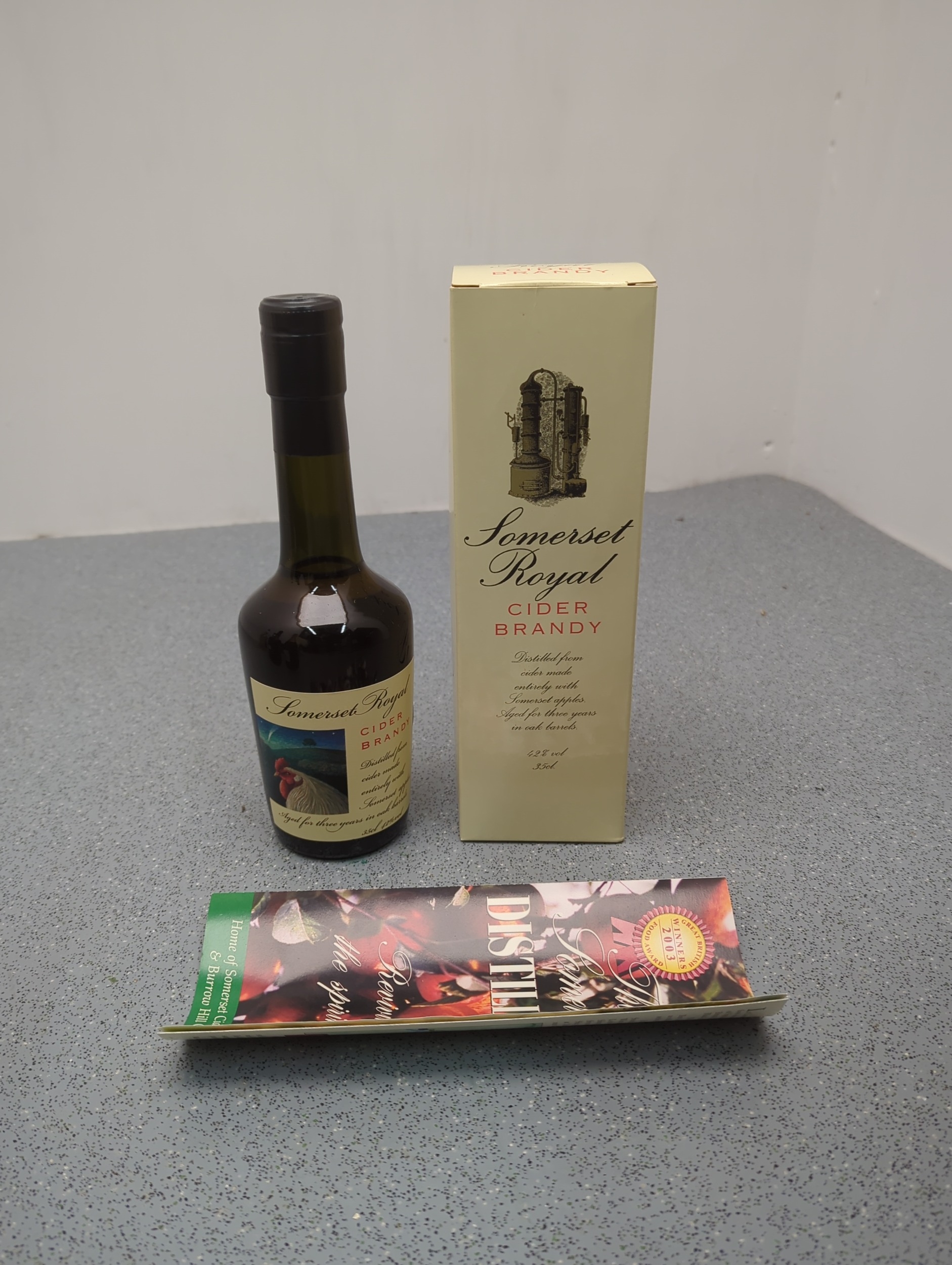 This is a bottle of Somerset Royal Cider Brandy, a traditional English spirit. The bottle showcases a finely detailed label and comes with an accompanying promotional leaflet and branded box. This brandy is distilled from vintage apples and aged in small oak barrels for three years, embodying the heritage of Somerset distillation.