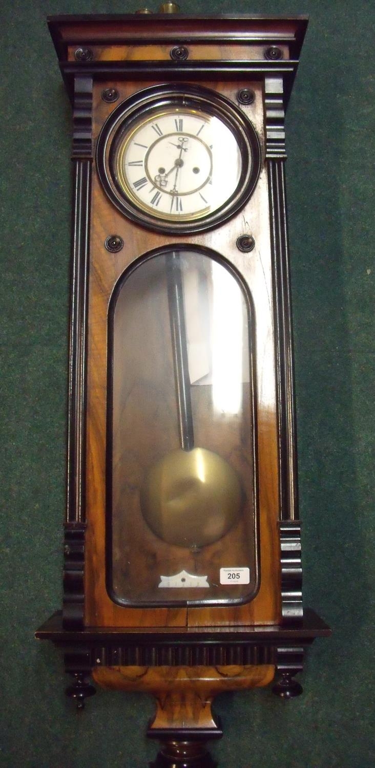 Walnut and ebonised cased double weighted Vienna style wall clock with white email dial and secondary dial
