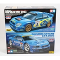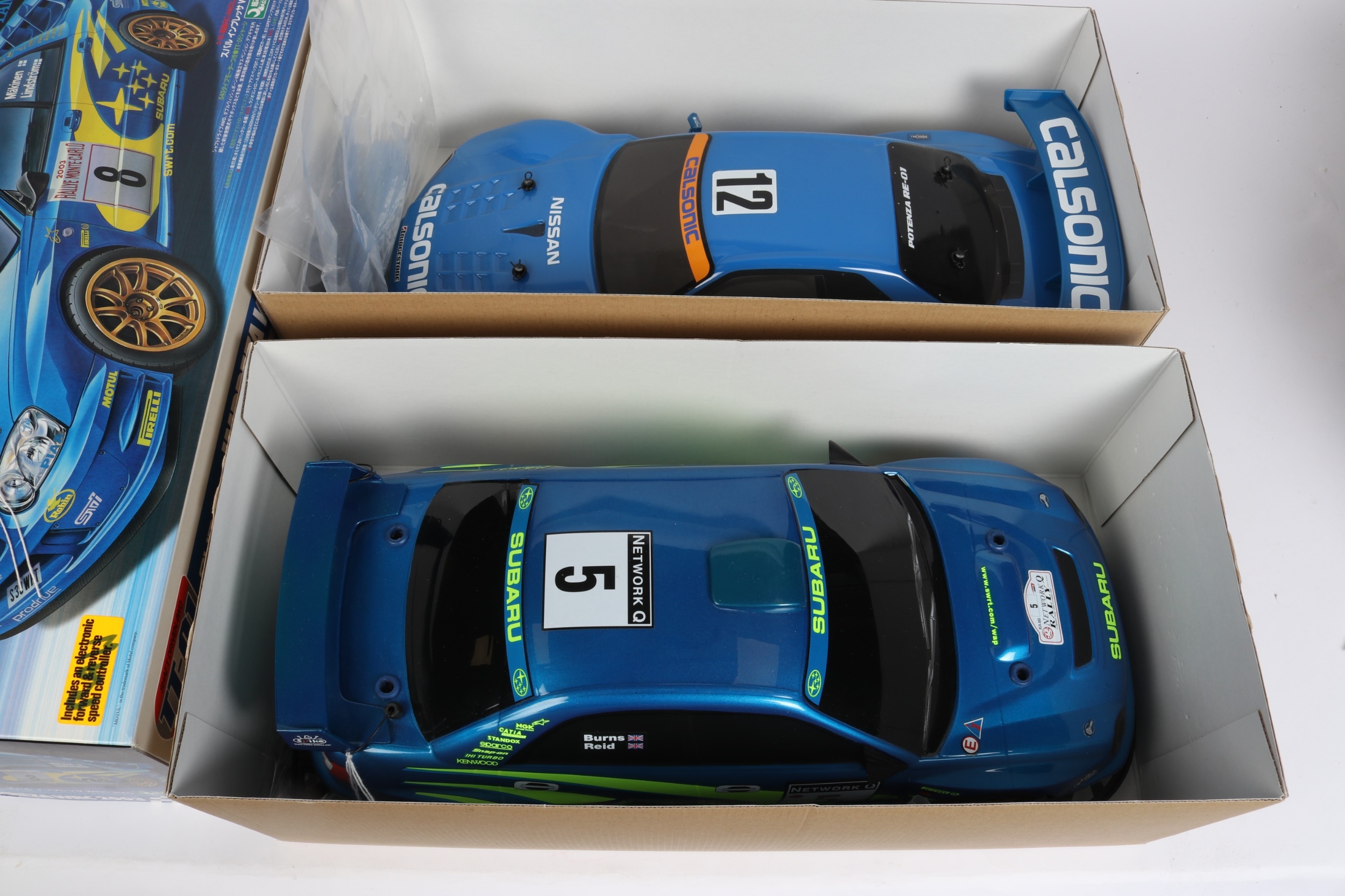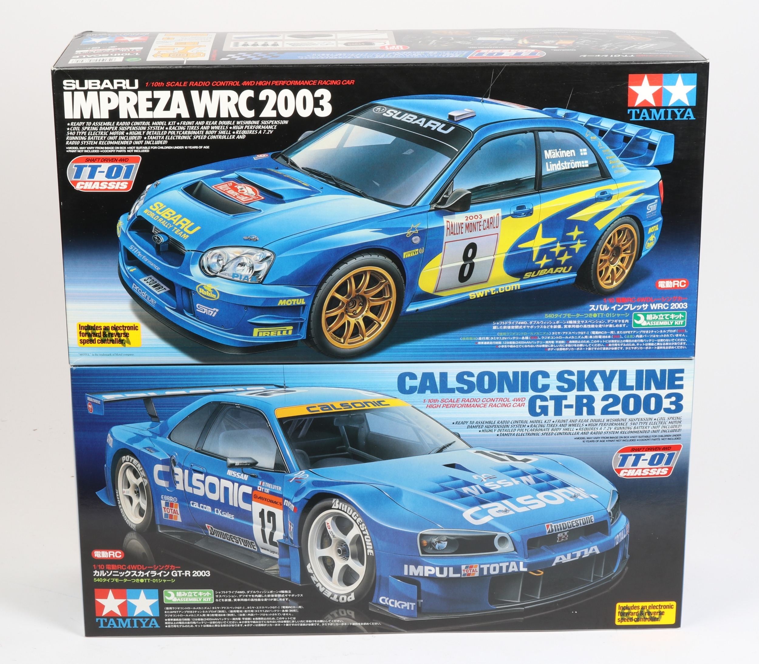 2 TAMIYA 1:10 scale Radio Controlled High Performance Racing Cars. A Subaru Impreza WRC 2003 and a Calsonic Skyline GT-R 2003. Both boxed, contents looks to be as new and complete and with paperwork, but this cannot be guaranteed. £70-90