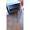 Industrial office cupboard, painted grey, with single hinged door and recessed handle; fitted interior with adjustable shelf and raised on short castors.