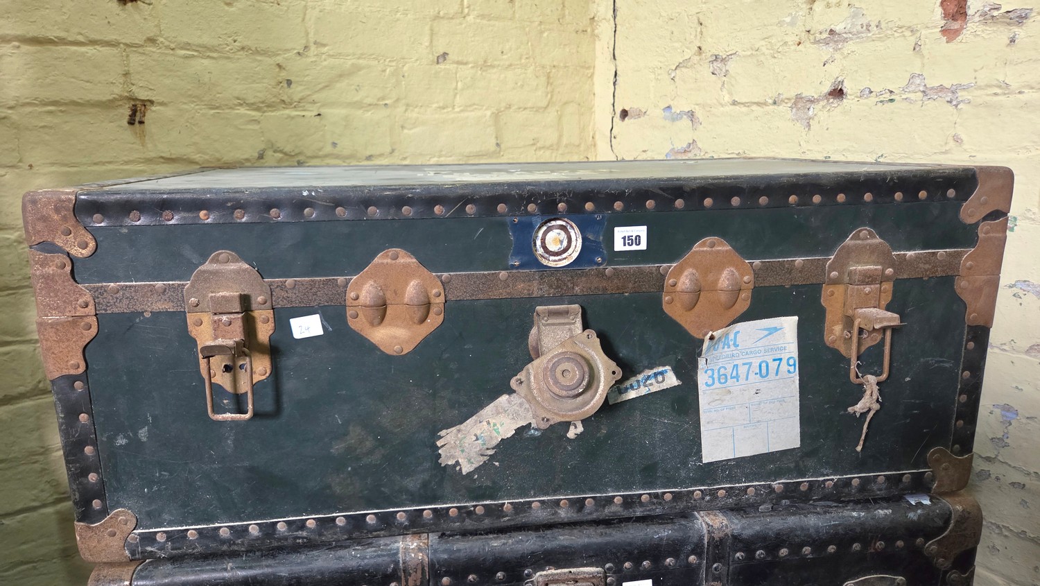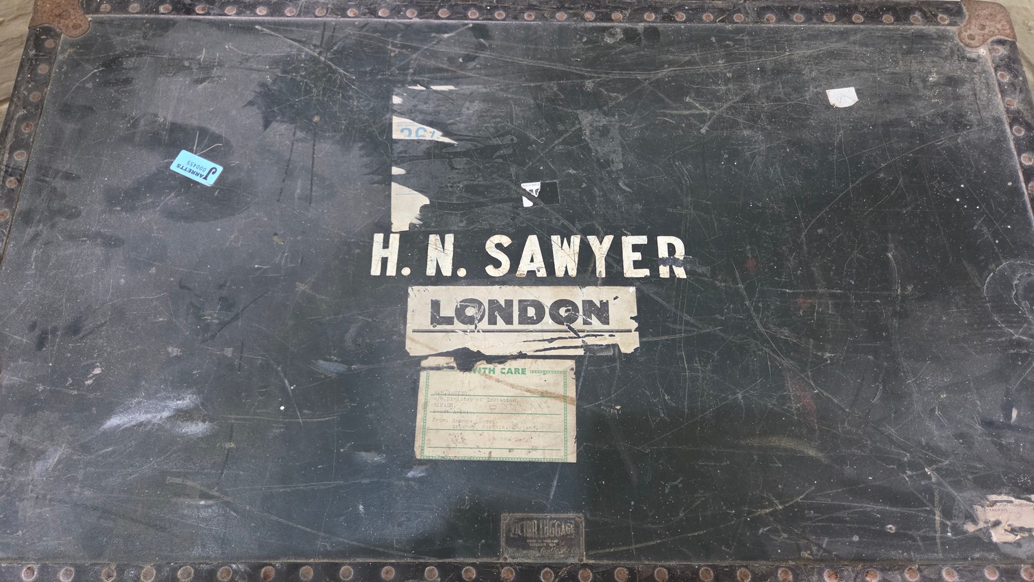 Vintage cabin trunk with BOAC and other travel labels, stencilled HM Sawyer with internal tray