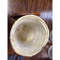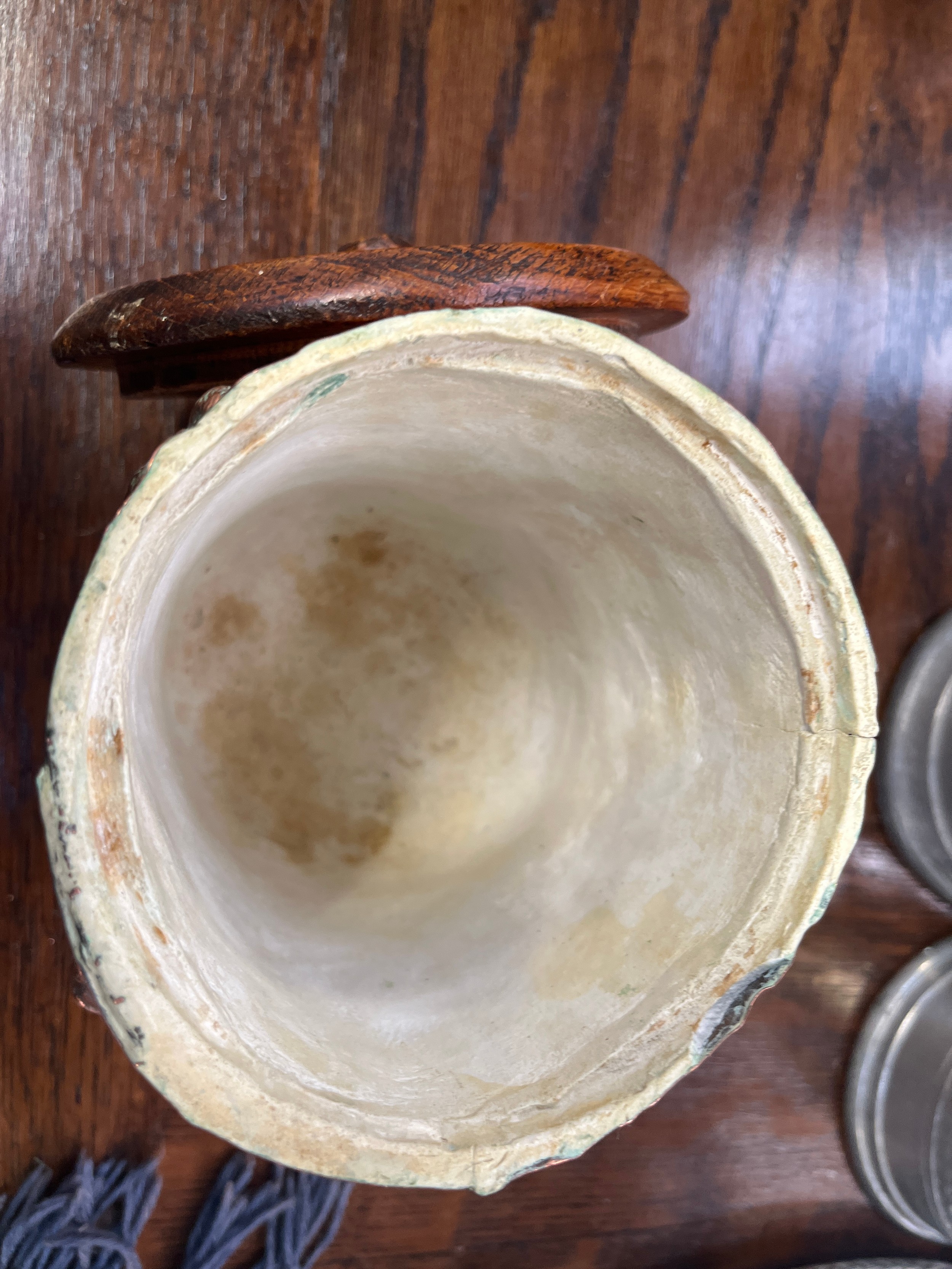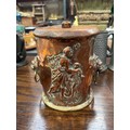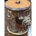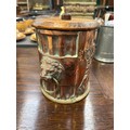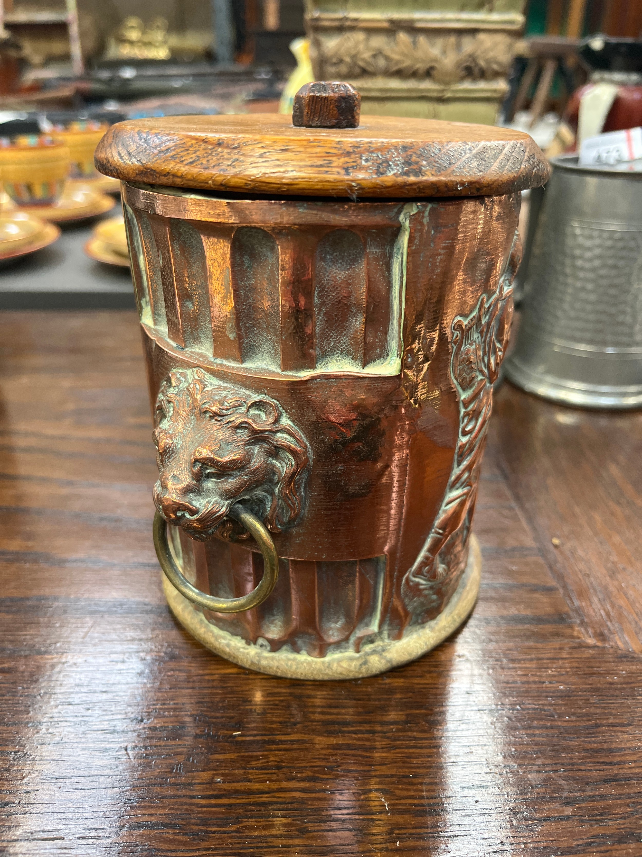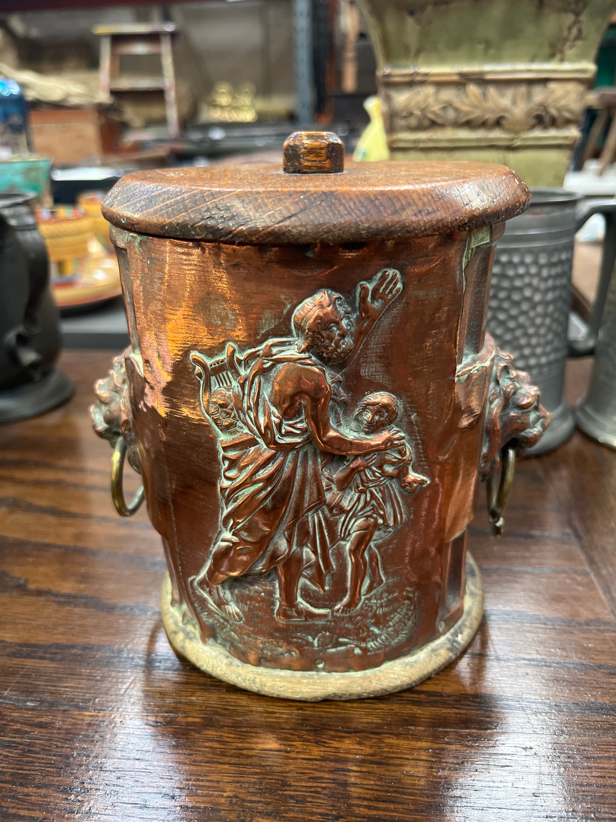 Victorian embossed copper tobacco jar, decorated with relief motifs showing St Christopher and the Christ child. Lined inside with plaster, the outer copper coating is also embossed with lion heads on each side holding brass loop handles, the base and lid made from oak.
