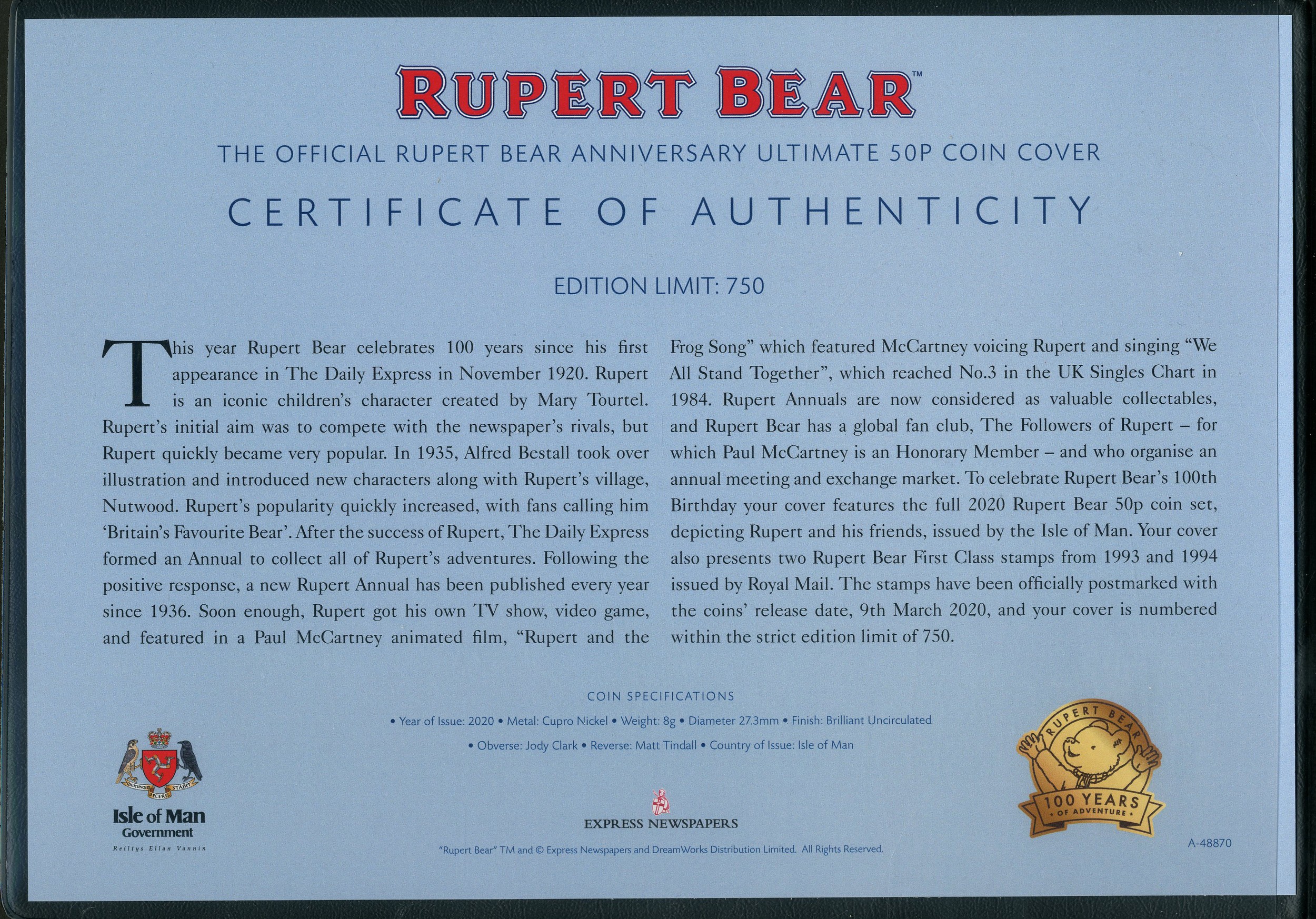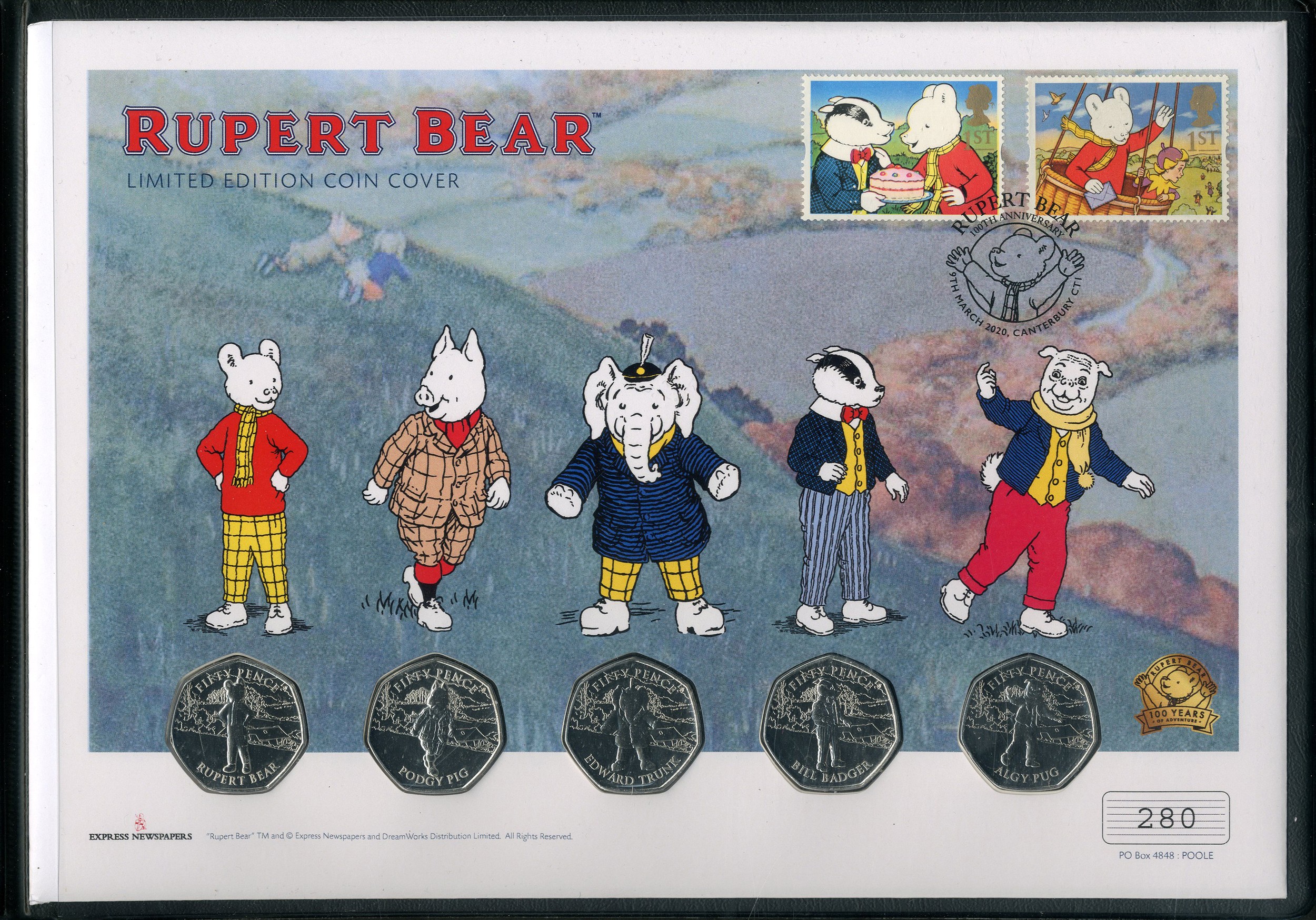 Isle of Man: Elizabeth II, 2020, a Rupert Bear coin cover containing 5 x different 50 pence coins, in Westminster folder, with certificate. All BU (5 coins)