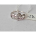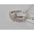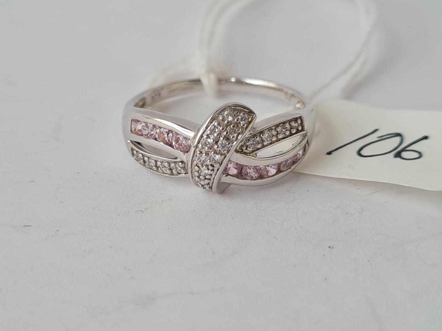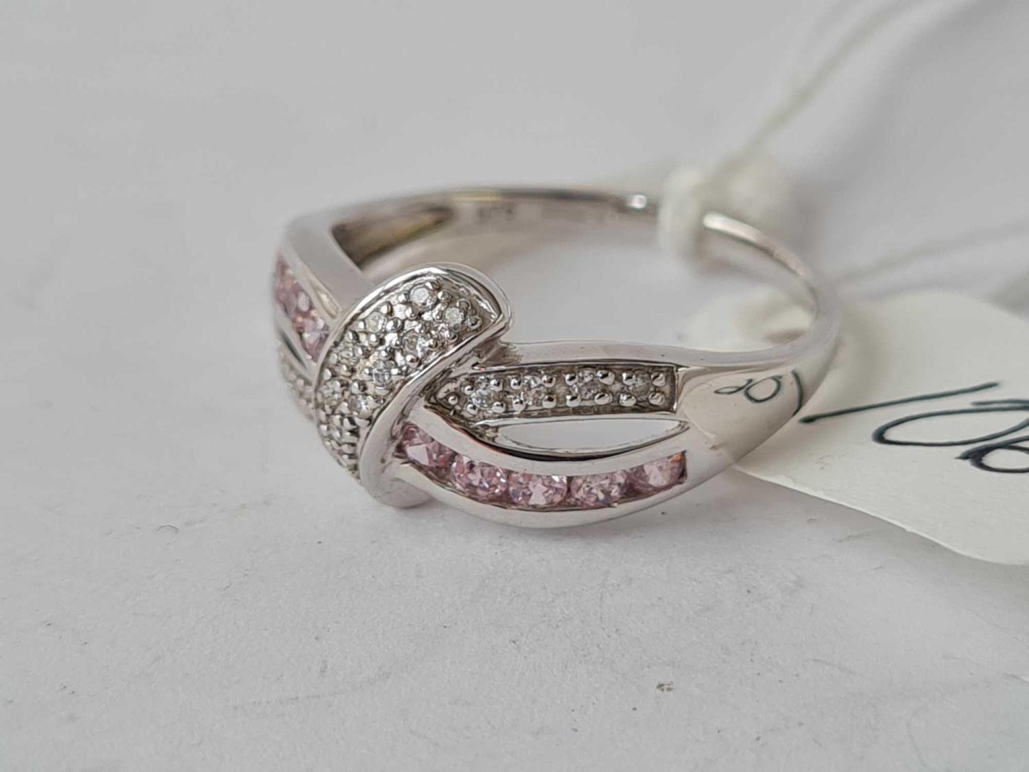 A pink & white stone 9ct white gold ribbon design ring size O 2.4g inc