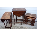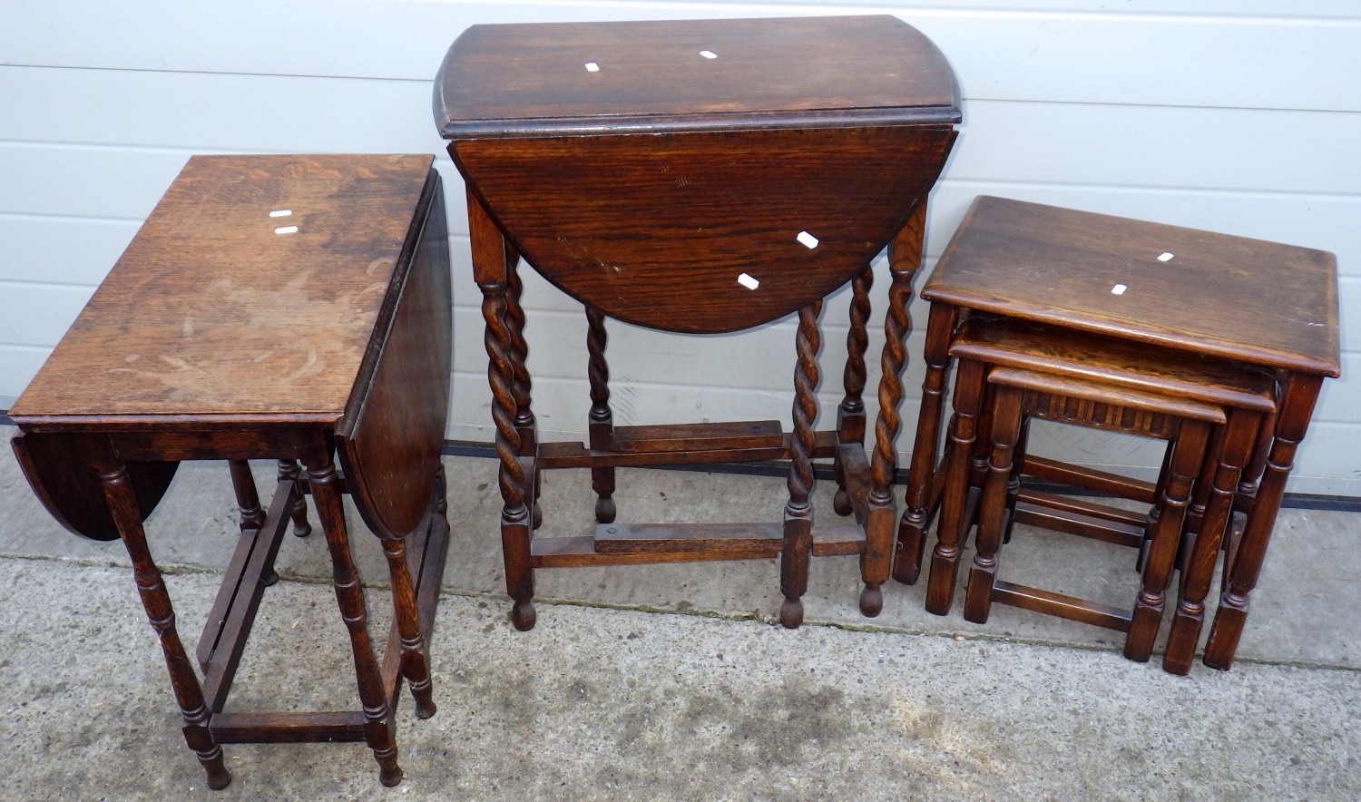 An oak nest of occasional tables, small barleytwist gateleg table and another drop leaf table (3)
