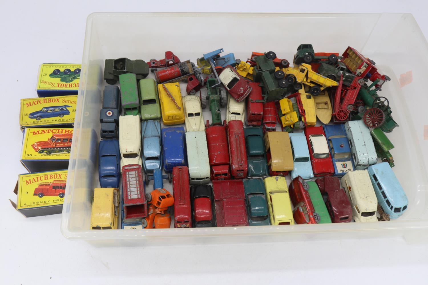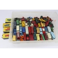 Large quantity of mostly Lesney diecast vehicles including 3 empty boxes and a boxed Lesney fire engine, all with varied levels of playware