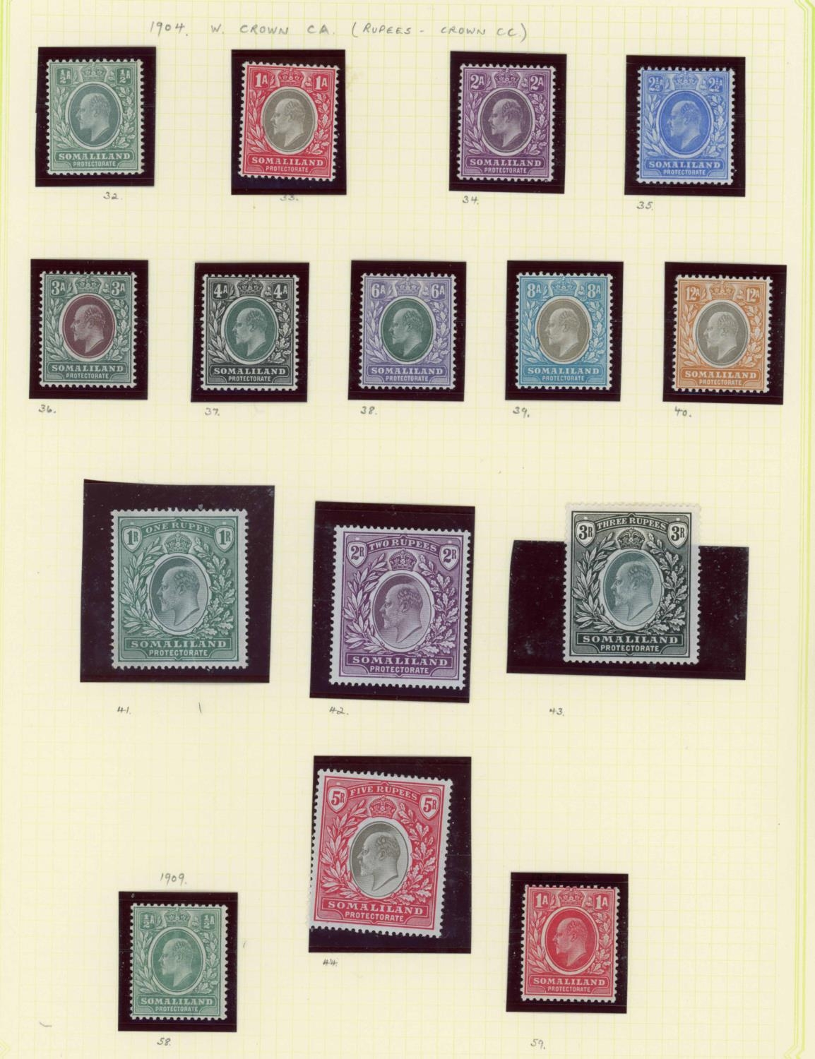 QV-KGV BRITISH EMPIRE MINT MISCELLANY: Exclusively mint range of sets & part sets from a range of mainly African countries i.e. British East Africa 1890-94 set to 5r (less 8a & 1r grey), 1896-1901 range of 10 values to 8a SG 65/74; Somaliland Protectorate 1904 set to 5r SG32/44 plus 1909 half anna & 1a; Nyasaland various 1897-1901 values to 6d or 1/-, 1903-04 values to 1/- & 1908 values to 2/6d; KUT KGV pictorial set to 5/- SG 110/121; East Africa & Uganda 1907-08 set of 9 values to 75c SG 34/42; Rhodesia 'Arms' types various vals. between SG 22-72; Ascension KGV pictorials to 1/- SG 21/28; St. Helena QV 1884-94 surcharge group of 9, 1890 keyplate set of 7 to 10d SG 46/52, 1903 KEVII pictorials to 2/- SG 55/60 plus later keyplate trio SG 64/67. Also, a range of 22 Egypt 'Pyramid' types, 1879-1906. Fine, fresh, mostly lightly mounted assembly. Total cat. value c.£1,750+ (c.150) Cross Reference: NYASALAND/MALAWI, SOMALILAND PROTECTORATE, ST. HELENA, EGYPT