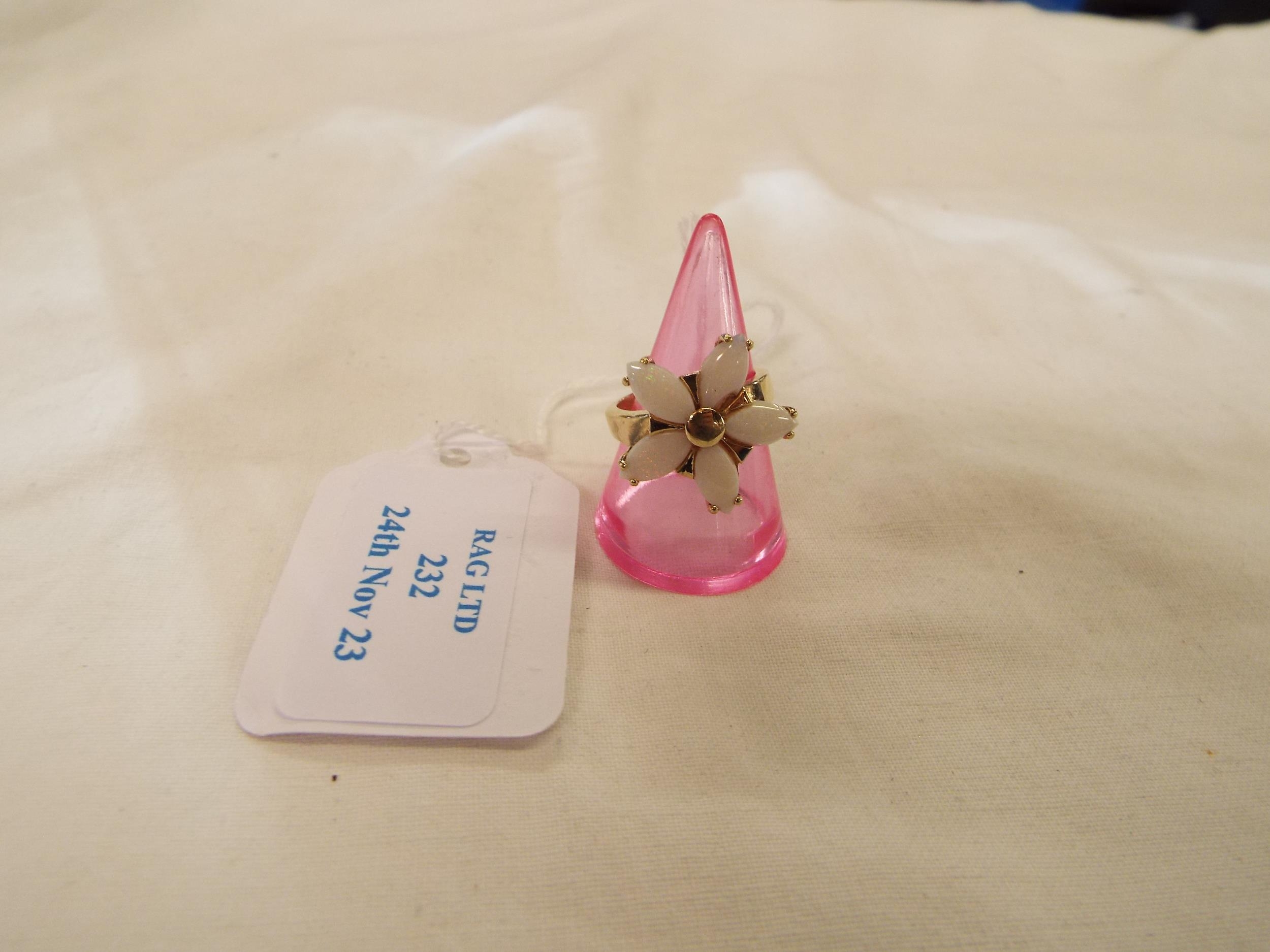 A 9ct gold flower design ring inset with mark cut natural Australian opals, size N