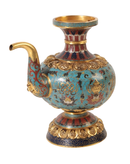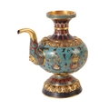 A CHINESE CLOISONNE TIBETAN STYLE EWER with finely chased gilt-bronze mounts and a scrolling spout, the body decorated with precious objects, auspicious symbols and stylised lotus surrounded by leafy tendrils on a turquoise ground, with formalised borders, early Qing or later, 20cm high