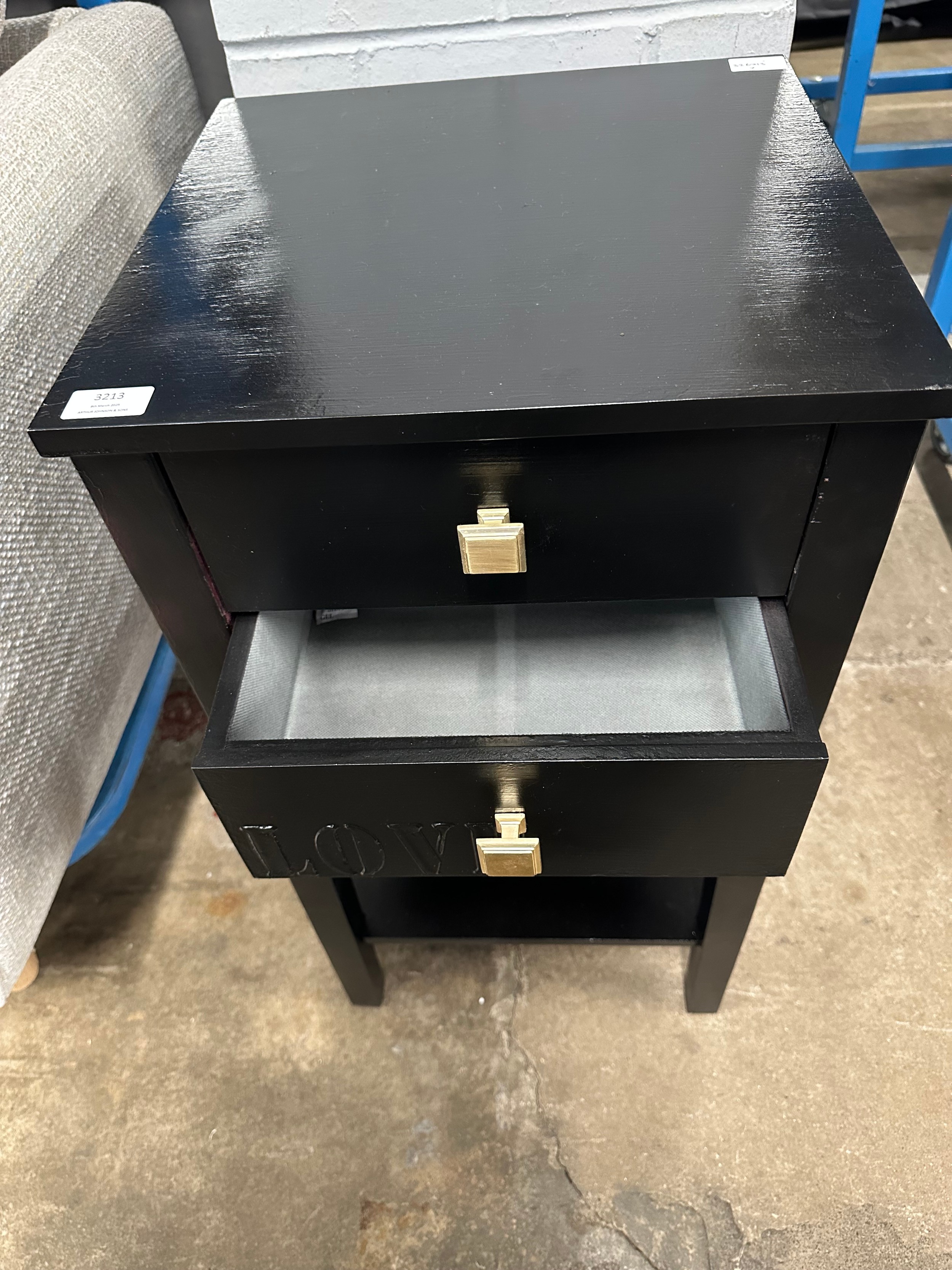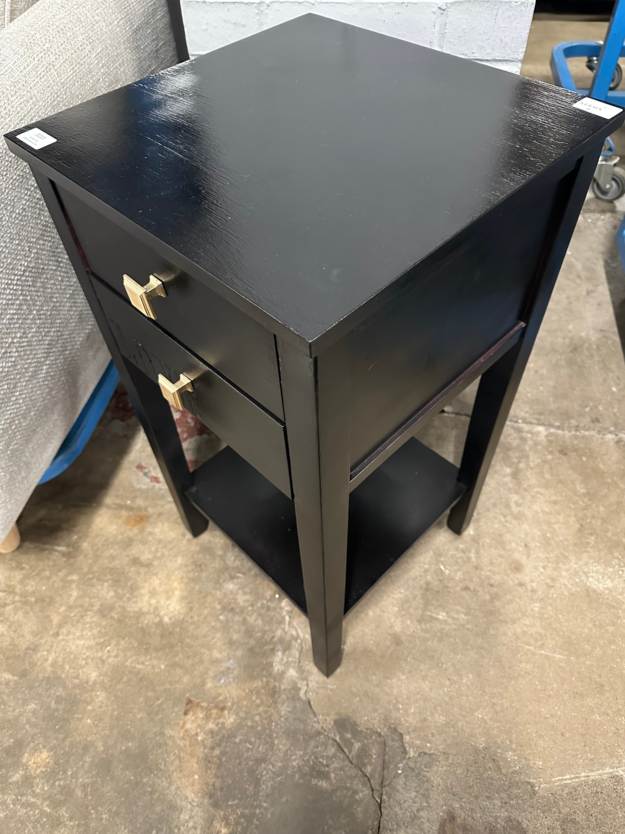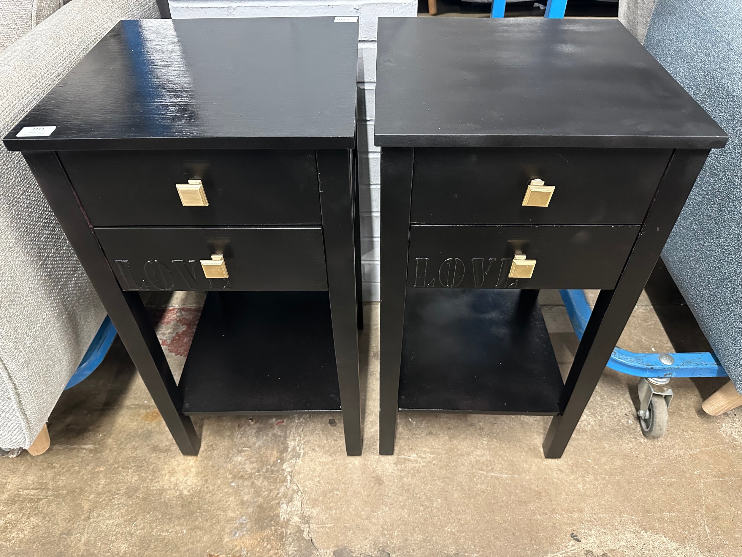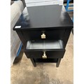 A pair of black two drawer bedside tables