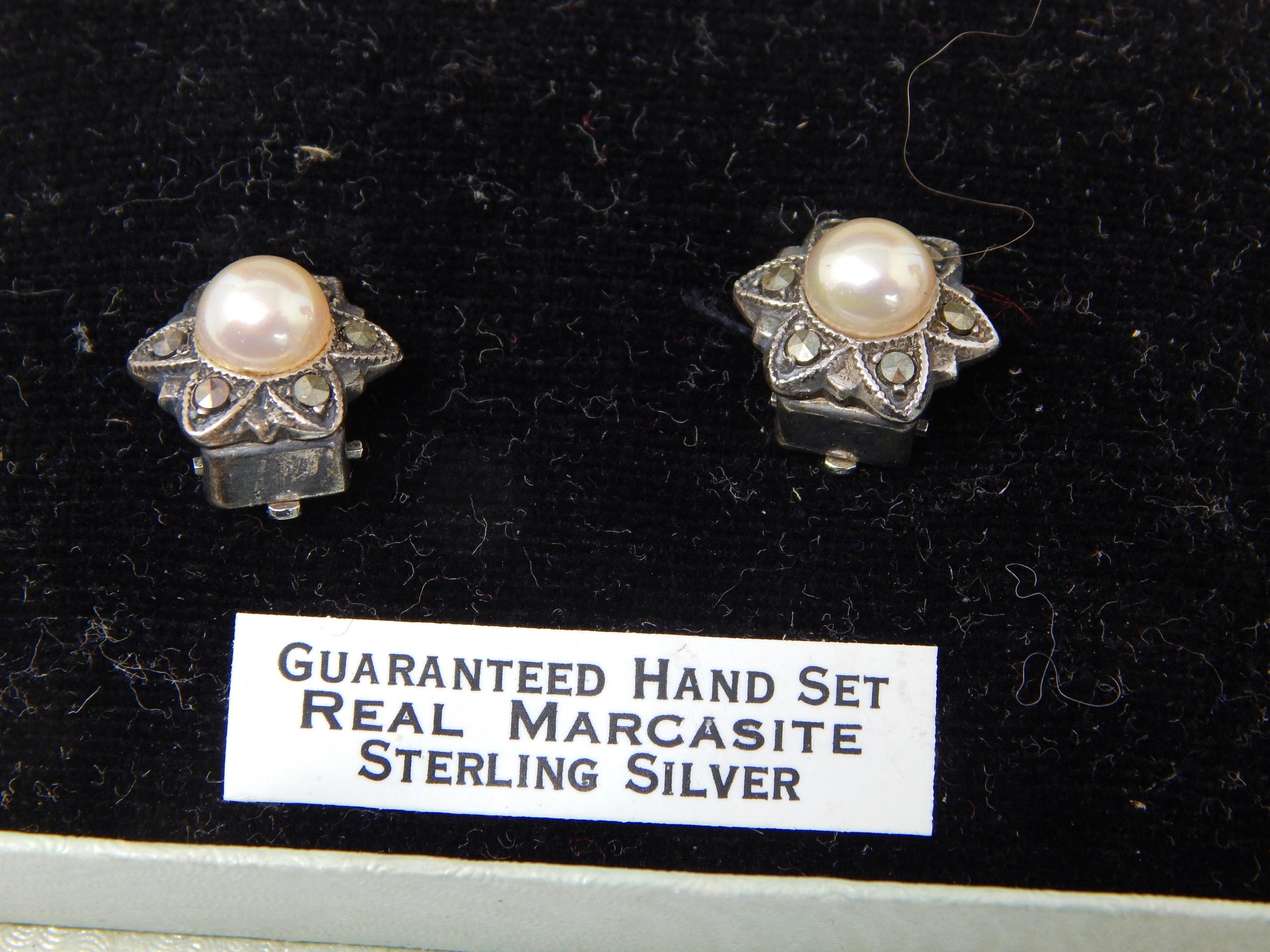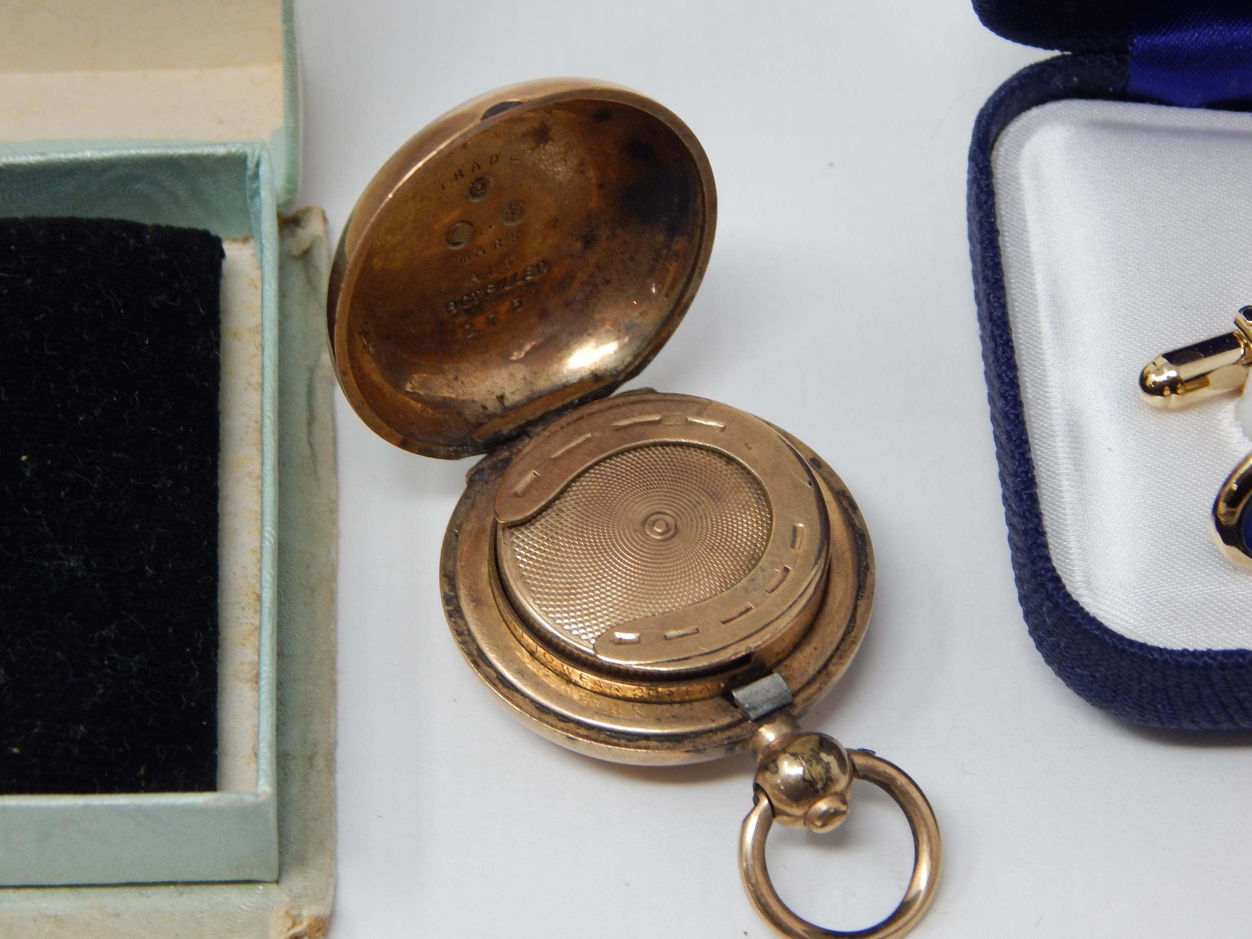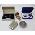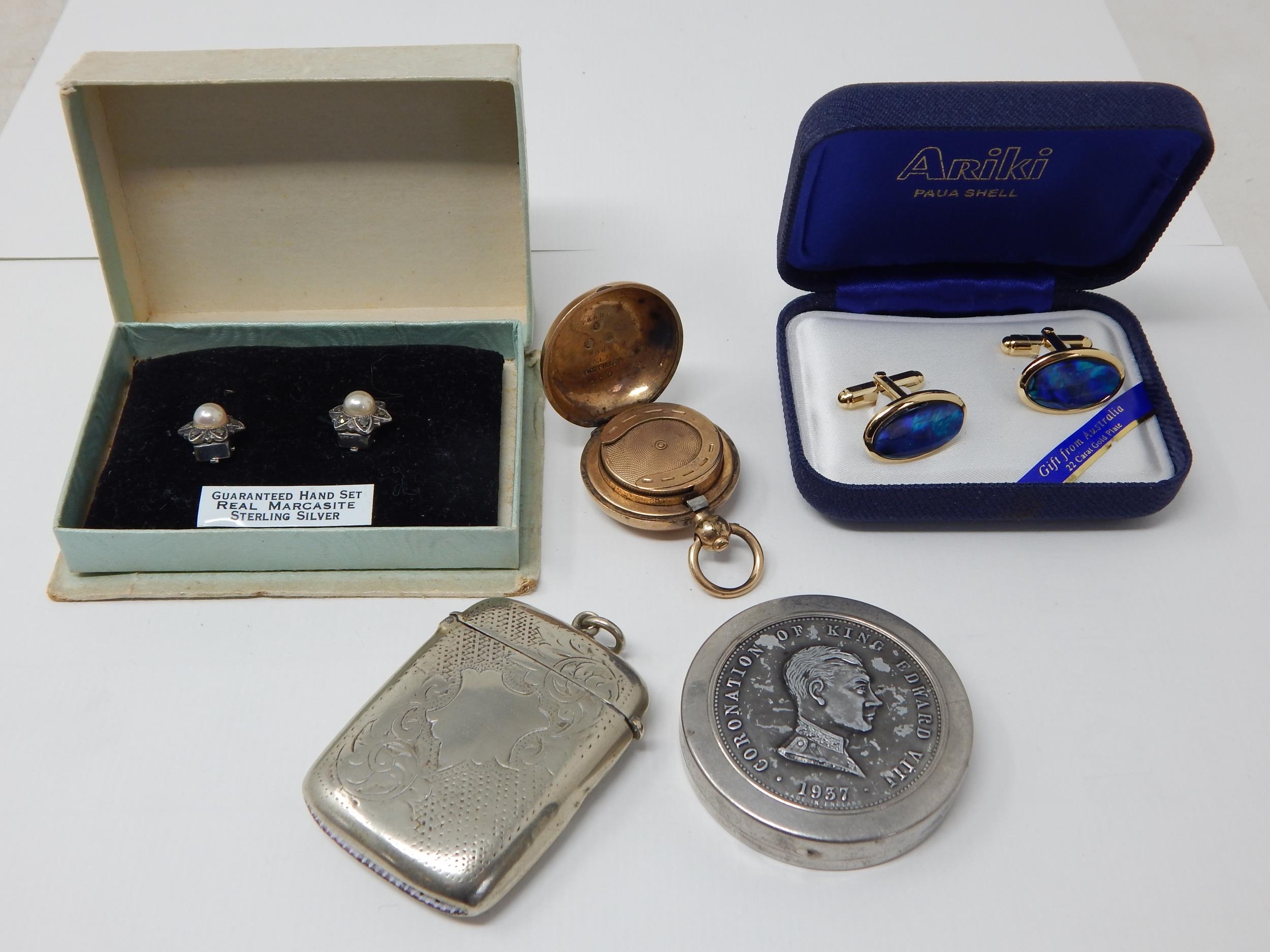 Gold Plated Sovereign Holder: Silver & Marcasite Earrings: 22ct Gold Plated Shell Cufflinks: Plated Vesta Case & a King Edward VIII Coronation Compact.