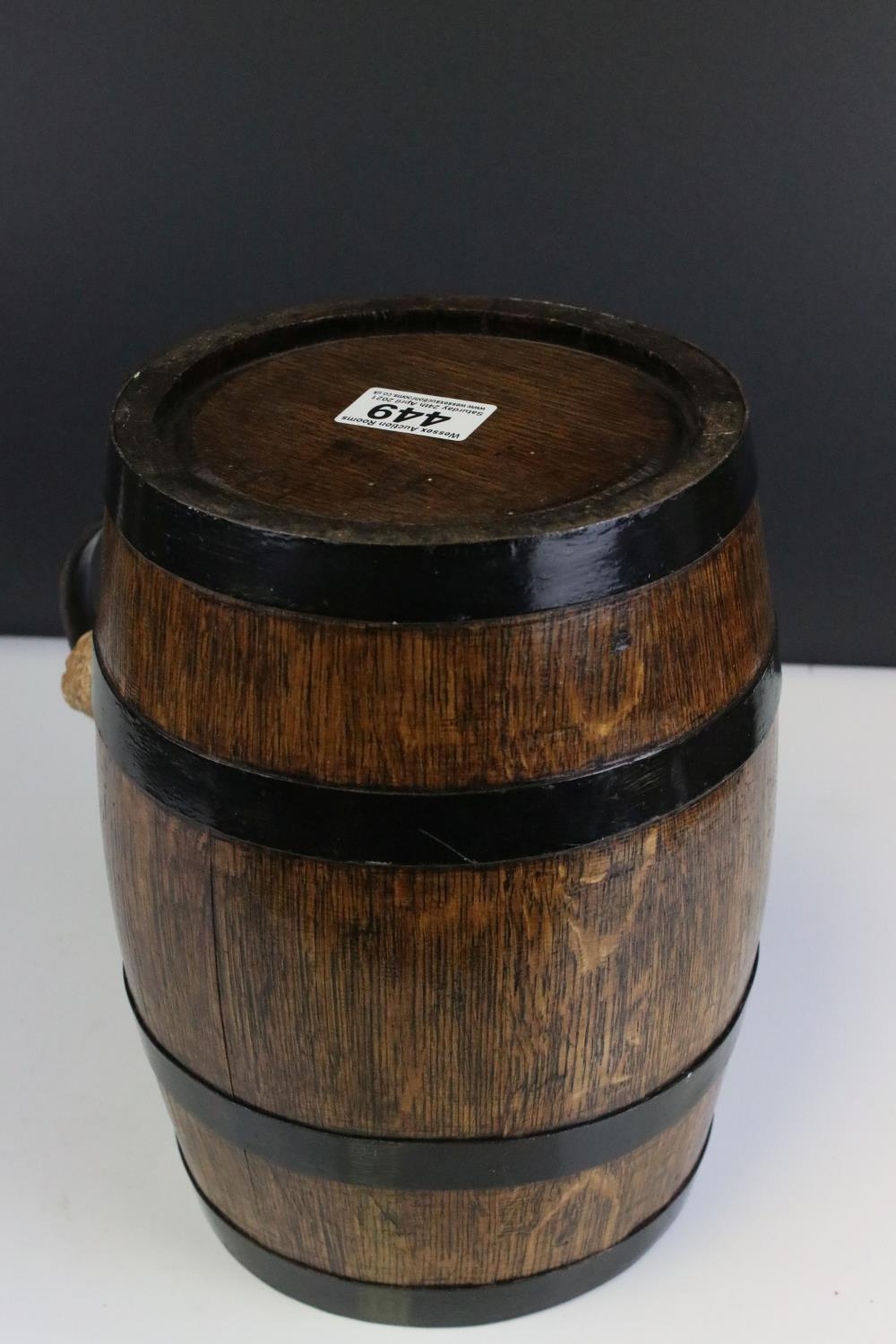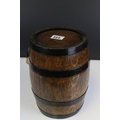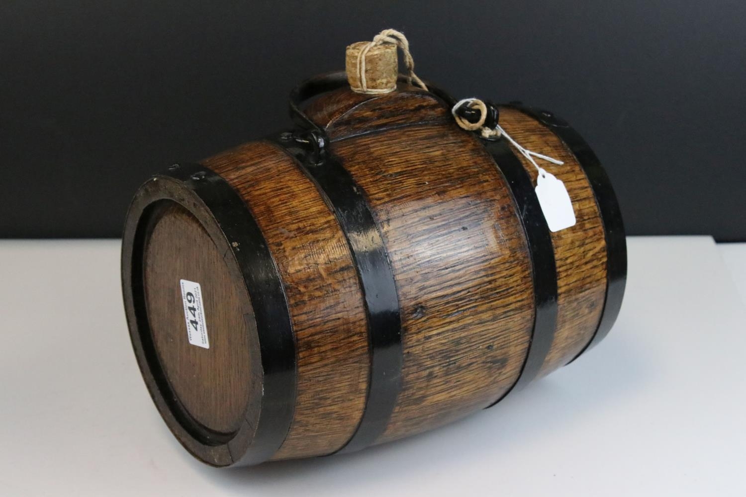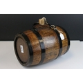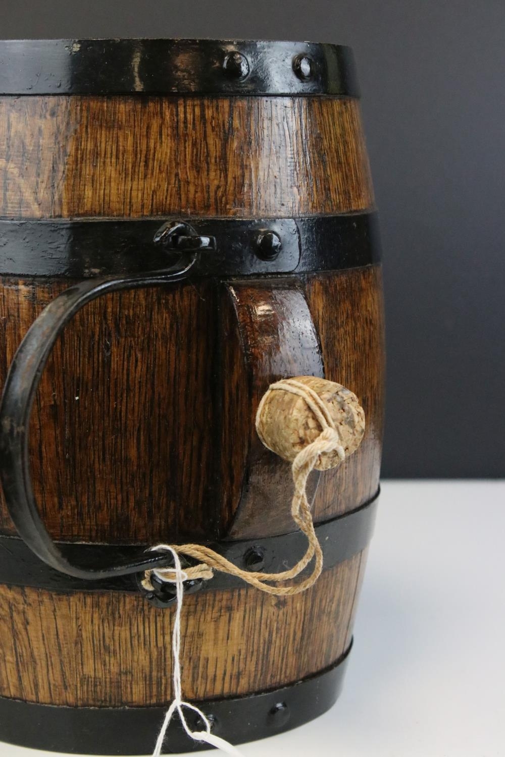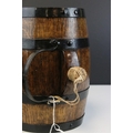 Oak and metal banded barrel with handle and cork stopper