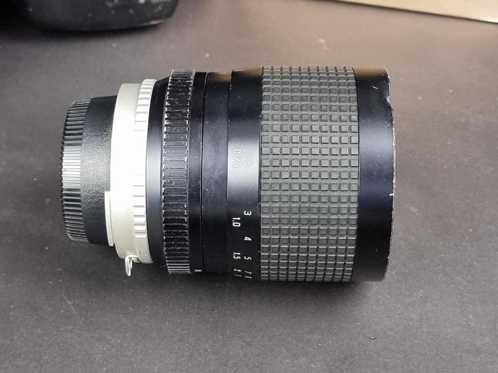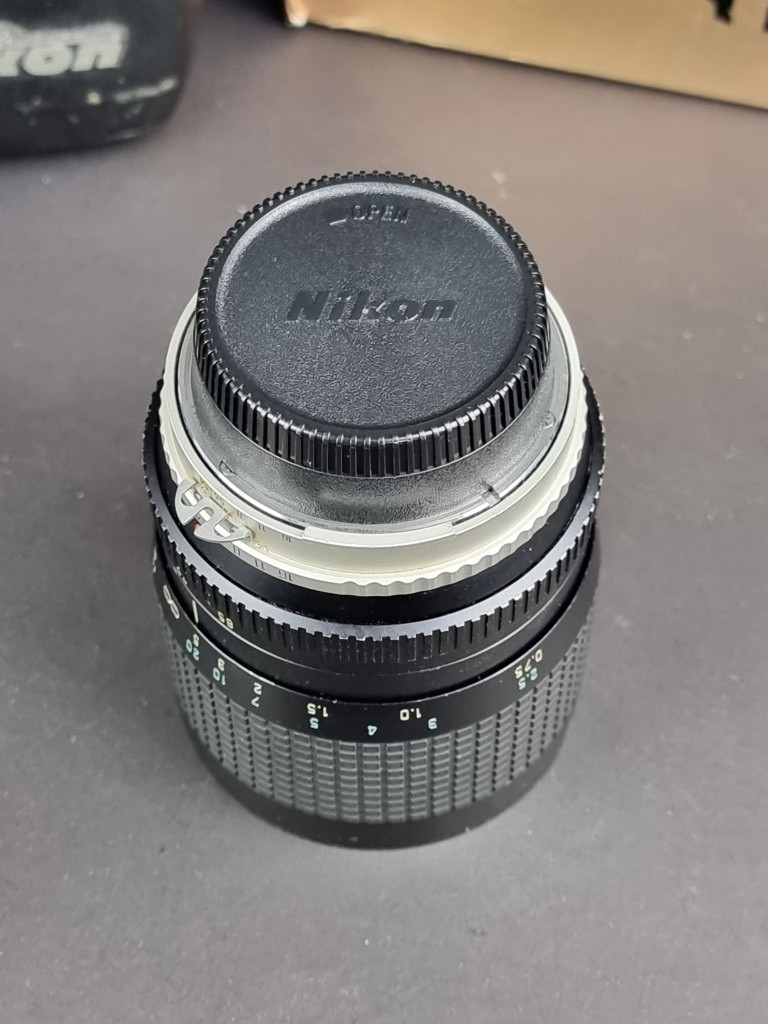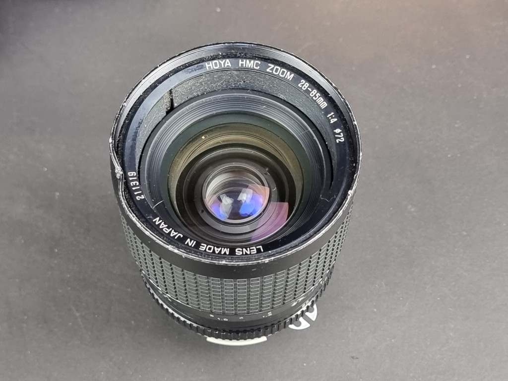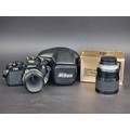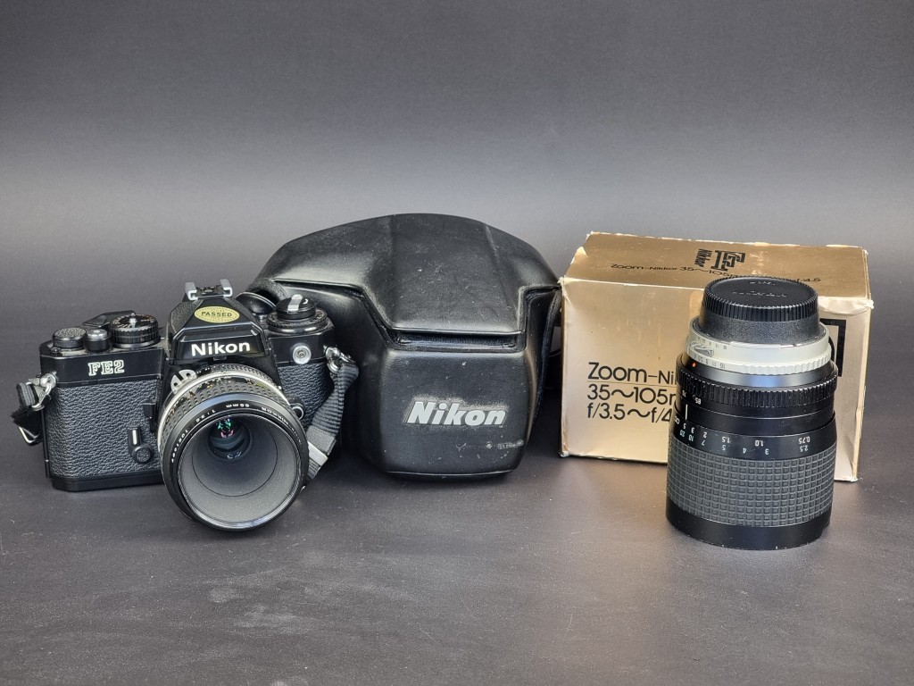 Cameras: a Nikon FE2 with Micro-Nikkor 55mm 1:3.5 lens; and a Hoya HMC 28-55mm 1:4 lens, box associated.