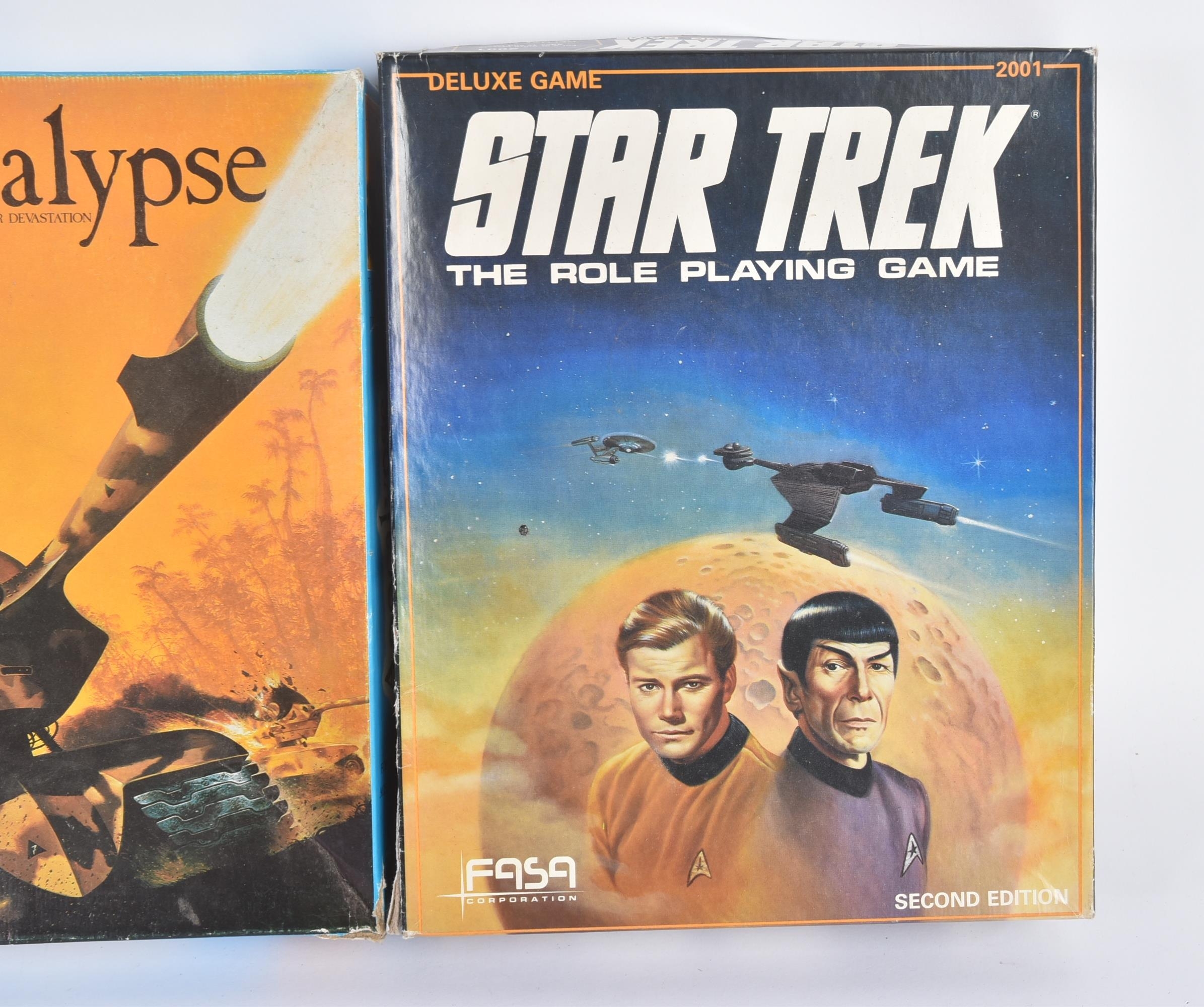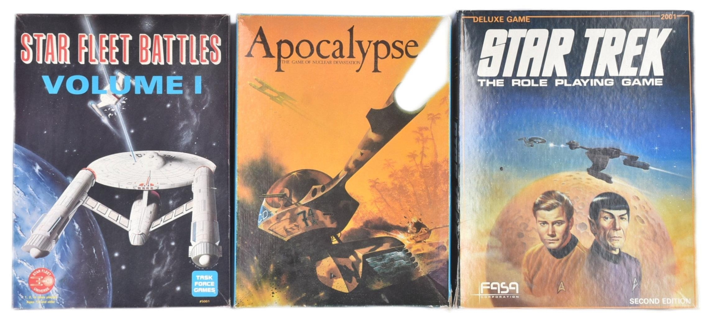 A collection of x3 vintage fantasy role play board games comprising; Star Trek ( Second Edition ), Star Fleet Battles Volume 1 and Apocalypse. All games with original instructions, many unused play pieces but remain unchecked for completeness. Housed within original boxes.