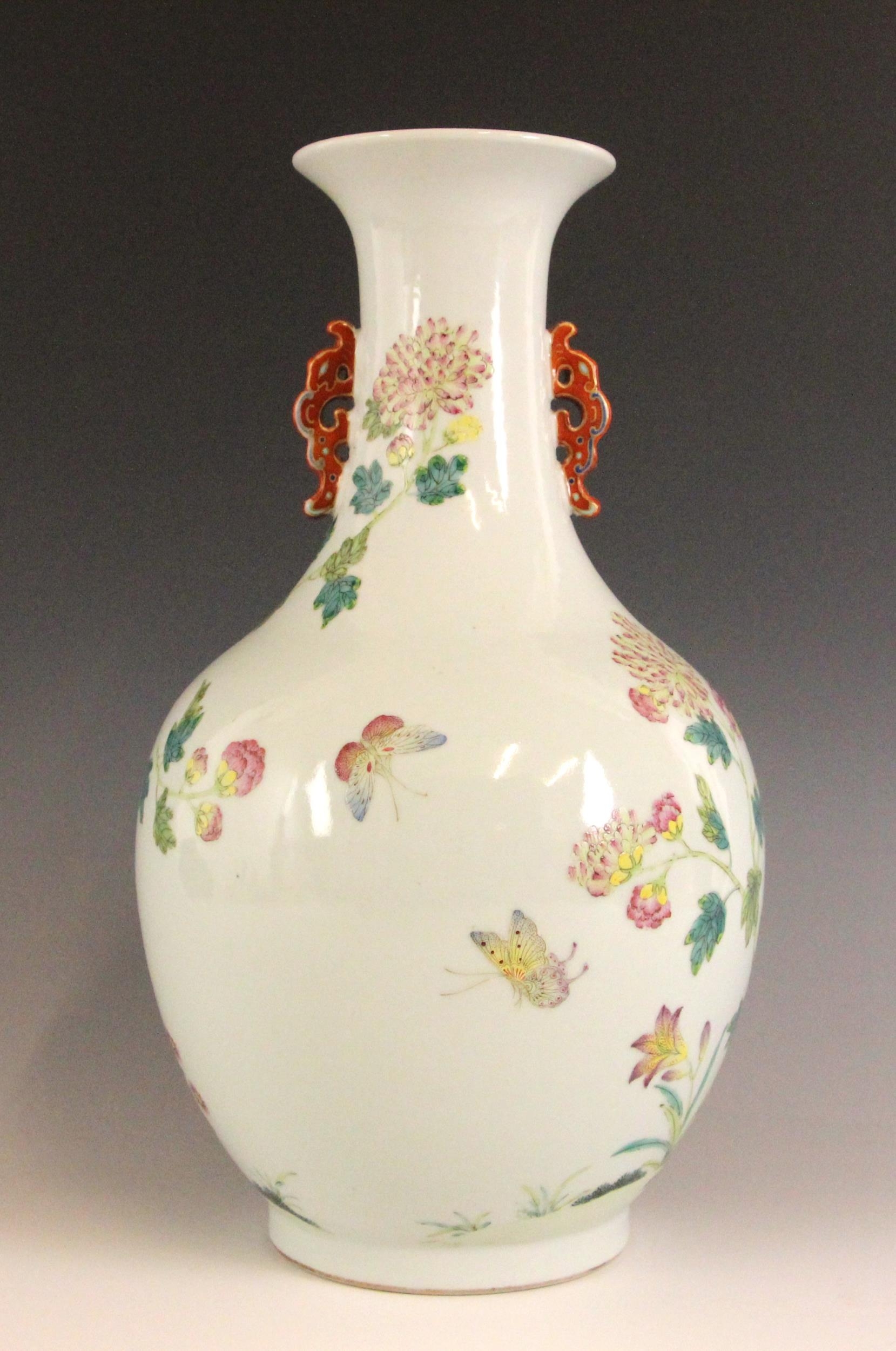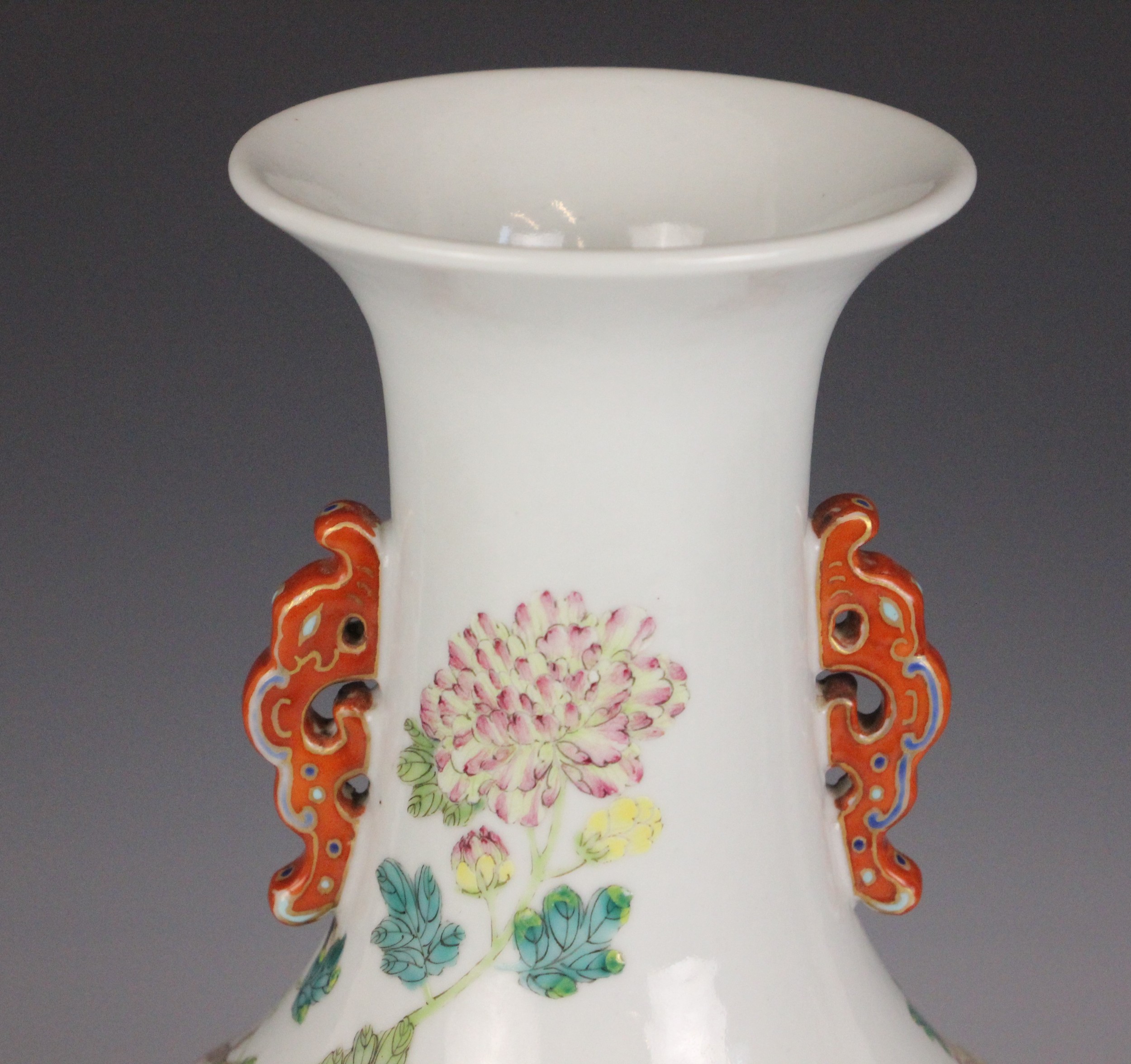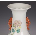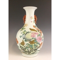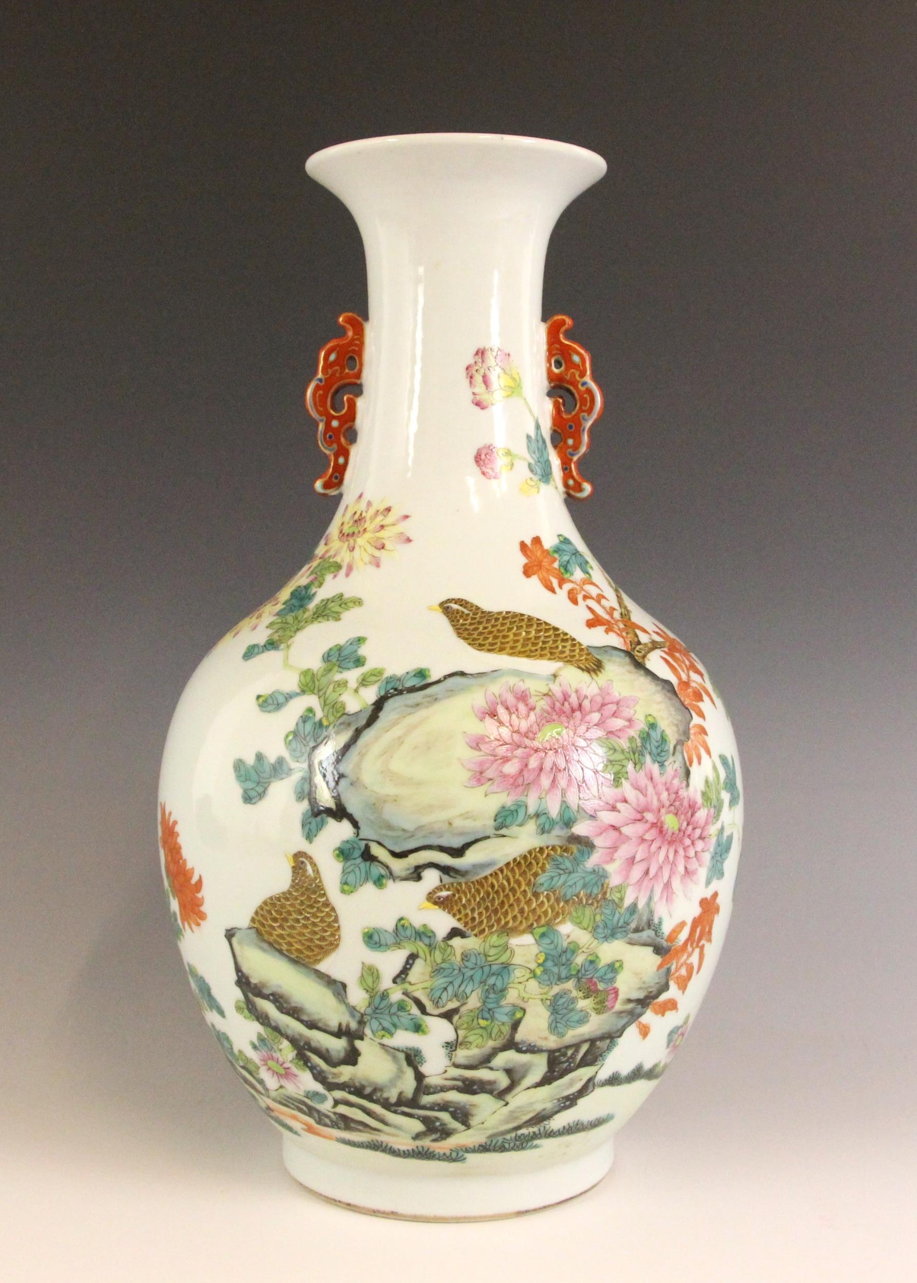 A Chinese porcelain famille rose vase, Daoguang character mark, the begonia shaped vase with two ruyi shaped lugs flanking the neck, decorated with quail, flora and fauna, iron-red four character mark to the underside, 30.5cm high