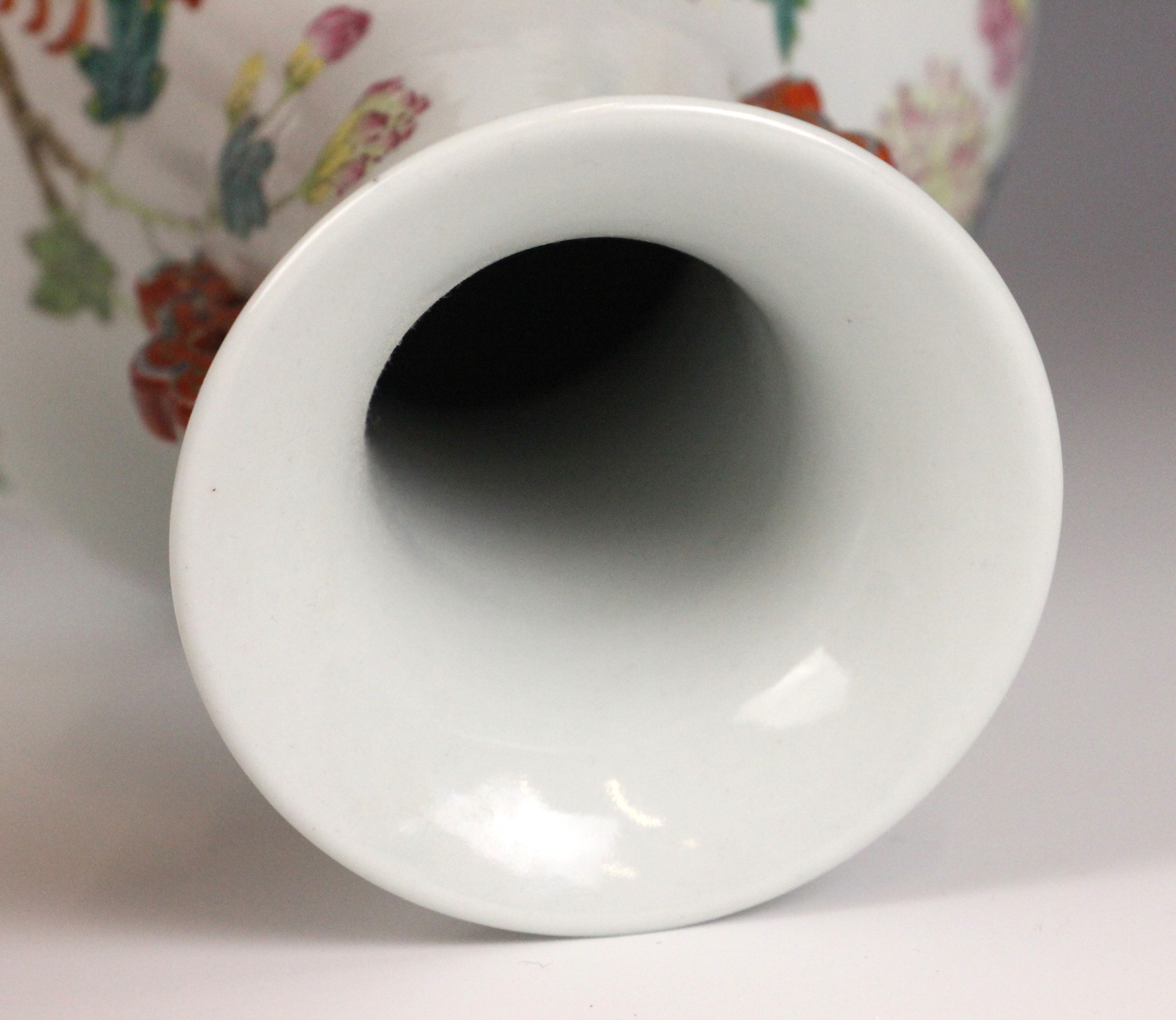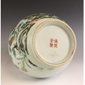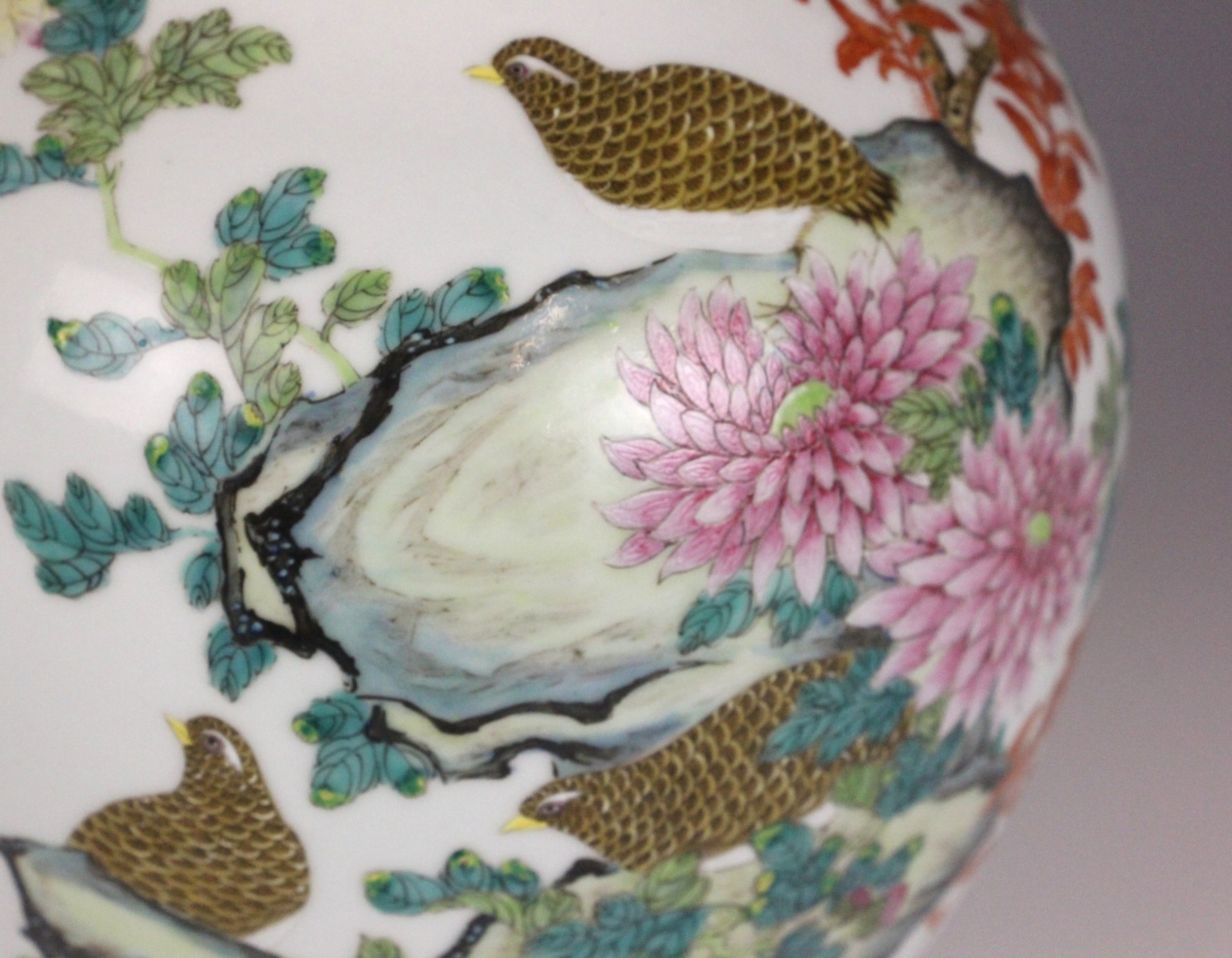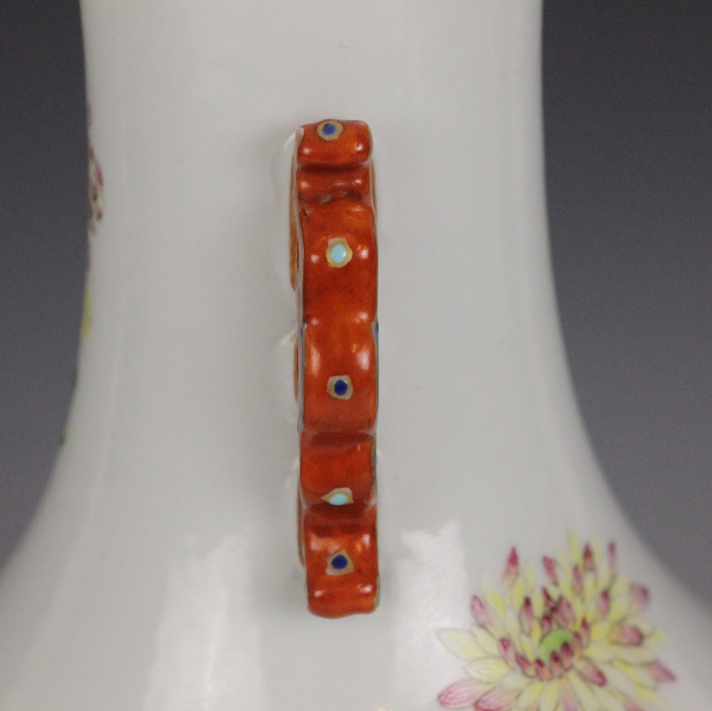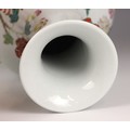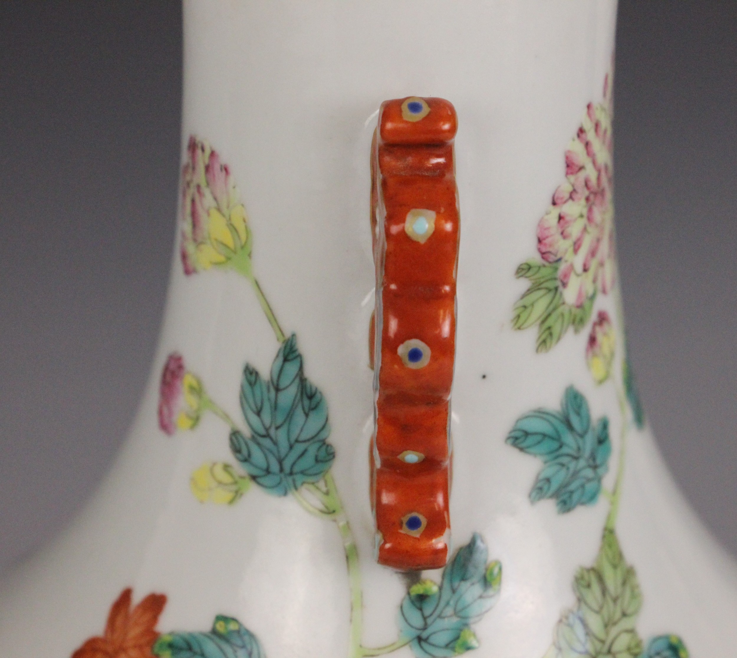 A Chinese porcelain famille rose vase, Daoguang character mark, the begonia shaped vase with two ruyi shaped lugs flanking the neck, decorated with quail, flora and fauna, iron-red four character mark to the underside, 30.5cm high