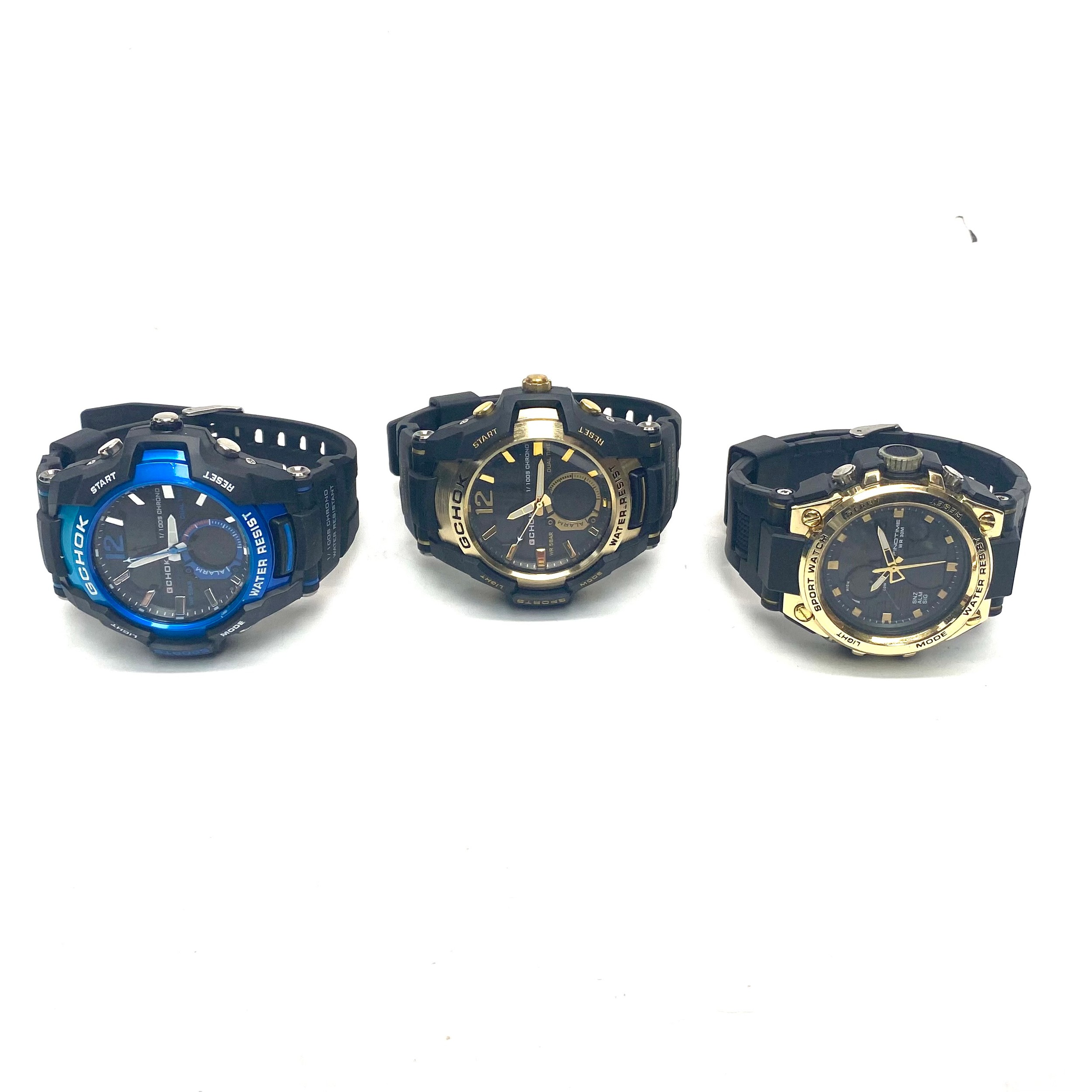 Two GCHOK WR 5 BAR Sport Watches, featuring dual large faces at 6cm, and a Finotime sports watch. (all running).
