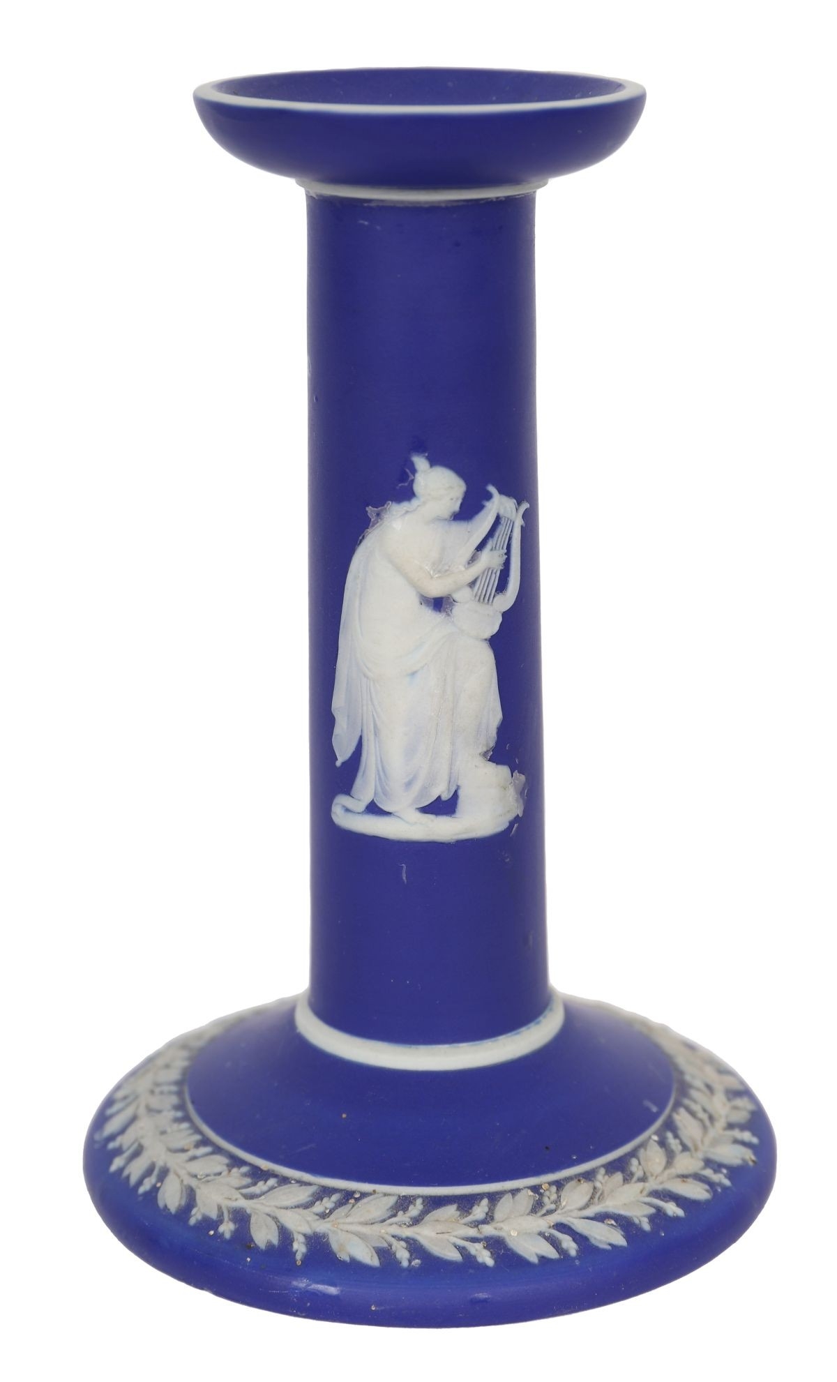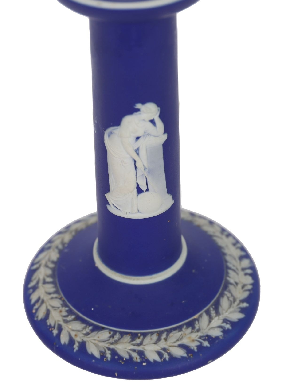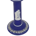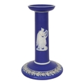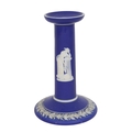A Wedgwood jasper blue candlestick with applied white classical relief decoration to the column and base. CERAMICS 15 cm. high Tuesday 10th March 2026 11:58:26