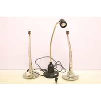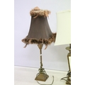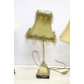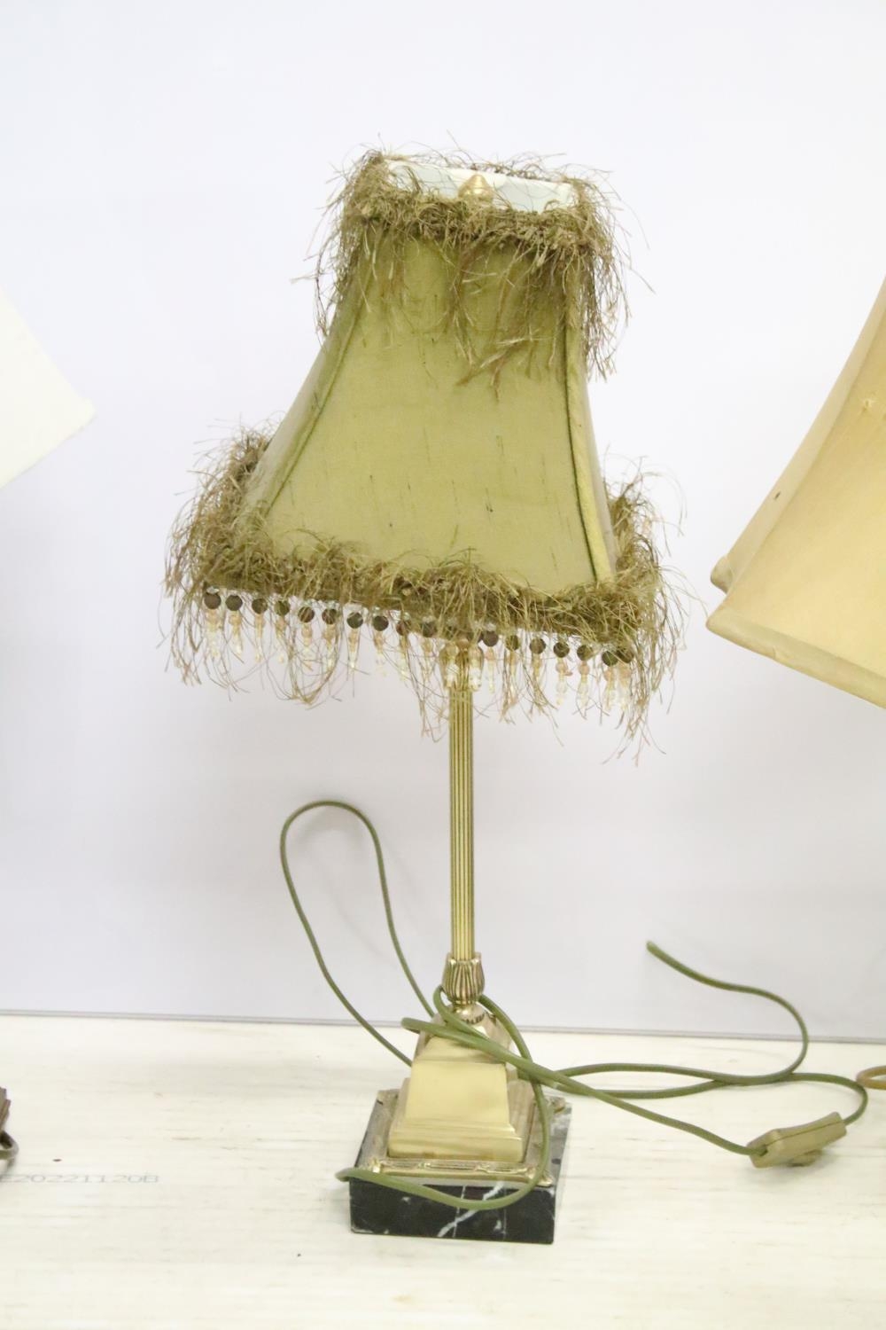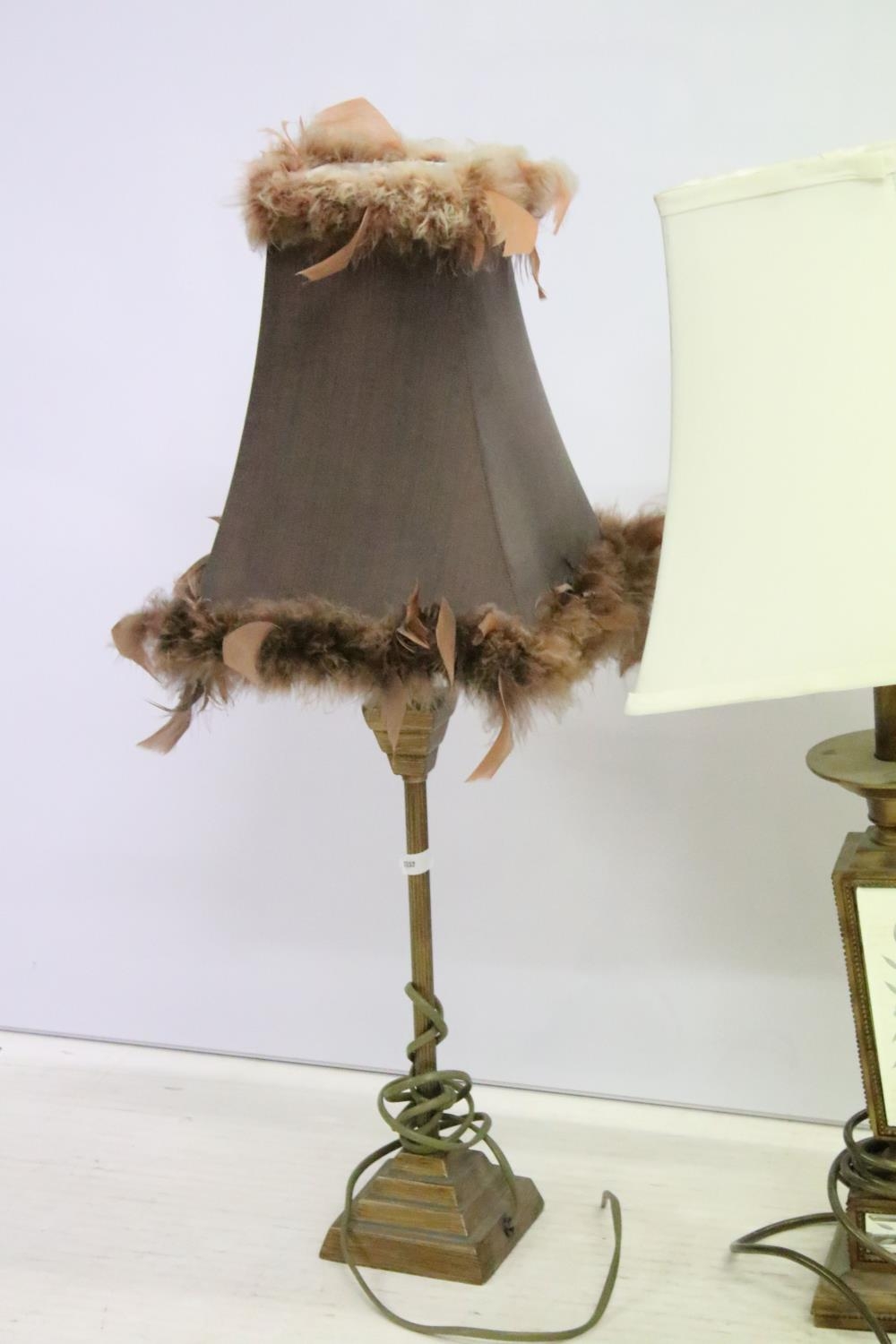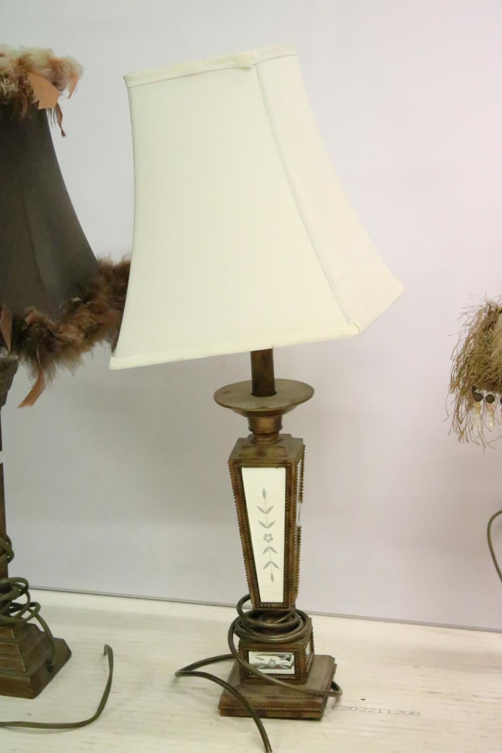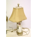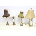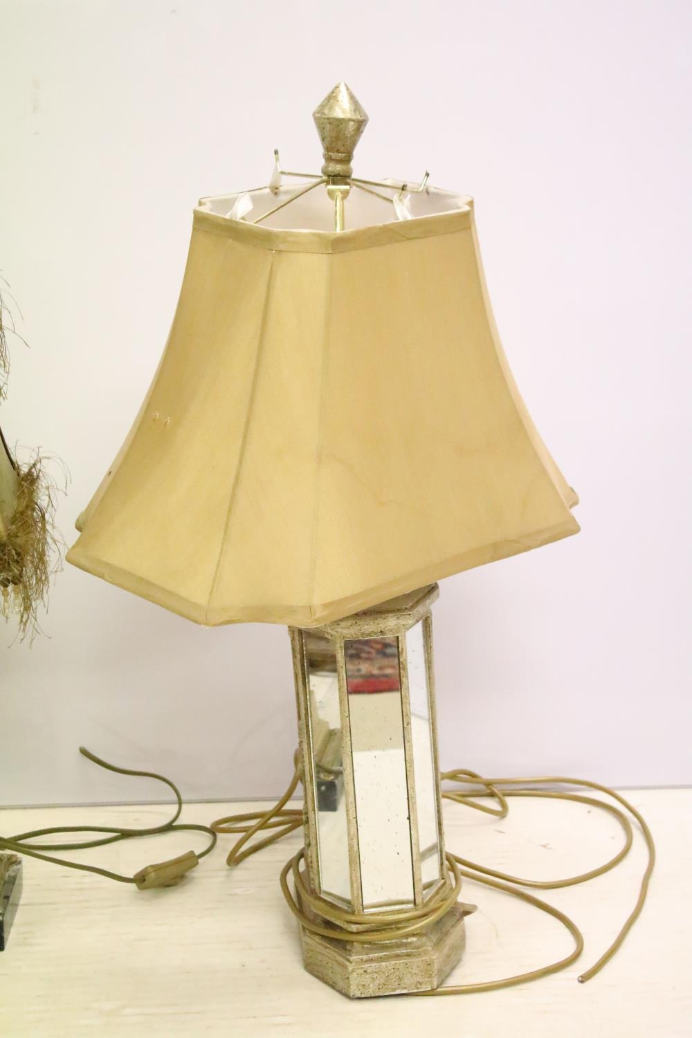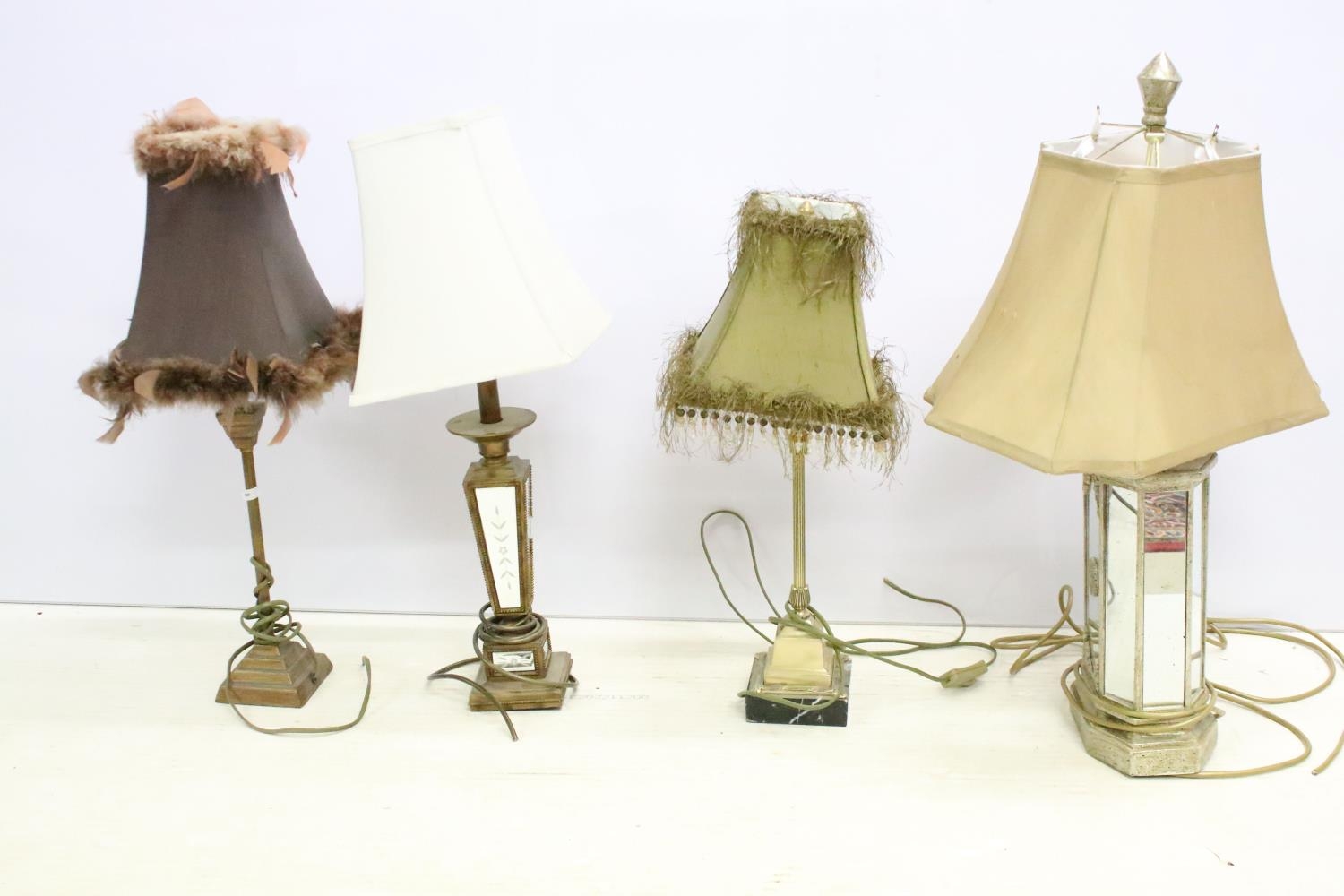 Group of four vintage style table lamps to include a table lamp with bevelled glass floral mirror panels, a further mirrored lamp, and two with reeded column supports, each lamp complete with shade. Tallest approx 70cm (overall size)