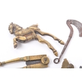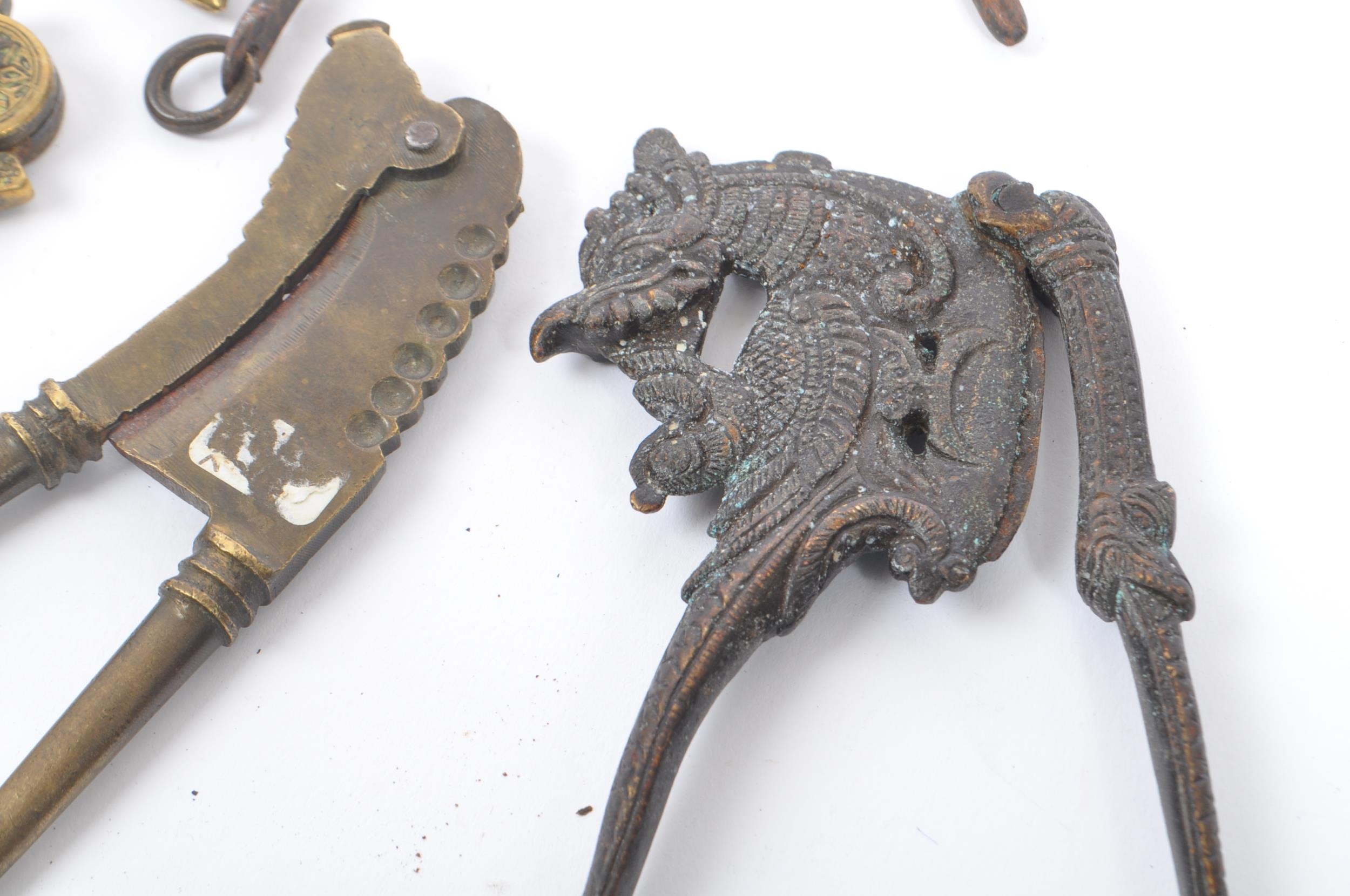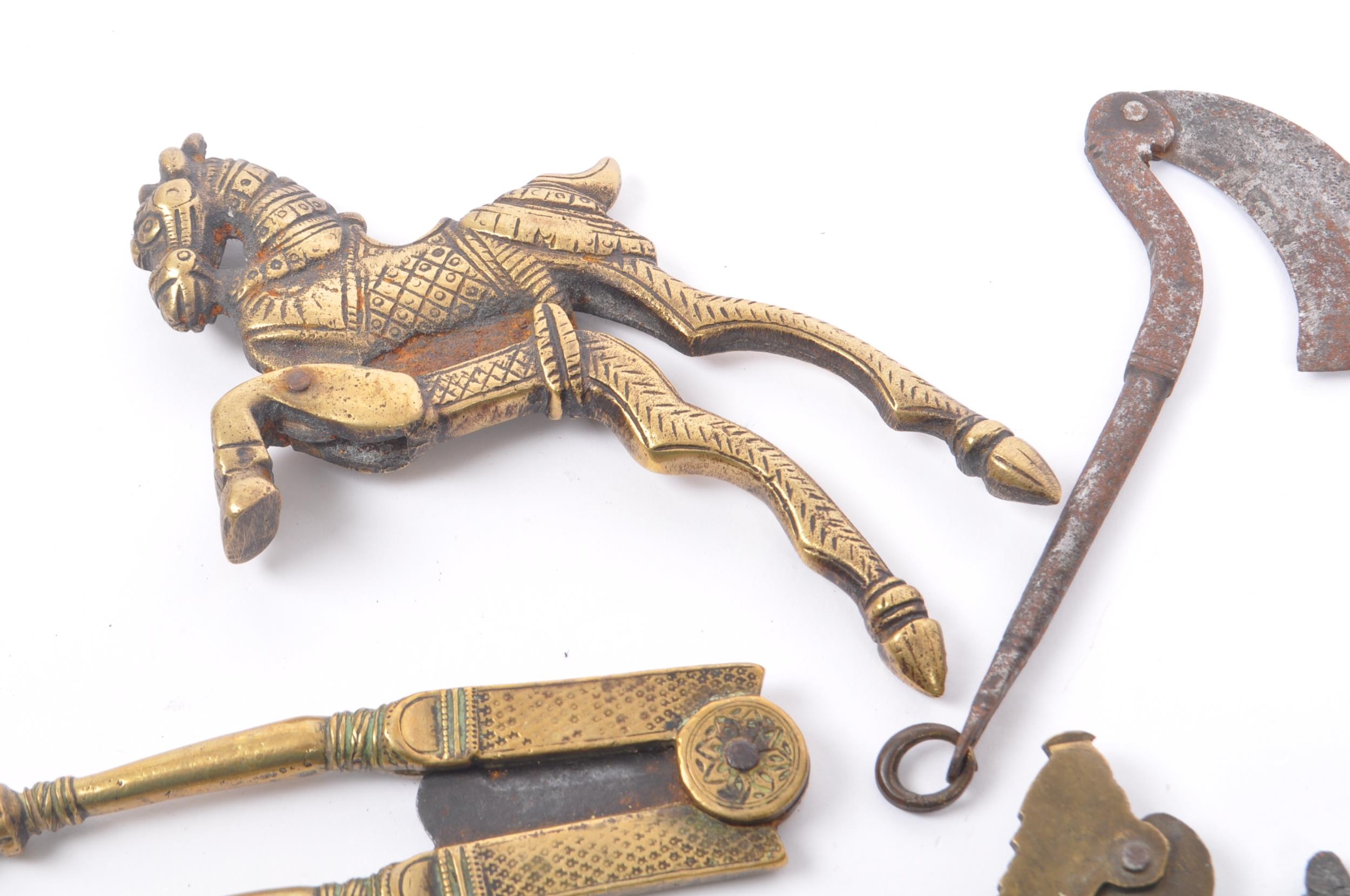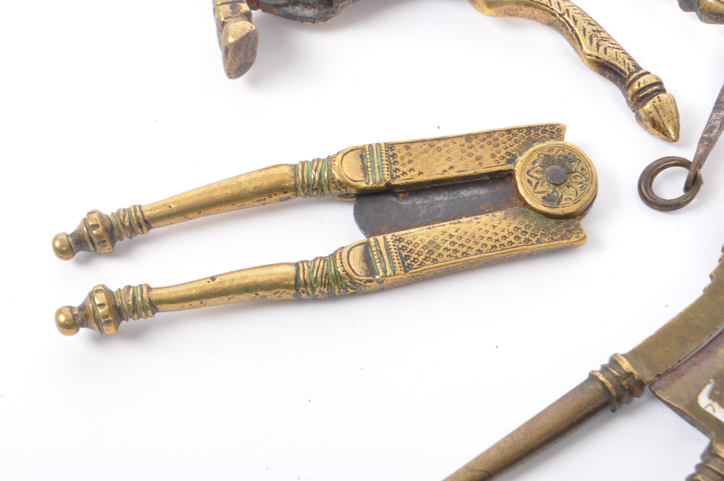 A collection of 19th century & early 20th century Indian brass & bronze betel areca nut crackers. To include figurative dragon and horse examples and other decorative engraved examples. Measures 16cm length approx.