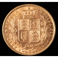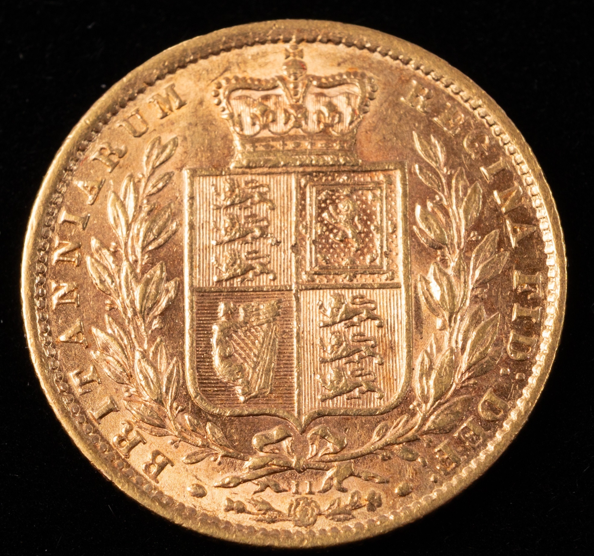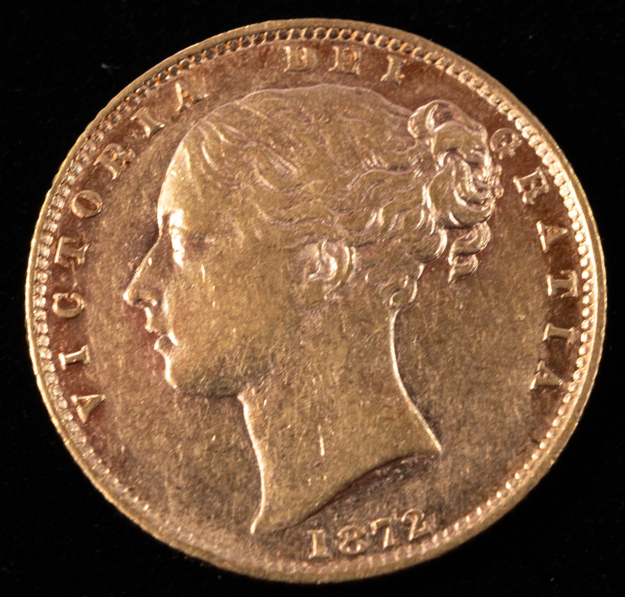 Gold Coins: Victoria shield back sovereign-young head 1872, Die number 11, 22ct bullion weight 8g.