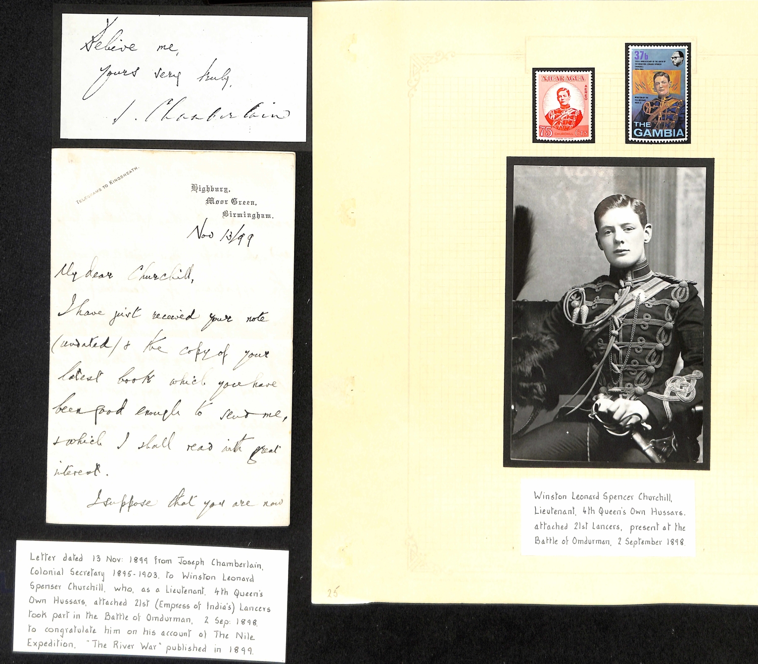 Joseph Chamberlain/Winston Churchill. 1899 (Nov 13) Four page letter written and signed by Joseph Chamberlain, the Colonial Secretary, to Winston Churchill, thanking him for a copy of his latest book "The River War", and referring to the Boer War - "I suppose that you are now once more in the thick of things & I hope you will have the opportunity of describing the most interesting state of the present conflict. Up to the present time it has proceeded very much as I expected when I saw you last, except that we have held our own better than I hoped & the conduct of the troops has exceeded even the most sanguine anticipations. I imagine that you will not find many of your contemporaries to whom it has been given to witness & report the exploits of British arms in such different circumstances as those in the North West Frontier, Egypt & the Transvaal".